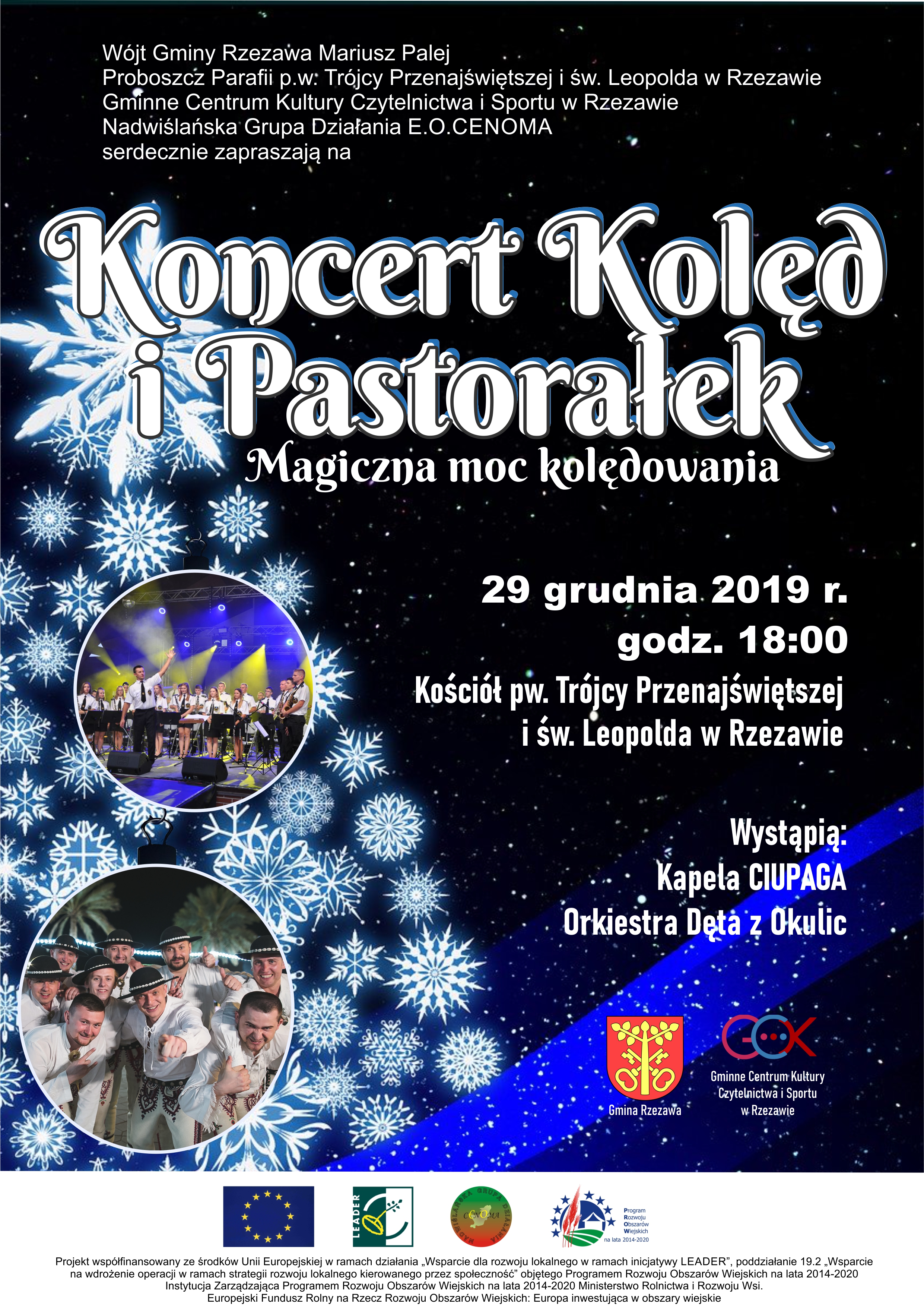 Wójt Gminy Rzezawa, Proboszcz Parafii pw. Trójcy Przenajświętszej i św. Leopolda w Rzezawie, Gminne Centrum Kultury, Czytelnictwa i Sportu w Rzezawie oraz Nadwiślańska Grupa Działania E.O.CENOMA zapraszają na Koncert Kolęd i Pastorałek. Wspólne kolędowanie z kapelą CIUPAGA oraz orkiestrą dętą z Okulic odbędzie się 29 grudnia 2019 r. (niedziela) o godzinie 18:00 w kościele w Rzezawie.