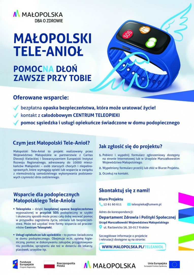 Małopolski Tele-Anioł to nie tylko opaska, ale także pomoc w domu dla najbardziej potrzebujących – osób samotnych i tych, którym rodzina nie może zapewnić opieki. Projekt Małopolski Tele-Anioł, to największe przedsięwzięcie tego typu w Polsce. Całkowity koszt projektu to ponad 38 mln zł, z czego blisko 32,5 mln zł stanowią środki unijne z Regionalnego Programu Operacyjnego Województwa Małopolskiego na lata 2014-2020.
