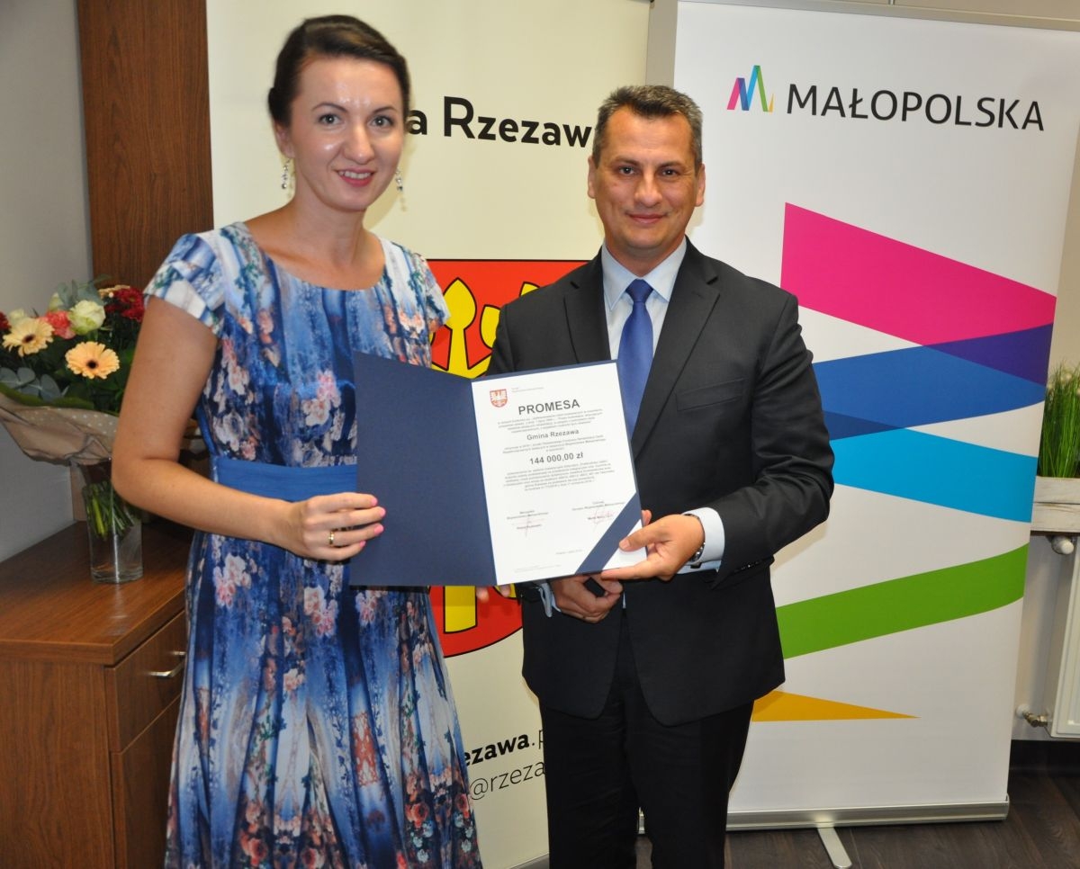 Przystosowanie budynku w Dąbrówce na potrzeby przedszkola integracyjnego będzie kosztować ok. 1,9 mln zł. Gmina Rzezawa na realizację tej inwestycji pozyskała 144 tys. zł z Państwowego Funduszu Rehabilitacji Osób Niepełnosprawnych będących w dyspozycji Województwa Małopolskiego. Wójt Mariusz Palej promesę na realizację tej inwestycji odebrał z rąk Członka Zarządu Województwa Małopolskiego Marty Malec-Lech.