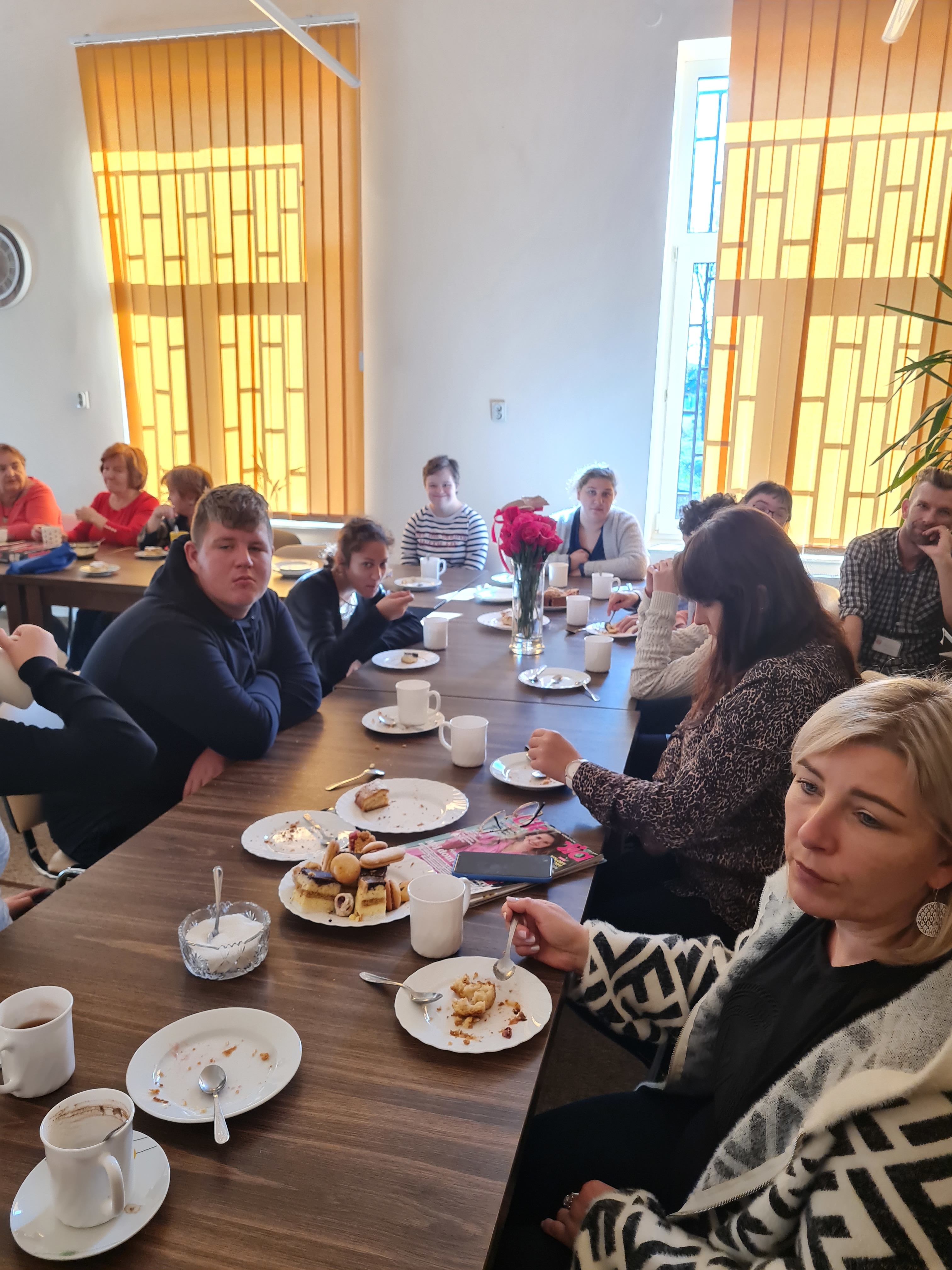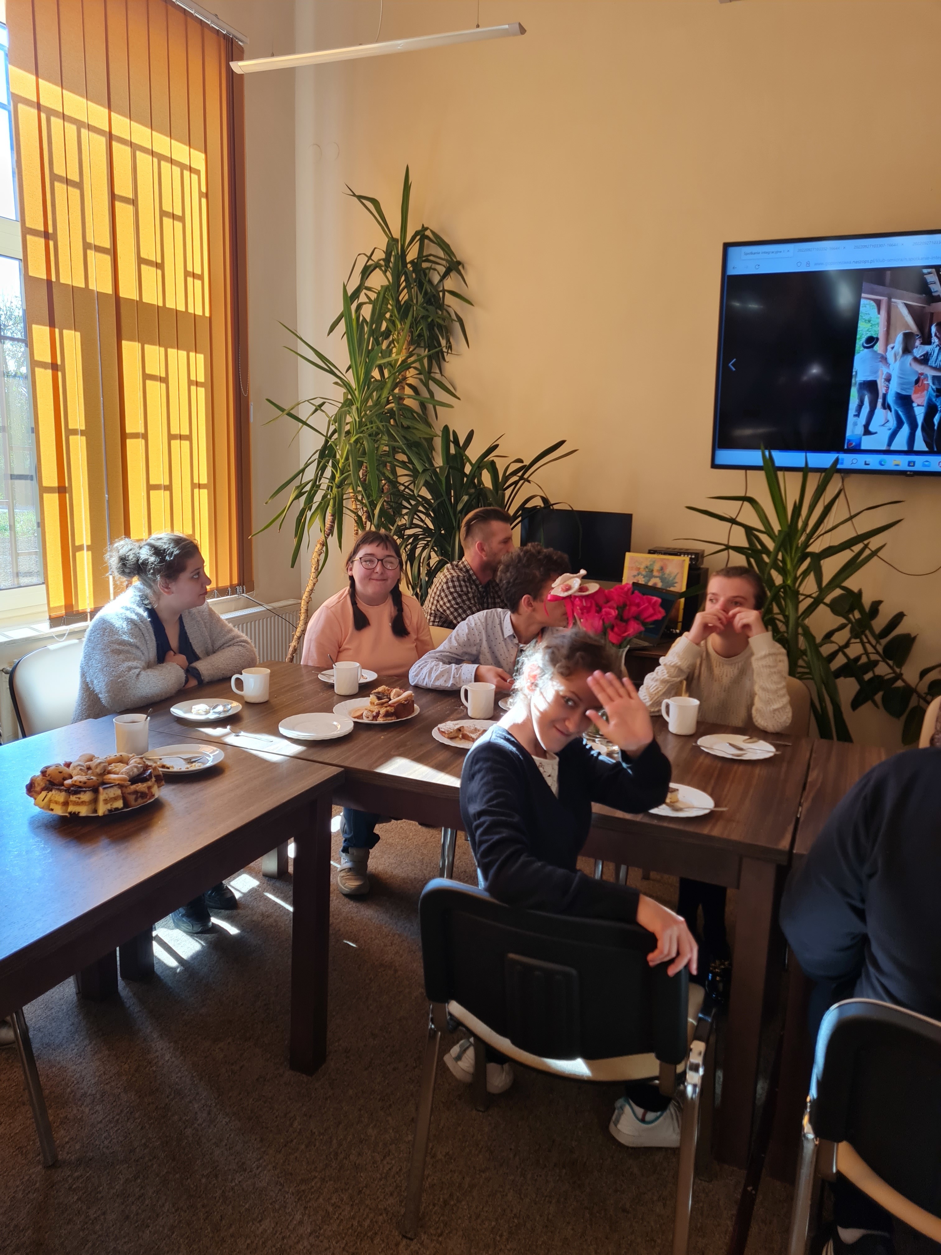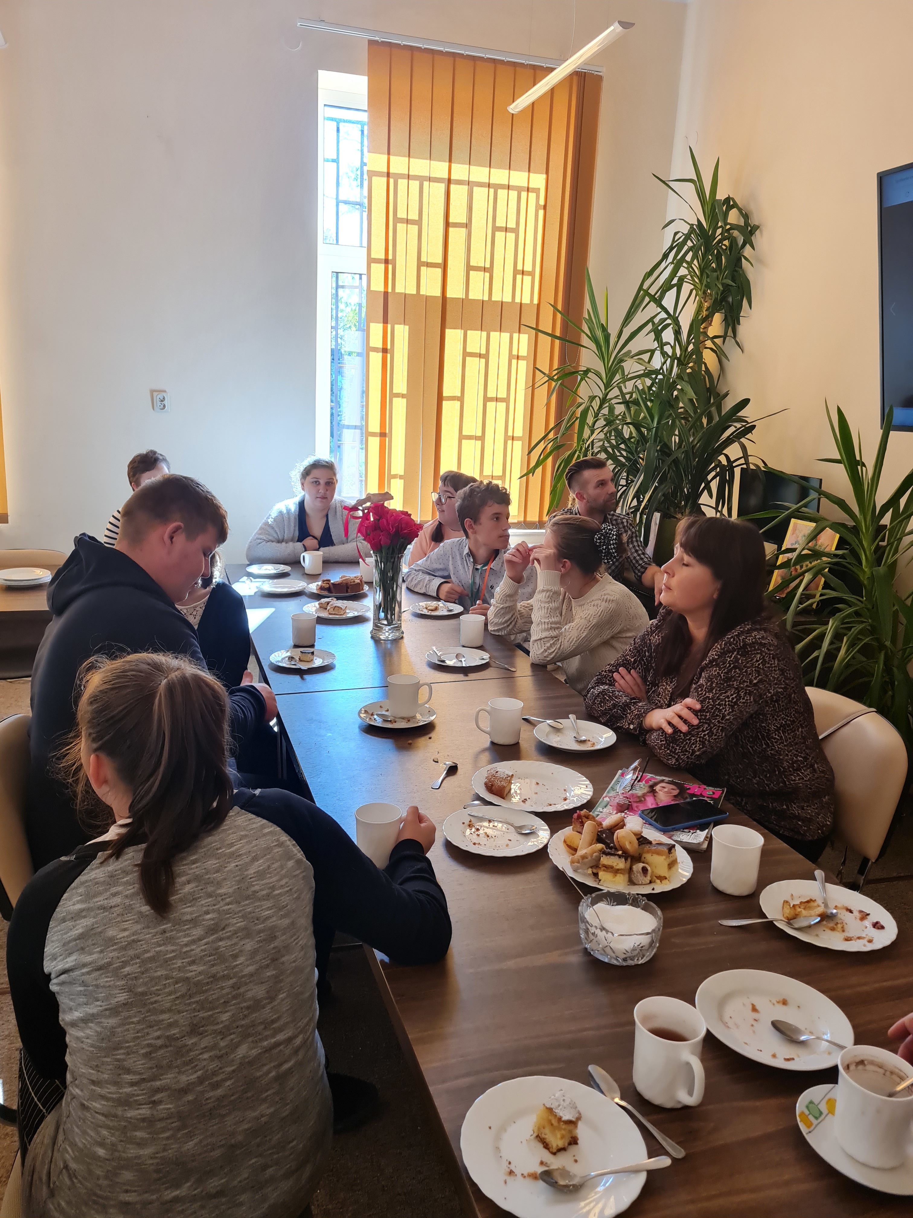 Opiekunowie SOSW wraz z Młodzieżą z wdzięczności za miłe przyjęcie odwdzięczyła się rewizytą. Spotkanie zakończyło się wspólną fotografią i słodkim poczęstunkiem.