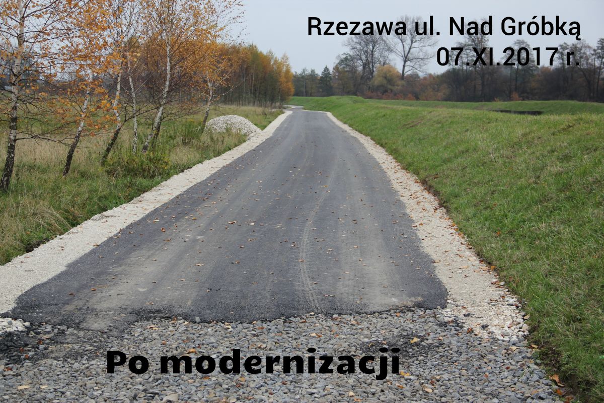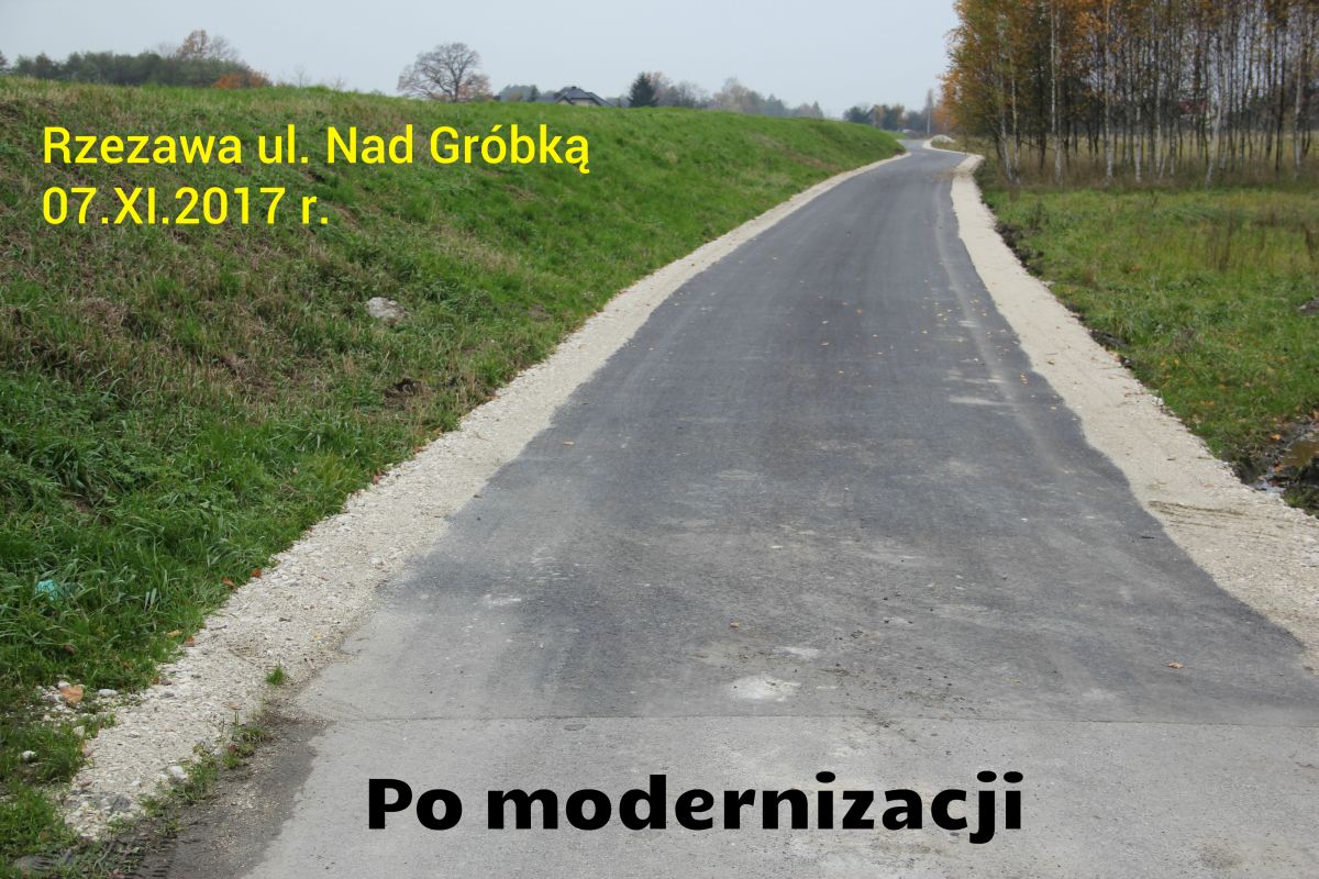 W dniu 14.X.2017 roku dokonano odbioru końcowego modernizacji drogi gminnej w Rzezawie ul. Nad Gróbką w kierunku Krzeczowa. W ramach zadania wykonano nową podbudowę z kruszywa kamiennego o szerokości 3.40 m, nową nawierzchnię asfaltową szerokości 3.00 m i długości 220 mb oraz utwardzono pobocza kruszywem. Wartość całkowita zadania wyniosła 60.270,00 zł. Zadanie otrzymało dofinansowanie w wysokości 30.000,00 zł.