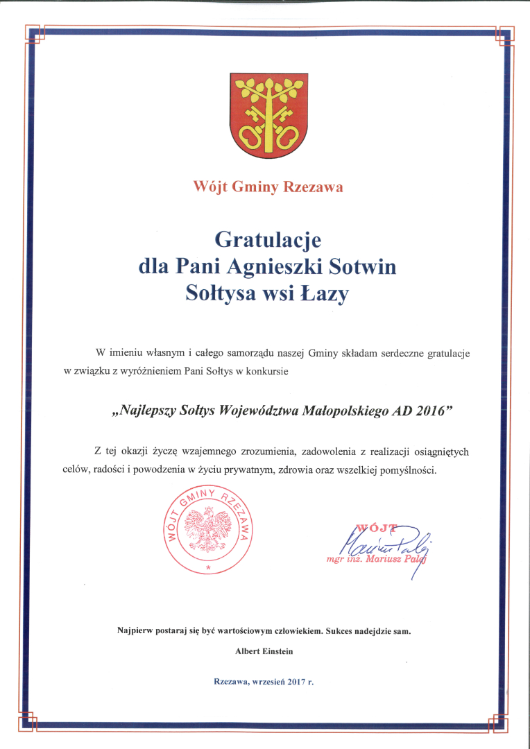 Małopolskie Stowarzyszenie Sołtysów wraz z Gminami, Marszałkiem Województwa Małopolskiego, ARiMR, KRUS, WUP w konkursie „Najlepszy Sołtys Województwa Małopolskiego AD’ 2016” wyróżnili Panią Agnieszkę Sotwin sołtysa wsi Łazy.