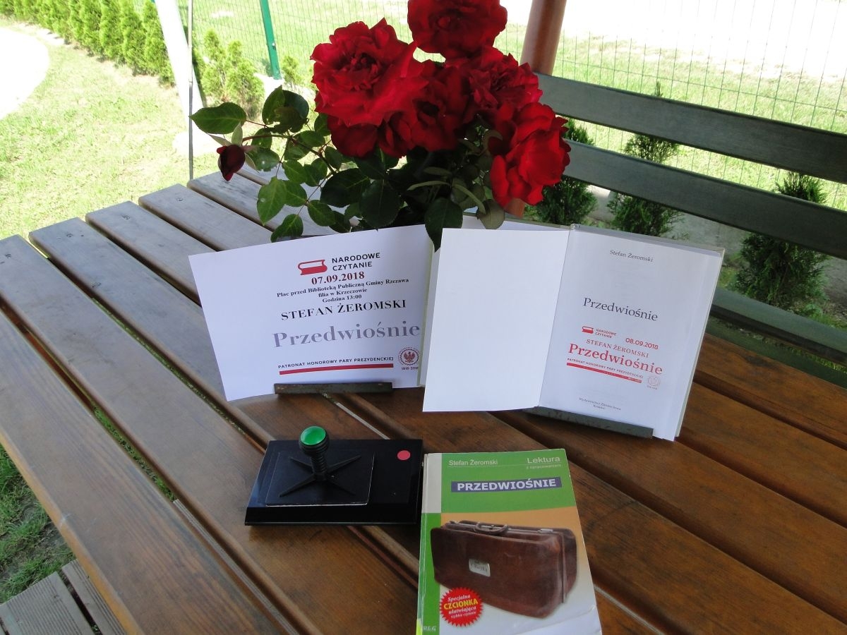 Biblioteka w Rzezawie: Wprowadzenie i ciekawostki z życia Żeromskiego przedstawiła Marta Wiater – kierownik biblioteki a wybrane fragmenty „Przedwiośnia” czytali: Wójt Gminy Rzezawa p. Mariusz Palej, Sekretarz p. Piotr Koczanowski, Dyrektor GCKCziS p. Renata Prokop, Dyrektor Publicznego Państwowego Przedszkola w Rzezawie p. Kinga Pilch-Rudnik, Radni: p. Barbara Kwiecińska, p. Robert Świercz, Prezes Klubu Seniora „Bez ograniczeń” – p. Jan Szydłowski, członkowie klubu seniora p. Danuta Bień, Kazimierz Góra, rodzice: p. Barbara Daniec-Kapałka, Łucja Nyczkowska, Krzysztof Jeziorek, bibliotekarski: Marta Wiater, Janina Sowa, młodzież: Ola, Weronika, Oliwia, Roksana, Nadia, Kinga, Dominik. Czytane były fragmenty Antologii i zaśpiewano kilka piosenek patriotycznych. Członkowie Koła Przyjaciół Biblioteki przygotowali poczęstunek dla wszystkich uczestników akcji. Każdy mógł opieczętować przyniesioną książkę okolicznościową pieczęcią otrzymaną z Kancelarii Prezydenta.