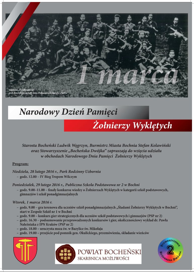Starosta Bocheński Ludwik Węgrzyn, Burmistrz Miasta Bochnia Stefan Kolawiński oraz Stowarzyszenie „Bocheńska Dwójka” zapraszają do wzięcia udziału w obchodach Narodowego Dnia Pamięci Żołnierzy Wyklętych.