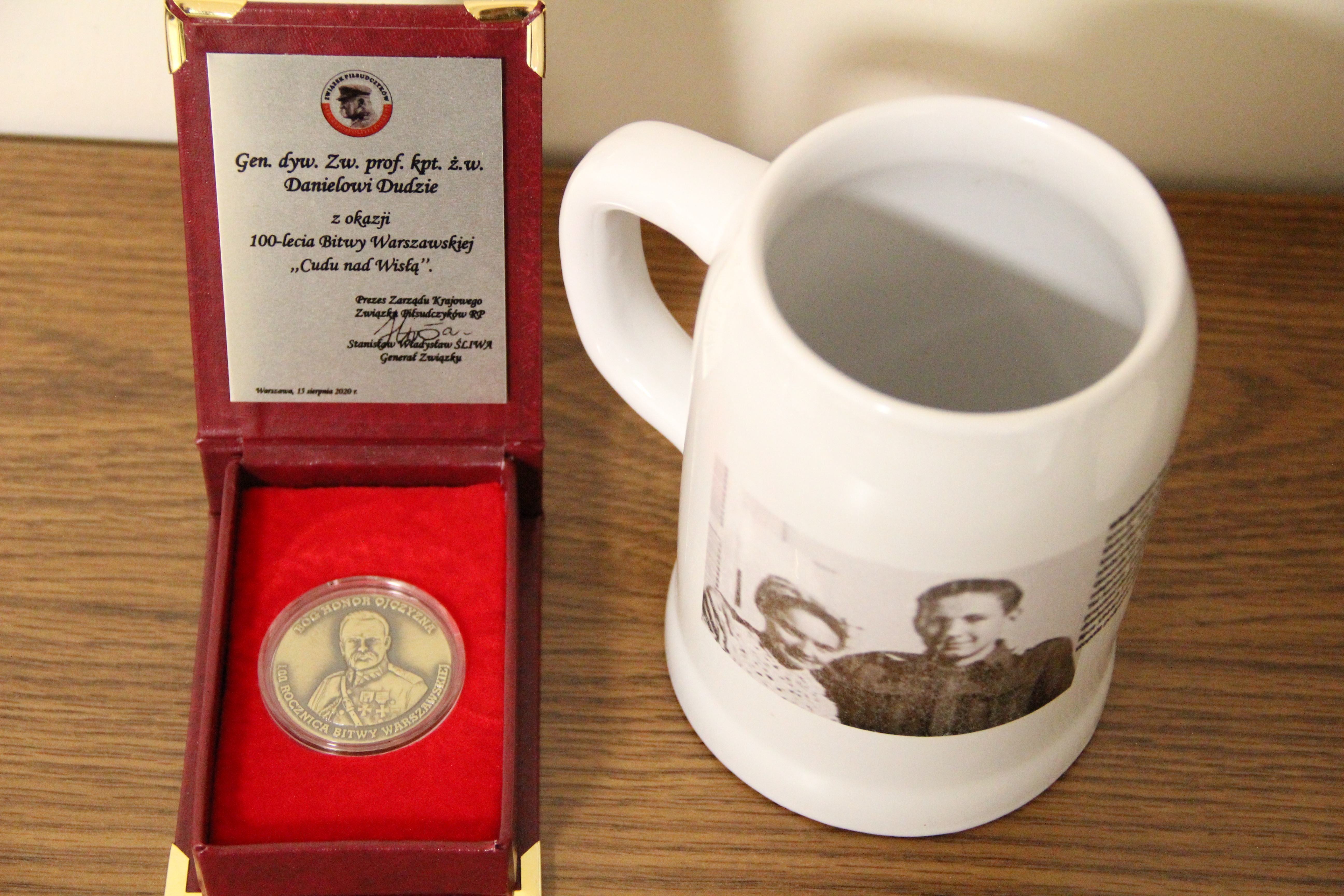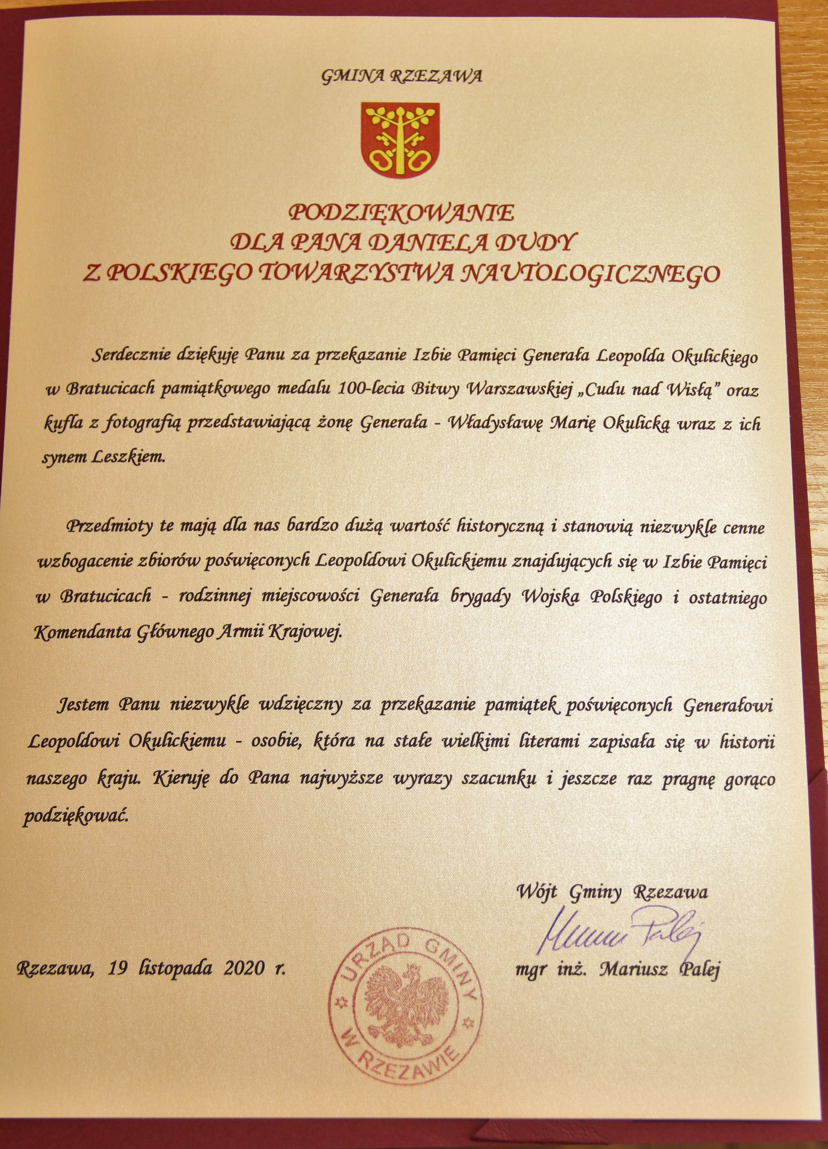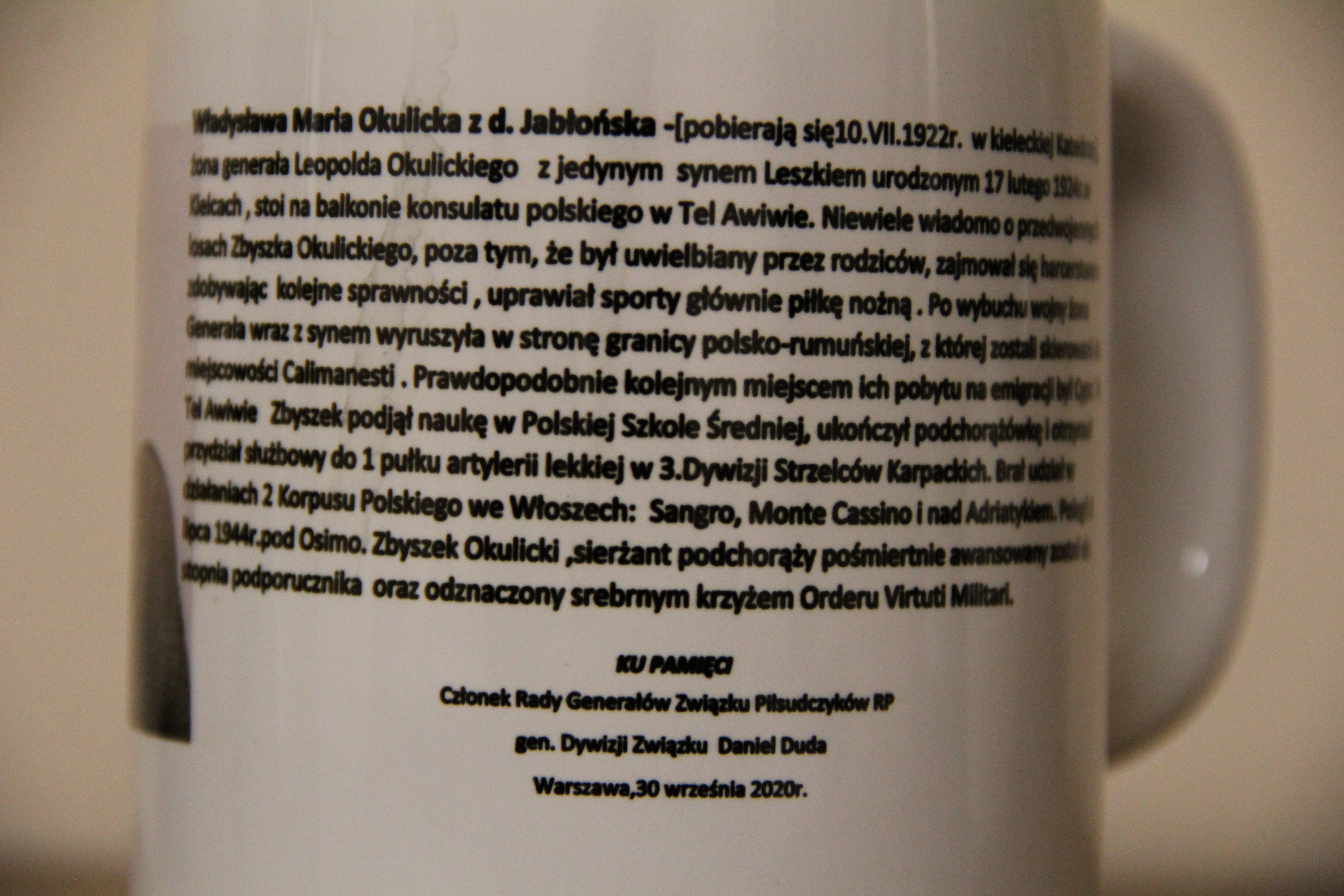 Pamiątki, które zostały przekazane do Izby Pamięci to medal 100-lecia Bitwy Warszawskiej „Cudu nad Wisłą” oraz kufel z fotografią przedstawiającą żonę Generała - Władysławę Marię Okulicką wraz z ich synem Leszkiem.