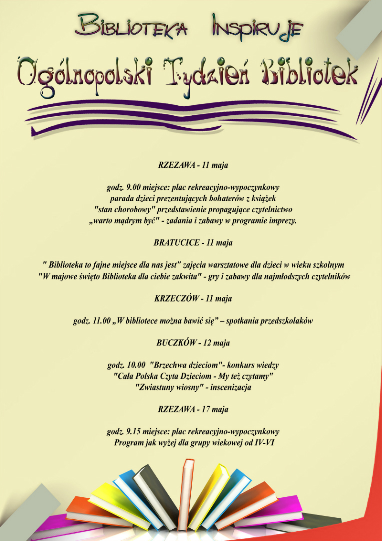 W dniach 8-15 maja 2016 r. odbędzie się kolejna edycja programu Tydzień Bibliotek. Jego głównym celem jest podkreślanie roli czytania i bibliotek w poprawie jakości życia, edukacji oraz zwiększenie prestiżu zawodu bibliotekarza i zainteresowania książką szerokich kręgów społeczeństwa.