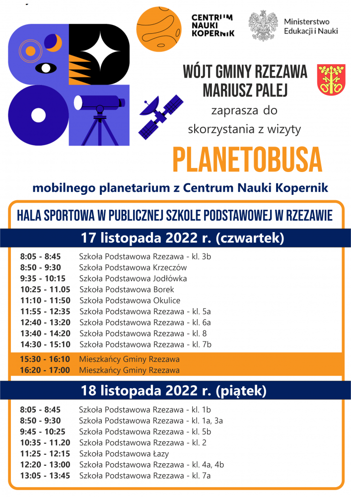 Wójt Gminy Rzezawa Mariusz Palej zaprasza do skorzystania z wizyty Planetobusa - mobilnego planetarium z Centrum Nauki Kopernik. Będzie on stacjonował w Publicznej Szkole Podstawowej im. Świętej Jadwigi Królowej w Rzezawie 17 i 18 listopada w Rzezawie. Szczegóły na plakacie.