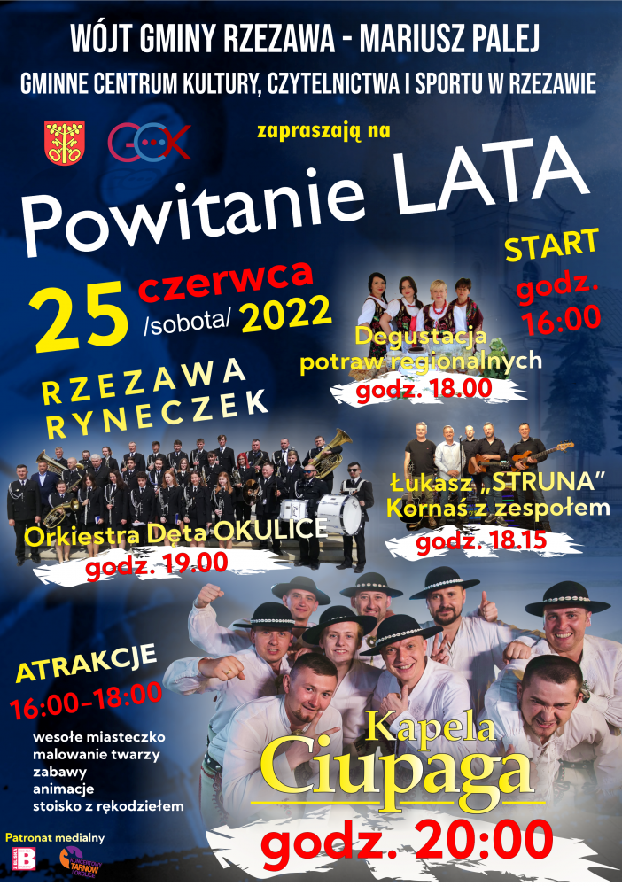 Wójt Gminy Rzezawa Mariusz Palej oraz Gminne Centrum Kultury, Czytelnictwa i Sportu w Rzezawie zapraszają na Powitanie Lata, które odbędzie się 25 czerwca (sobota) na rzezawskim Ryneczku. Start imprezy pełnej atrakcji o godz. 16. Serdecznie zapraszamy.