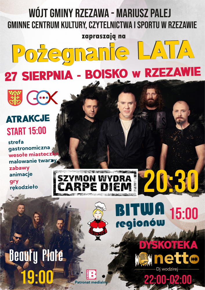 Wójt Gminy Rzezawa Mariusz Palej oraz Gminne Centrum Kultury, Czytelnictwa i Sportu w Rzezawie zapraszają 27 sierpnia (sobota) na Pożegnanie Lata na Boisku w Rzezawie. Rozpoczęcie imprezy godz.15.00. W programie m.in. Bitwa regionów, występy artystyczne, atrakcje dla dzieci, w tym m.in. wesołe miasteczko, malowanie twarzy, animacje i zabawy taneczne. Serdecznie zapraszamy.