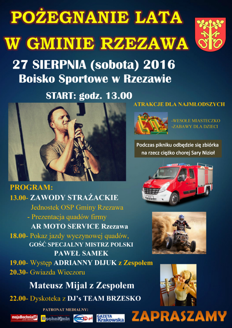 Wójt Gminy Rzezawa, Gminne Centrum Kultury Czytelnictwa i Sportu w Rzezawie serdecznie zapraszają do udziału w imprezie plenerowej „Pożegnanie Lata w Gminie Rzezawa”, która odbędzie się 27 sierpnia 2016r. na boisku sportowym w Rzezawie.