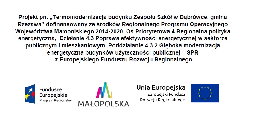 Gmina Rzezawa jako nieliczna ze Subregionu Krakowskiego Obszar Metropolitalny otrzymała dofinansowanie w kwocie 378.040,90 zł na zadanie pn. „Termomodernizacja budynku Zespołu Szkół w Dąbrówce”. Zakres zadania obejmuje wykonanie : docieplenia ścian zewnętrznych budynku szkoły, docieplenie stropu nad ostatnią kondygnacją, wymiana stolarki okiennej i drzwiowej zewnętrznej, modernizacja c.w.u., modernizacja instalacji c.o. Wartość całkowita projektu kształtuje się na poziomie ok. 650 tys. zł. Termin wykonania zadania przypada na dzień 30.X.2017 r. Głównym celem projektu jest zwiększenie efektywności energetycznej budynku Zespołu Szkół w Dąbrówce poprzez obniżenie globalnej emisyjności obiektu, obniżenie emisji CO2 i pyłów zawieszonych PM10, zmniejszenie zużycia energii pierwotnej i końcowej, zmniejszenie kosztów ogrzewania budynku.