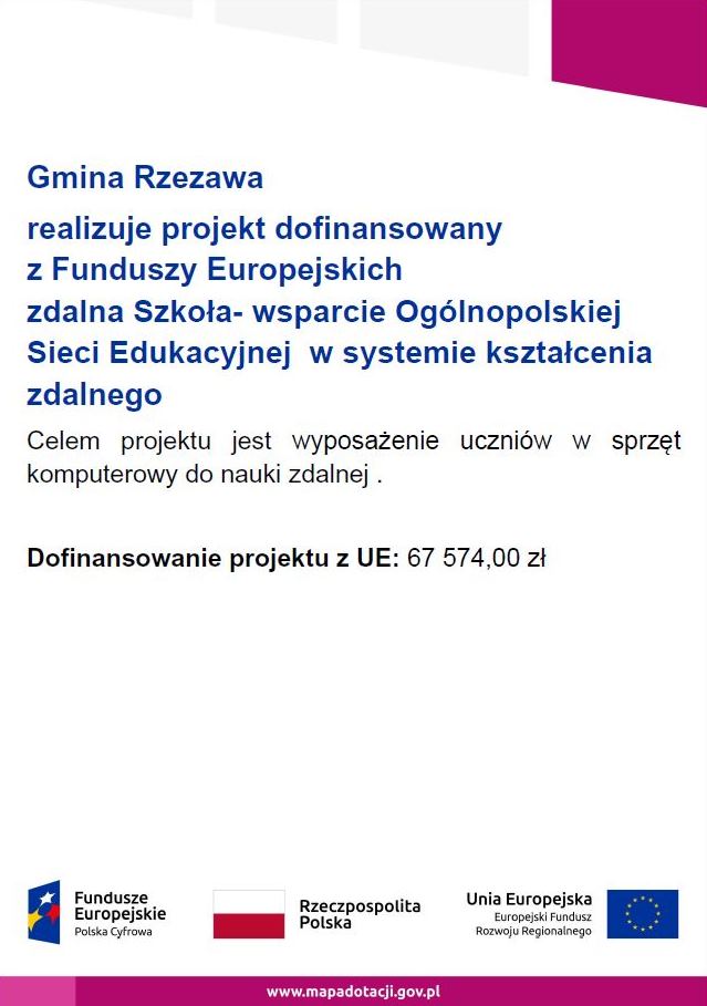 Gmina Rzezawa realizuje projekt dofinansowany z Funduszy Europejskich Zdalna Szkoła - wsparcie Ogólnopolskiej Sieci Edukacyjnej w systemie kształcenia zdalnego.