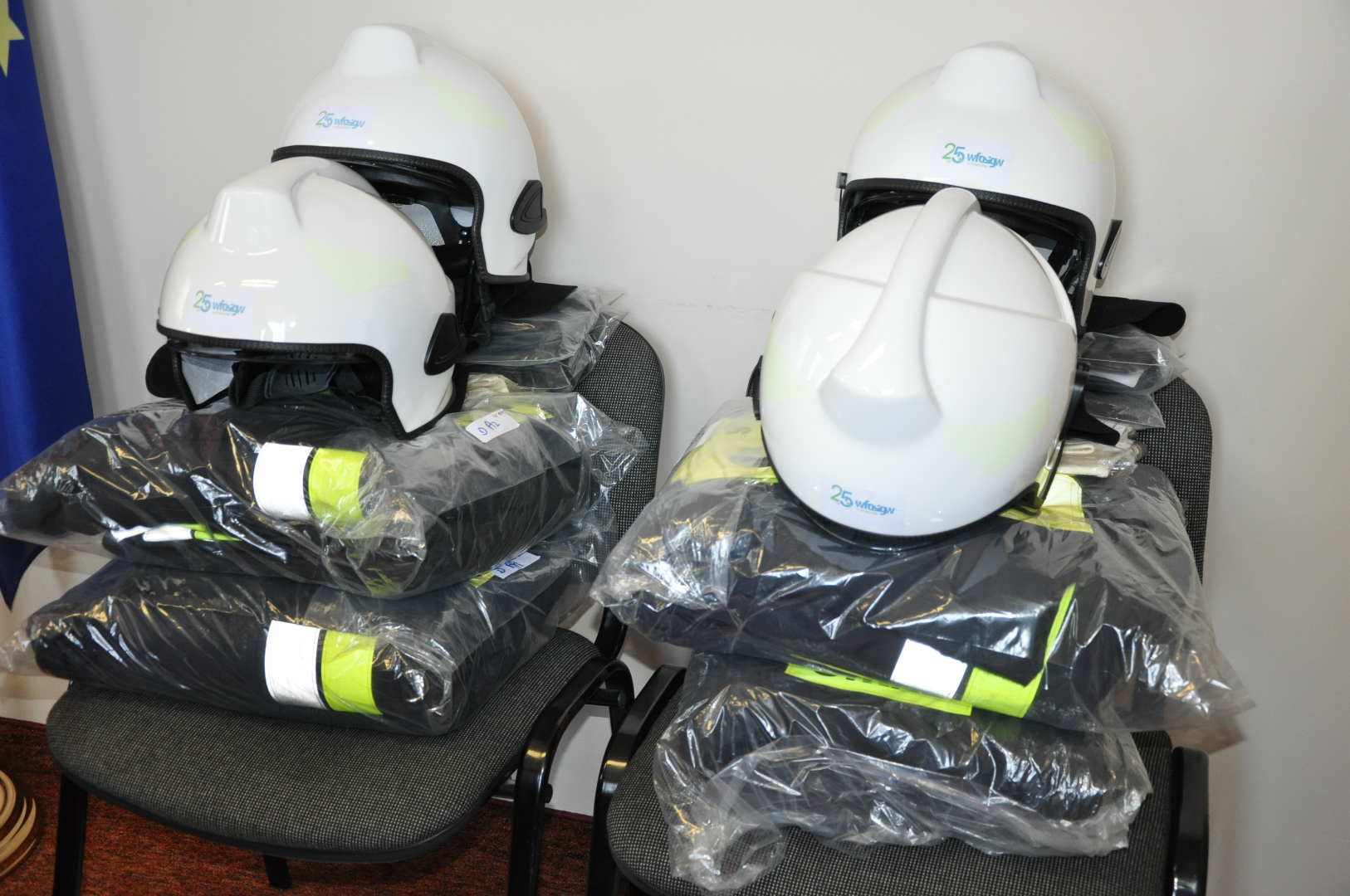po dwa komplety profesjonalnego umundurowania bojowego zakupionego w ramach programu ”Bezpieczny Strażak” - nazwa zadania: „Zwiększenie gotowości bojowej strażaków – ochotników poprzez zakup odzieży ochronnej i wyposażenia dla jednostek OSP z terenu gminy Rzezawa”