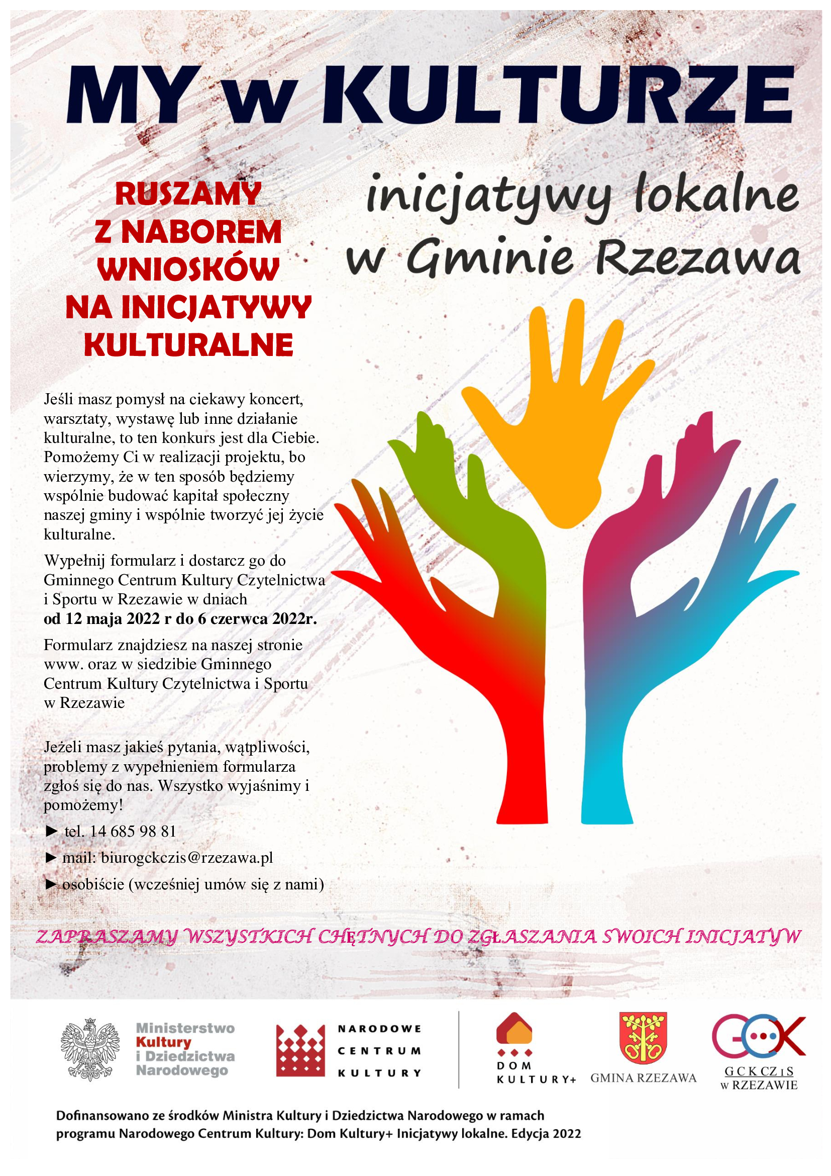 Jeśli masz pomysł na ciekawy koncert, warsztaty, wystawę lub inne działanie kulturalne, to ten konkurs jest dla Ciebie. Pomożemy Ci w realizacji projektu, bo wierzymy, że w ten sposób będziemy wspólnie budować kapitał społeczny naszej gminy i wspólnie tworzyć jej życie kulturalne.