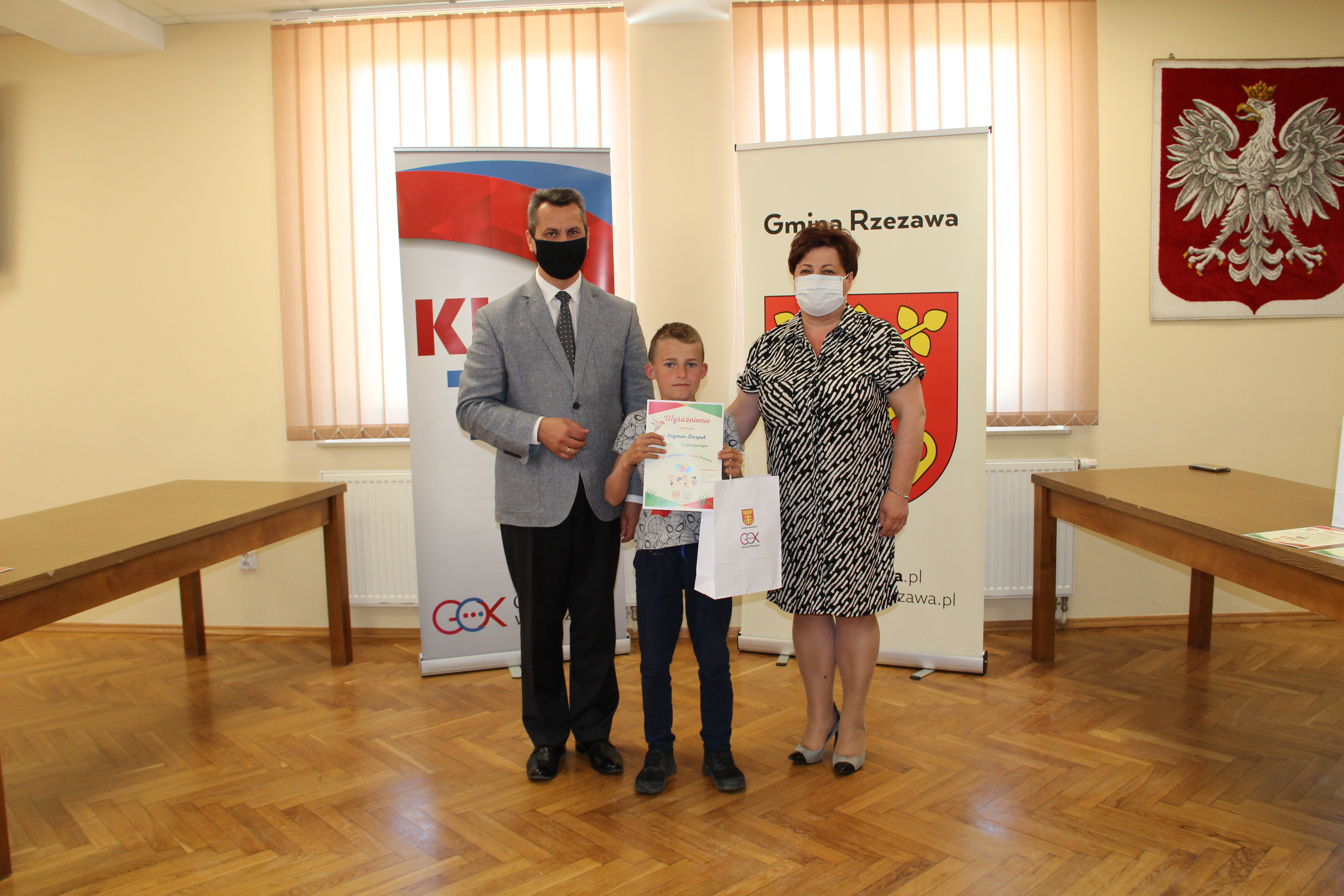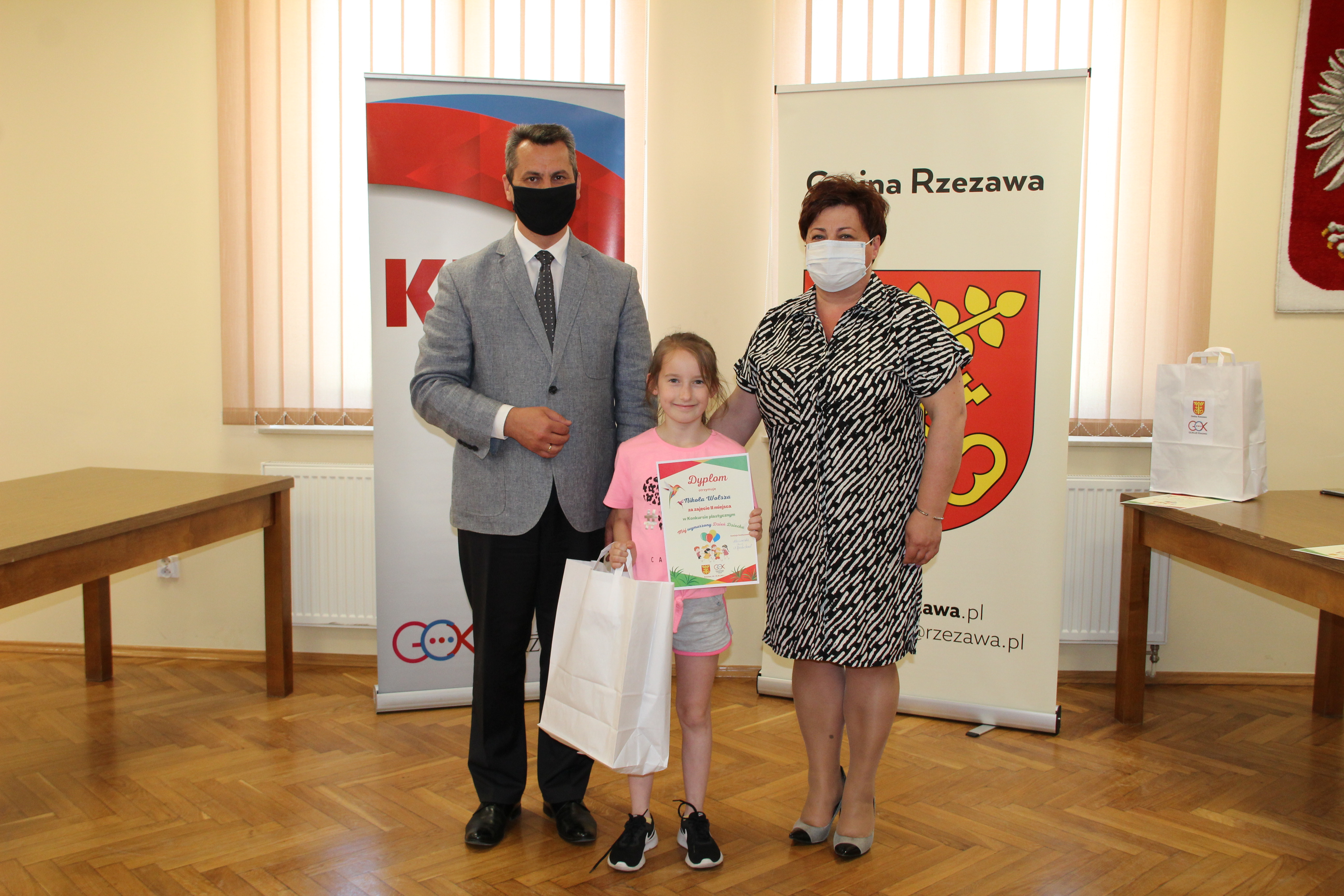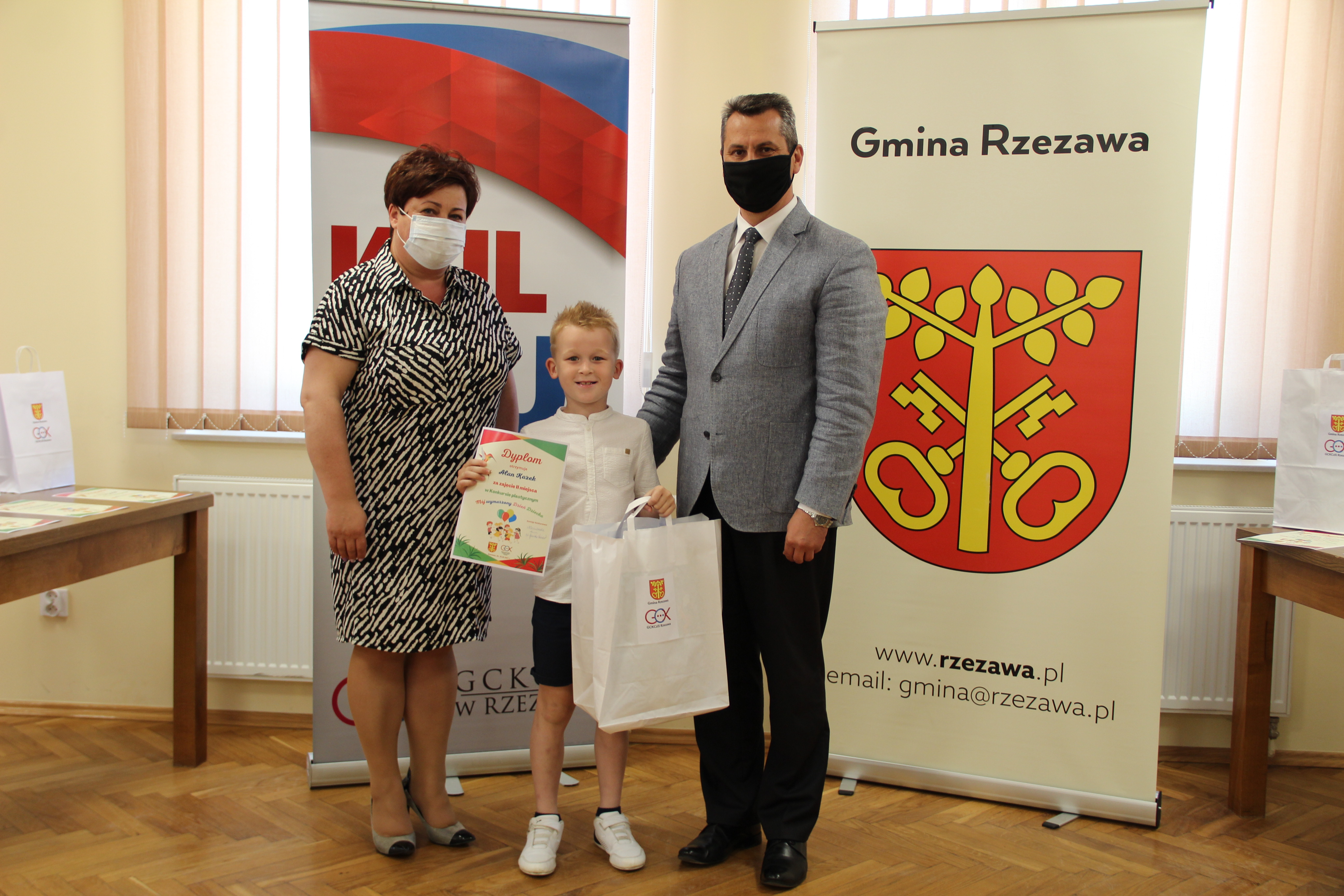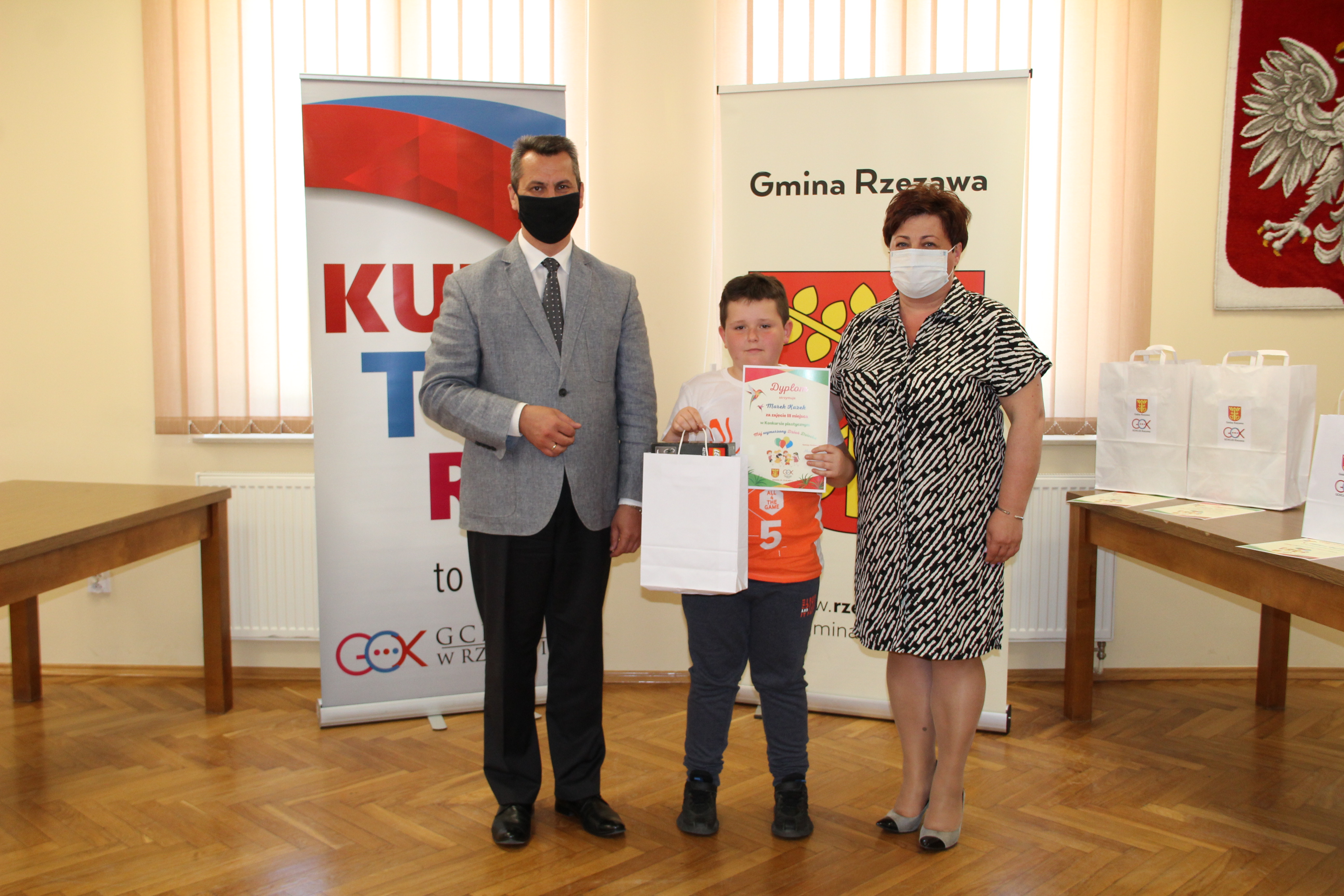 Wręczenie nagród laureatom Konkursu Mój wymarzony Dzień Dziecka odbyło się w piątek 4 czerwca 2021r. Nagrody i dyplomy wręczył Wójt Gminy Rzezawa – Mariusz Palej i Dyrektor Gminnego Centrum Kultury, Czytelnictwa i Sportu w Rzezawie - Renata Prokop.