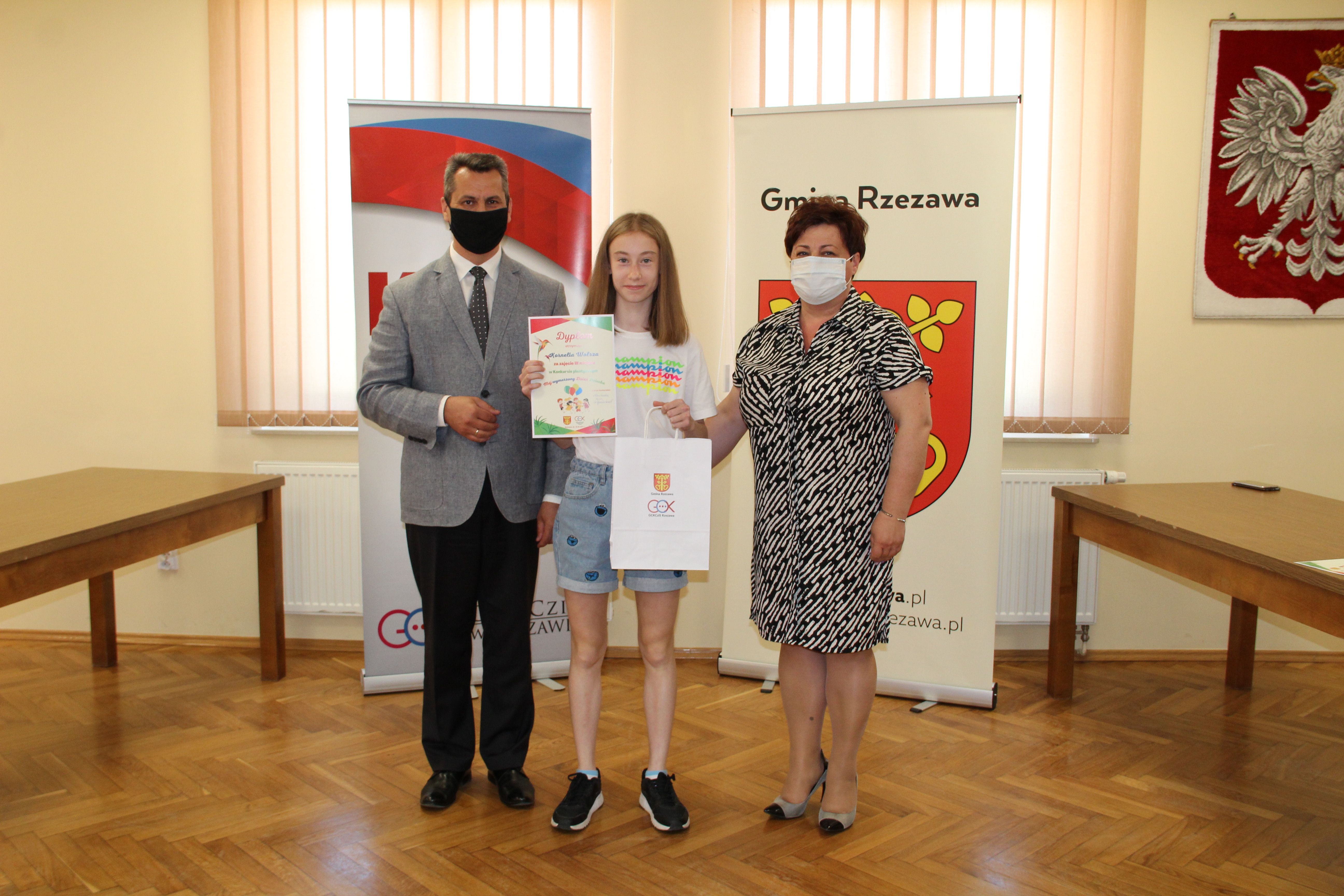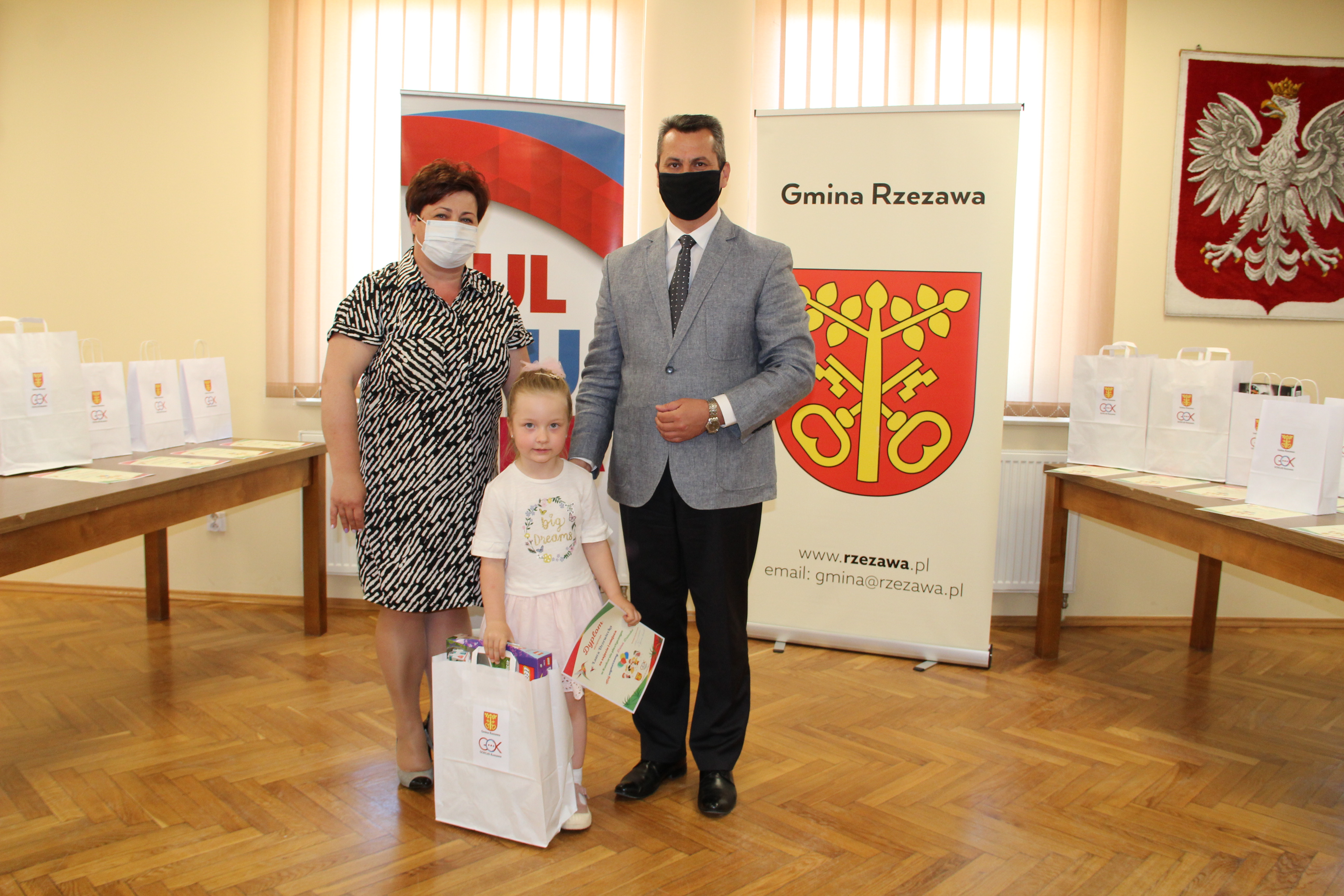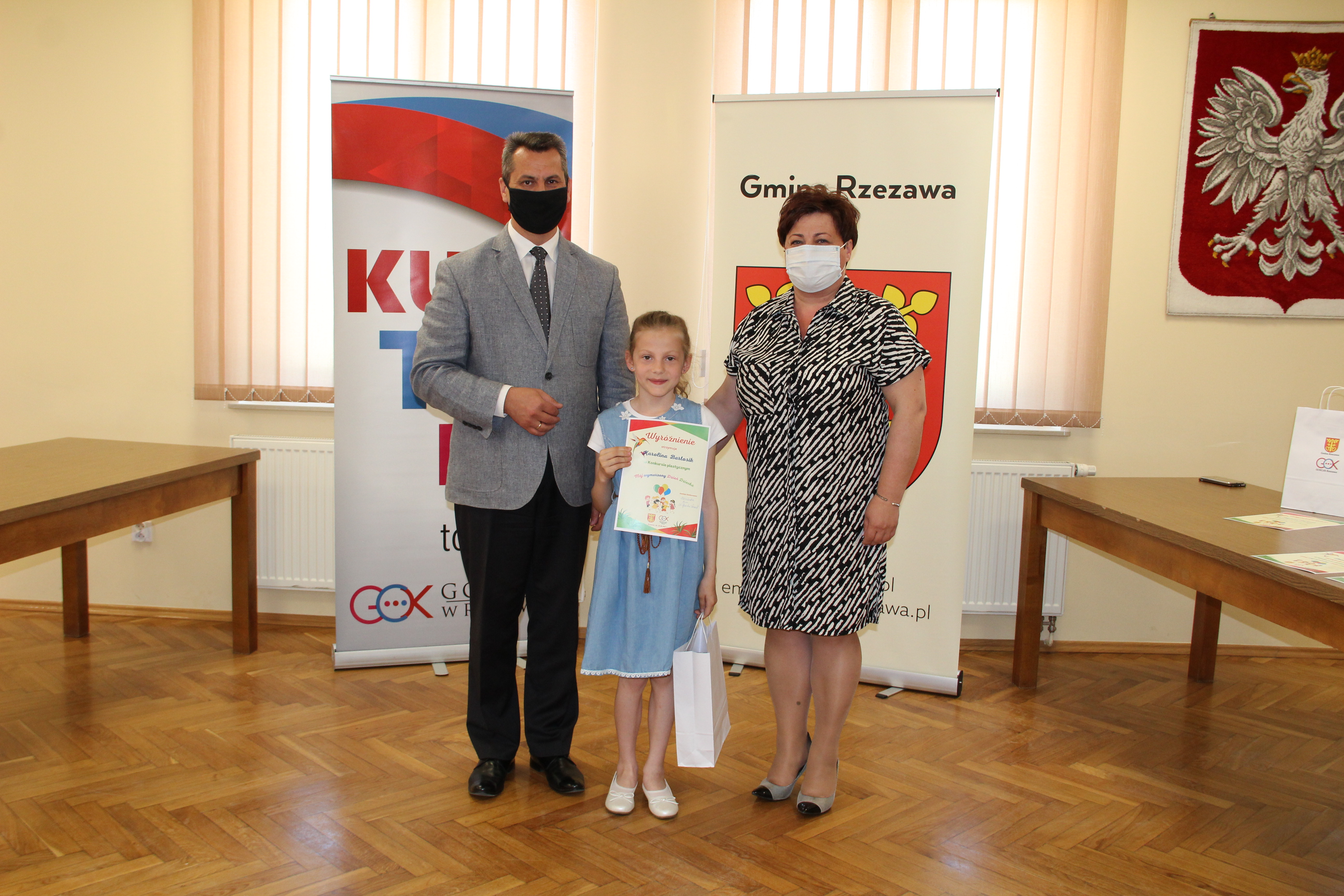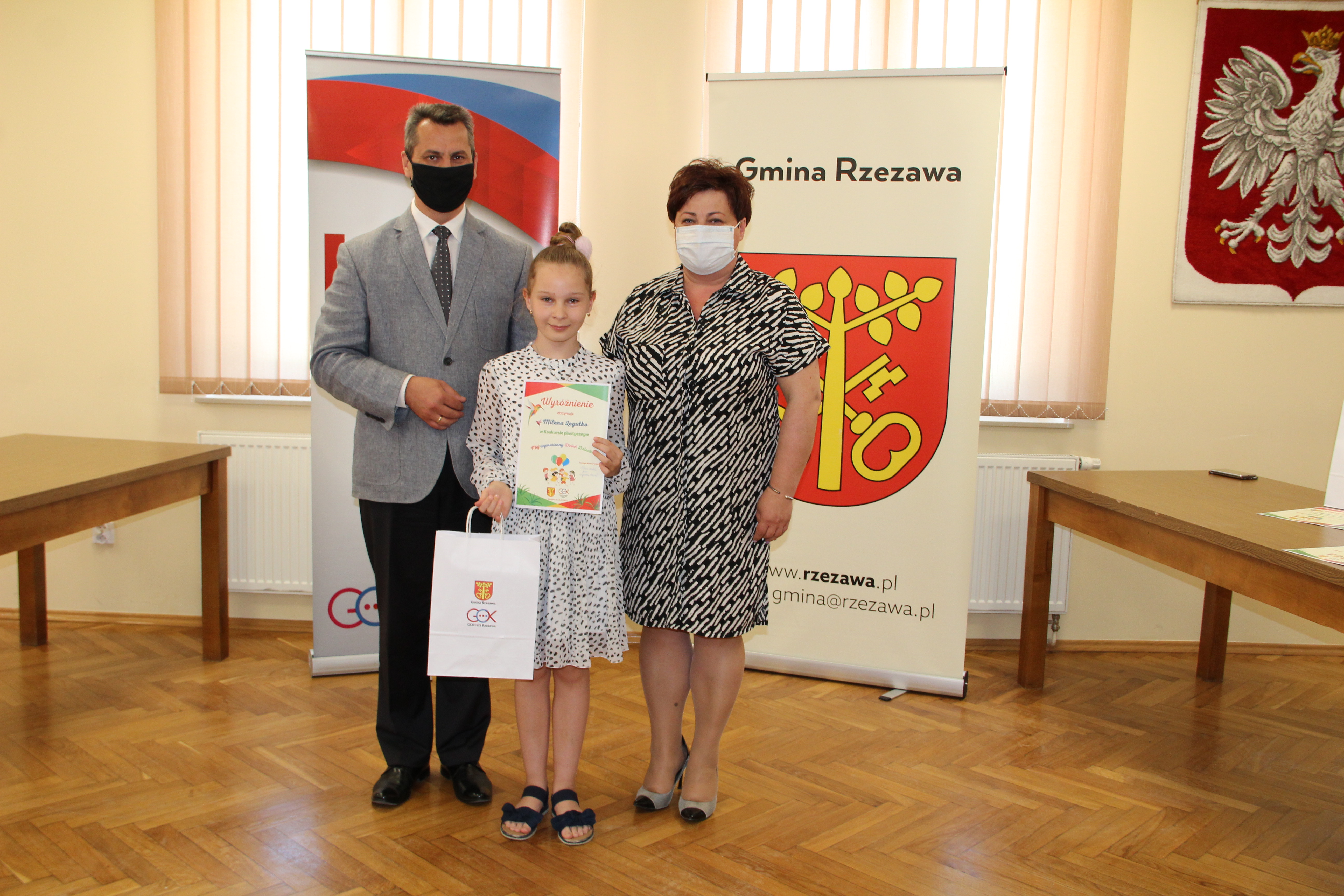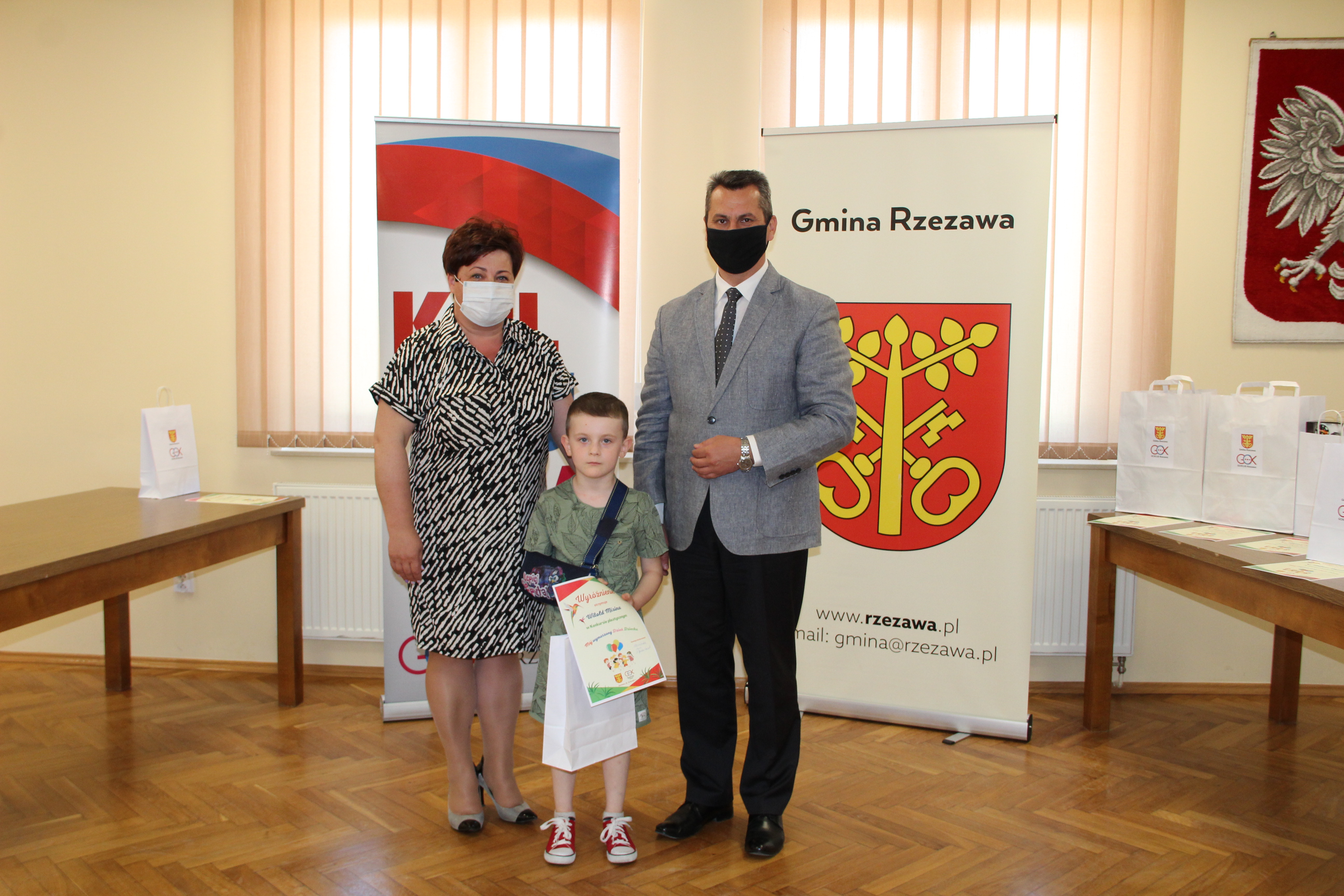 Wręczenie nagród laureatom Konkursu Mój wymarzony Dzień Dziecka odbyło się w piątek 4 czerwca 2021r. Nagrody i dyplomy wręczył Wójt Gminy Rzezawa – Mariusz Palej i Dyrektor Gminnego Centrum Kultury, Czytelnictwa i Sportu w Rzezawie - Renata Prokop.
