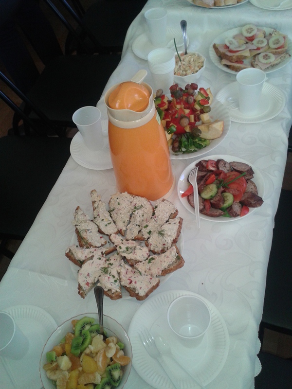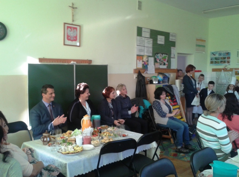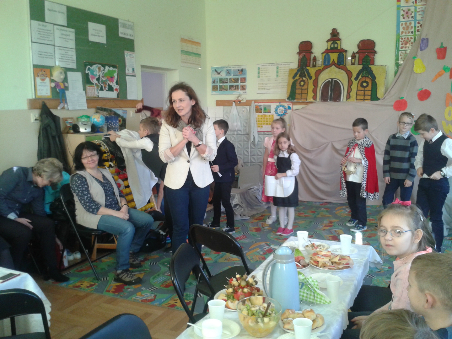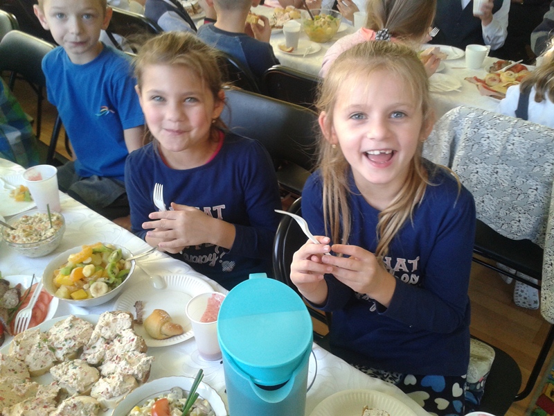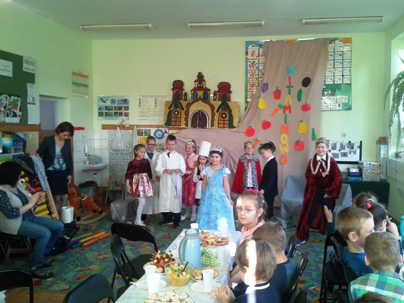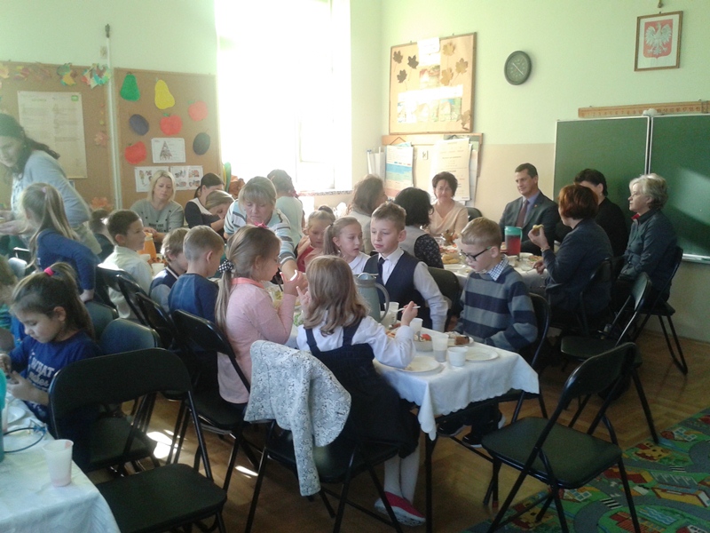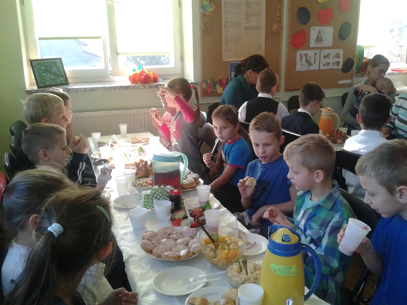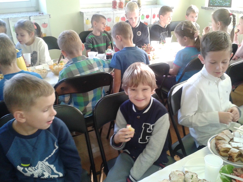 Klasa III ze szkoły w Łazach przystąpiła do ogólnopolskiej akcji "Śniadanie daje moc". Akcja miała na celu promowanie zdrowego trybu życia wśród uczniów i nie tylko. Uczniowie pod opieką wychowawczyni - J.Byrki -Dziedzic przez dwa miesiące zmagali się z wieloma misjami i zadaniami specjalnymi, by w końcu - 8 listopada przygotować finał - zdrowe śniadanie. W organizację finałowego posiłku zaangażowali się wszyscy rodzice uczniów klasy III. Przygotowano wspaniałe zdrowe produkty, na których degustację zostali zaproszeni goście: Pan Mariusz Palej - Wójt Gminy Rzezawa, Pani Agnieszka Sotwin - Sołtys wsi, Pani Bernadetta Rysak, Pani Dyrektor i wicedyrektor oraz wychowawczynie klas I i II wraz z uczniami. Można było skosztować wielu wspaniałych i zdrowych dań, m.in koktajle owocowe, kompoty, pasty z wiejskiego sera i jaj, domowe pieczywo, sałatki owocowe i wiele innych. Na sam początek trzecioklasiści "zaserwowali" zdrowe przedstawienie - inscenizację o księżniczce, która w końcu zrozumiała, jak ważne w diecie są witaminy. Mini teatrzyk uświetniła piosenka oraz gra na bum bum rurkach.