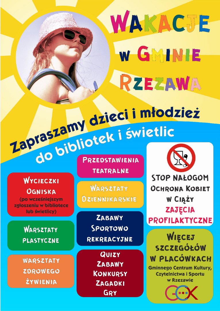 W tegoroczne wakacje na dzieci i młodzież na placówkach GCKCZiS w Rzezawie czeka wiele atrakcji i niespodzianek. Zarówno młodsi jak i starsi wakacjowicze uczęszczający do bibliotek i na świetlice mogą tu aktywnie i pożytecznie spędzić wolny czas. Zaplanowano warsztaty plastyczne, dziennikarskie, zdrowego żywienia, wyjazdy i ogniska, przedstawienia teatralne, zajęcia sportowo – rekreacyjne, quizy, gry, konkursy i zabawy. Prowadzone będą również zajęcia profilaktyczne dotyczące propagowania zdrowego żywienia oraz przeciwdziałania używkom, nałogom i przemocy. Bardziej szczegółowe informacje można uzyskać w poszczególnych bibliotekach i świetlicach.