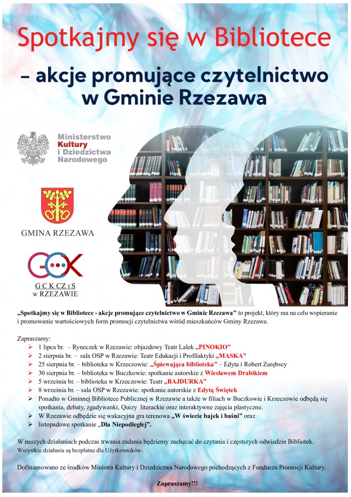 Zapraszamy do udziału w projekcie ,,Spotkajmy sie w Bibliotece - akcje promujące czytelnictwo w Gminie Rzezawa'', którego celem jest wspieranie i promowanie wartościowych form promocji czytelnictwa wśród mieszkańców Gminy Rzezawa. W projekcie zaplanowano wiele ciekawych działań. Szczegóły na plakacie.