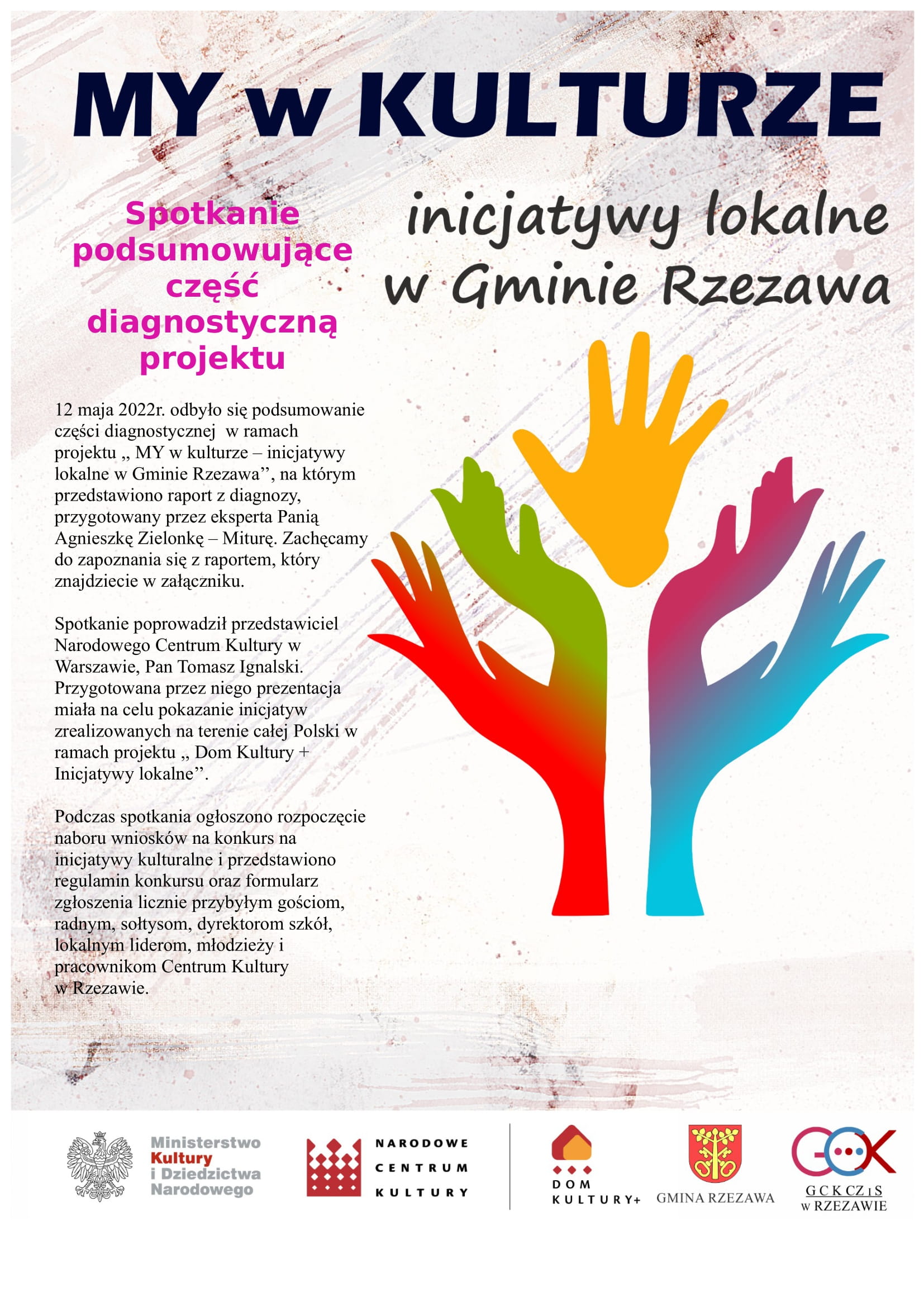 12 maja 2022 r. odbyło się podsumowanie części diagnostycznej w ramach projektu ,, MY w kulturze – inicjatywy lokalne w Gminie Rzezawa’’, na którym przedstawiono raport z diagnozy, przygotowany przez eksperta Panią Agnieszkę Zielonkę – Miturę. Zachęcamy do zapoznania się z raportem, który znajdziecie w załączniku.