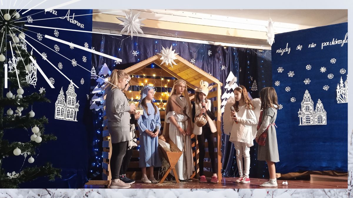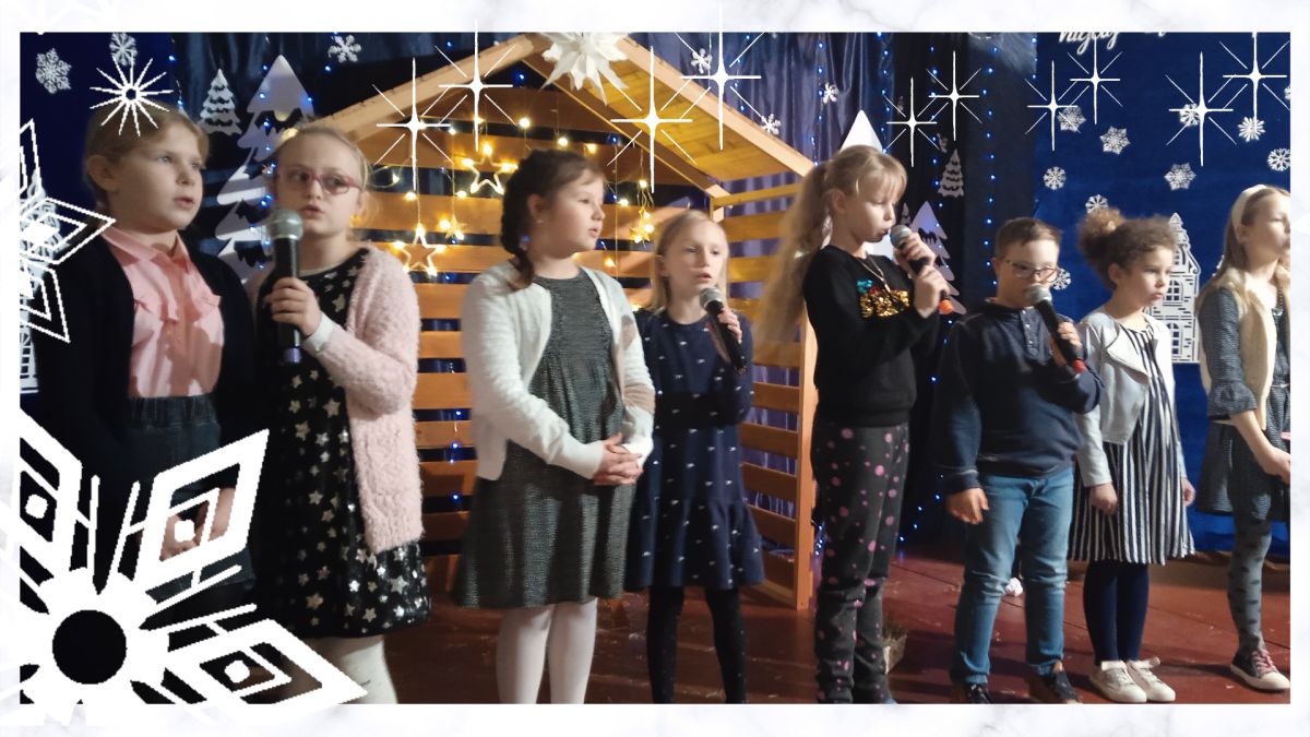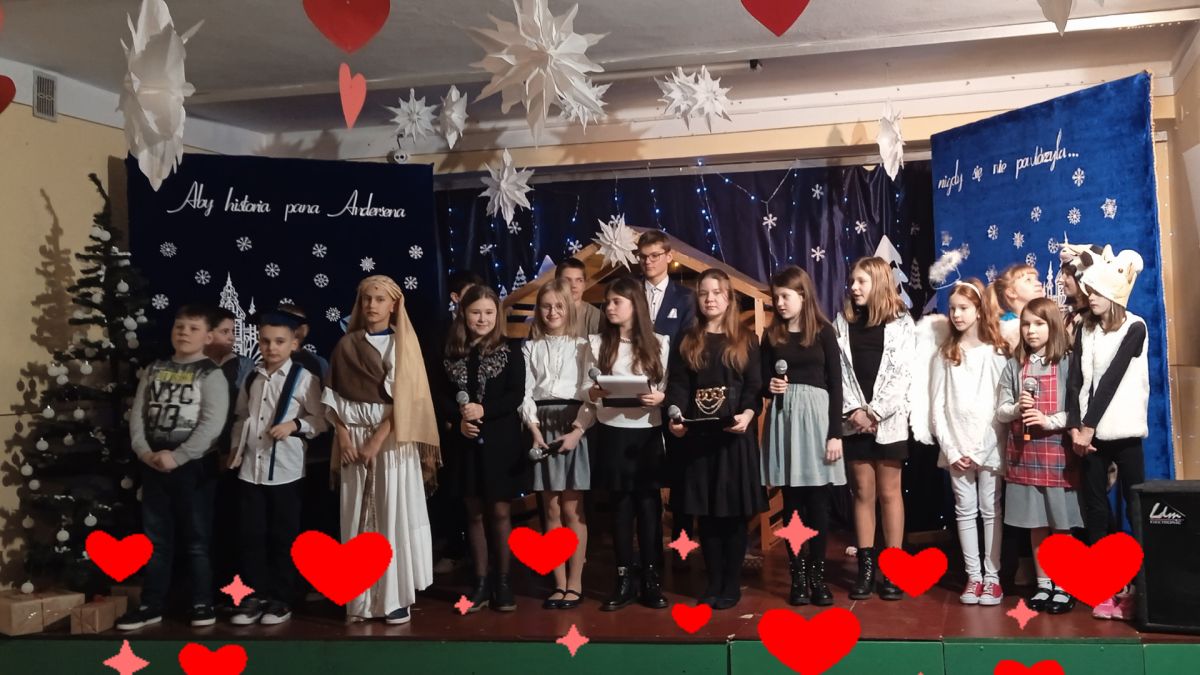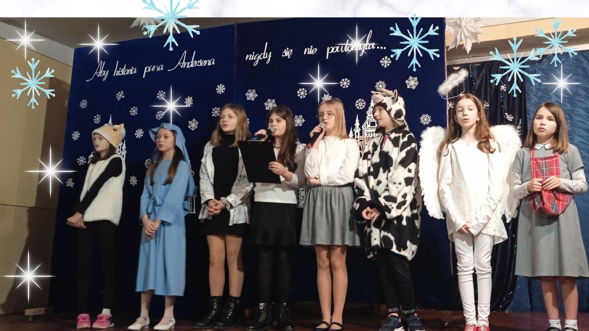 Spotkanie rozpoczęło się powitaniem zgromadzonych gości przez Dyrektor Szkoły panią Barbarę Korol-Adamczyk. Następnie na scenie zaprezentowali się uczniowie klasy IV b wspierani przez uczniów klasy VIII, którzy przygotowali spektakl profilaktyczny „Dziewczynka z zapałkami – całkiem nowa historia” w oparciu o autorski scenariusz napisany przez nauczyciela języka polskiego p. Edytę Lesiewicz. Występ uświetnił taniec śnieżynek w wykonaniu uczennic klasy III a pod kierunkiem p. Katarzyny Szczupak oraz kolęda w wykonaniu uczniów klasy II pod kierunkiem p. Agaty Lekkiej.