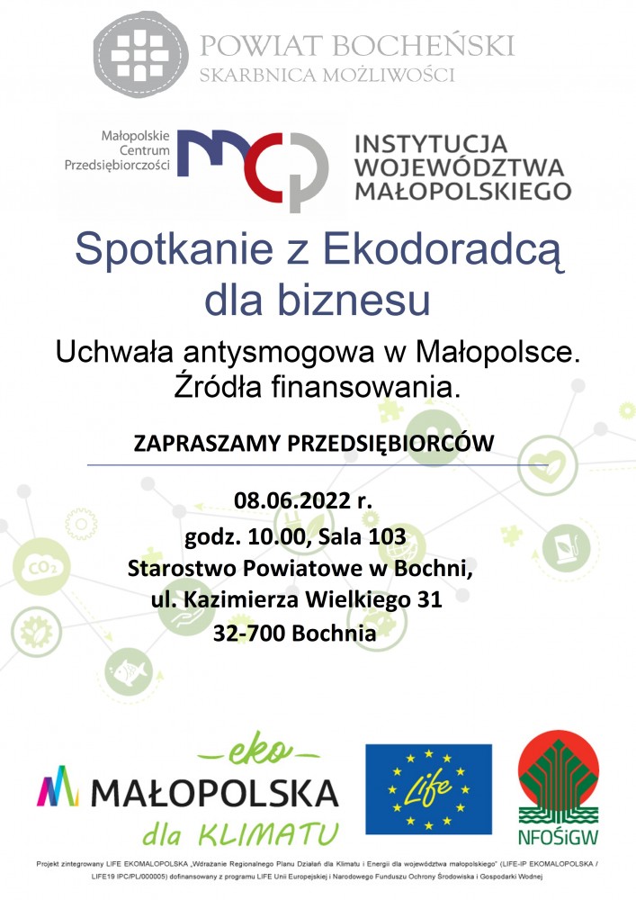 Starostwo Powiatowe w Bochni zaprasza przedsiębiorców z terenu Powiatu Bocheńskiego na bezpłatne spotkanie z ekodoradcą dla biznesu z Małopolskiego Centrum Przedsiębiorczości, które odbędzie się w dniu 8 czerwca o godz. 10.00, w sali 103 w budynku Starostwa Powiatowego w Bochni.