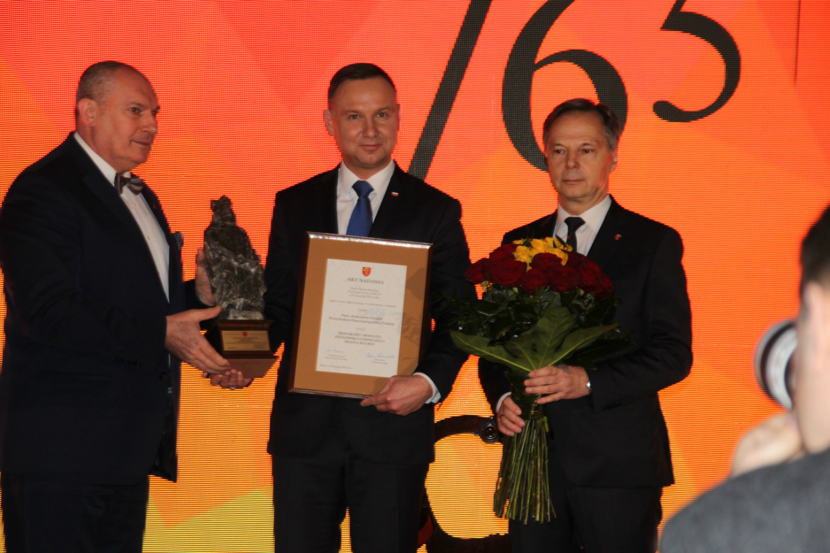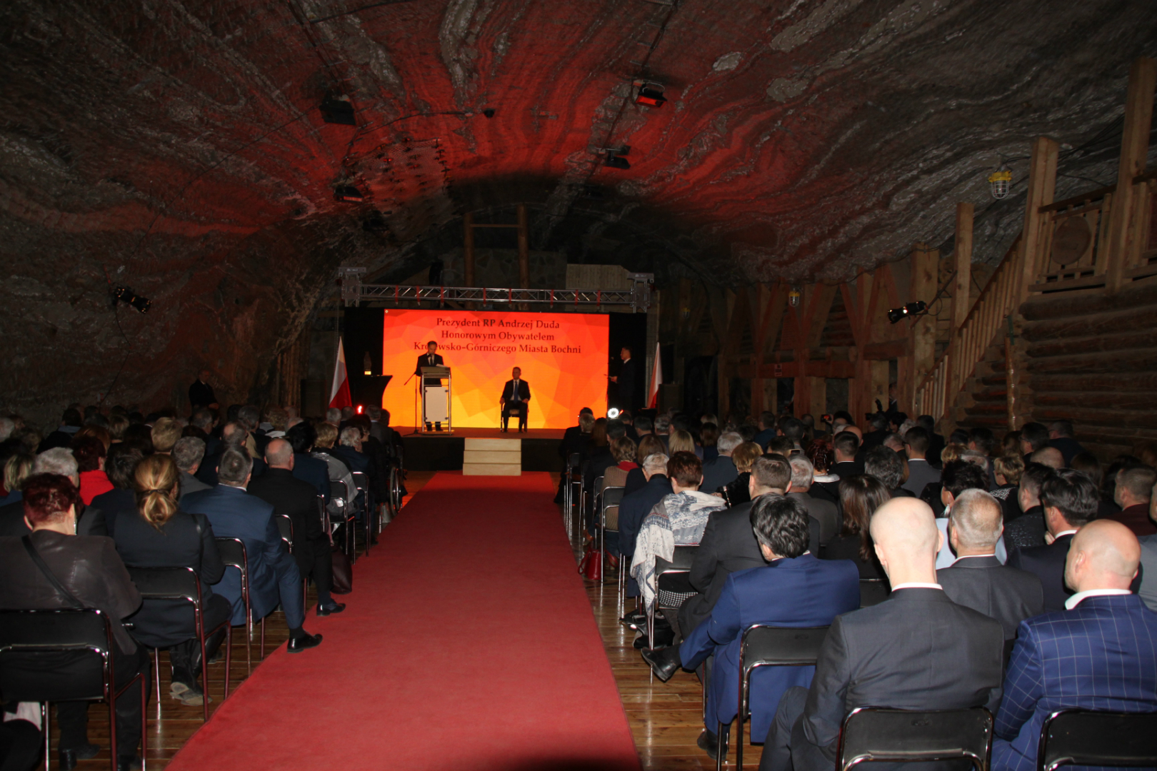 Podczas wizyty w mieście soli prezydent RP odebrał tytuł honorowego obywatela Bochni. Wyróżnienie to otrzymał, jak napisano w uzasadnieniu, m.in. za patriotyczne wartości i postawy, którymi kieruje się w życiu oraz liczne wizyty w powiecie bocheńskim. Jako honorowy obywatel królewsko – górniczego miasta Andrzej Duda z rąk burmistrza Bochni Stefana Kolawińskiego oraz przewodniczącego Rady Miejskiej Jana Balickiego otrzymał akt nadania tytułu oraz rzeźbę przedstawiającą króla Kazimierza Wielkiego wykonaną z bryły soli. - Jestem bardzo dumny, bo Bochnia to nie tylko bardzo piękne miasto, które ma niezwykle wiele uroku i wspaniałe zabytki. To przede wszystkim miasto, które ma wielką tradycję, tradycję grodzką. 765 lat tradycji miejskiej musi zrobić wrażenie na każdym w Polsce. To 4 lata więcej niż Kraków, który był lokowany w 1257 roku – mówił prezydent, podkreślając że Bochnia jest mu znana od dzieciństwa.