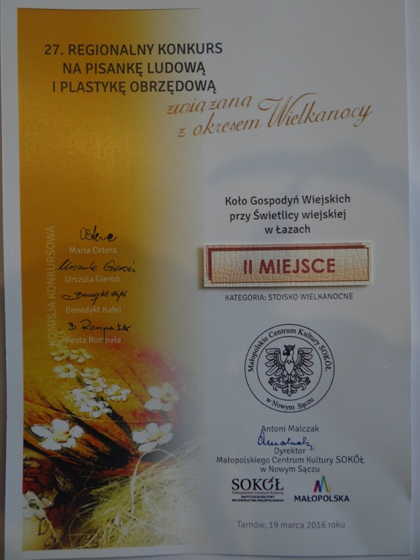 Mimo tak dużej konkurencji Koło Gospodyń z Łazów w kategorii „Stoisko Wielkanocne” zdobyło II miejsce i zostało uhonorowane dyplomem i nagrodą.