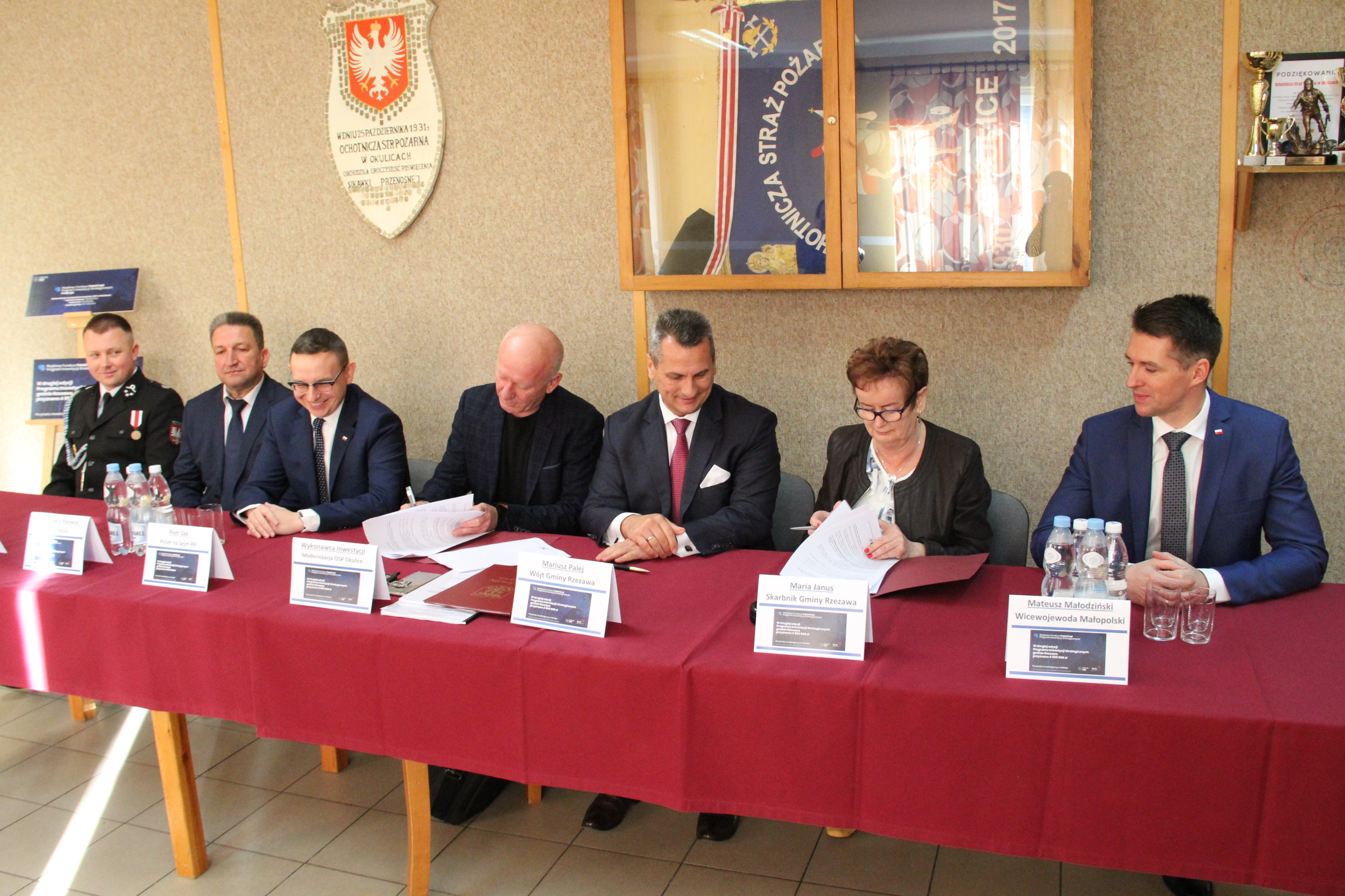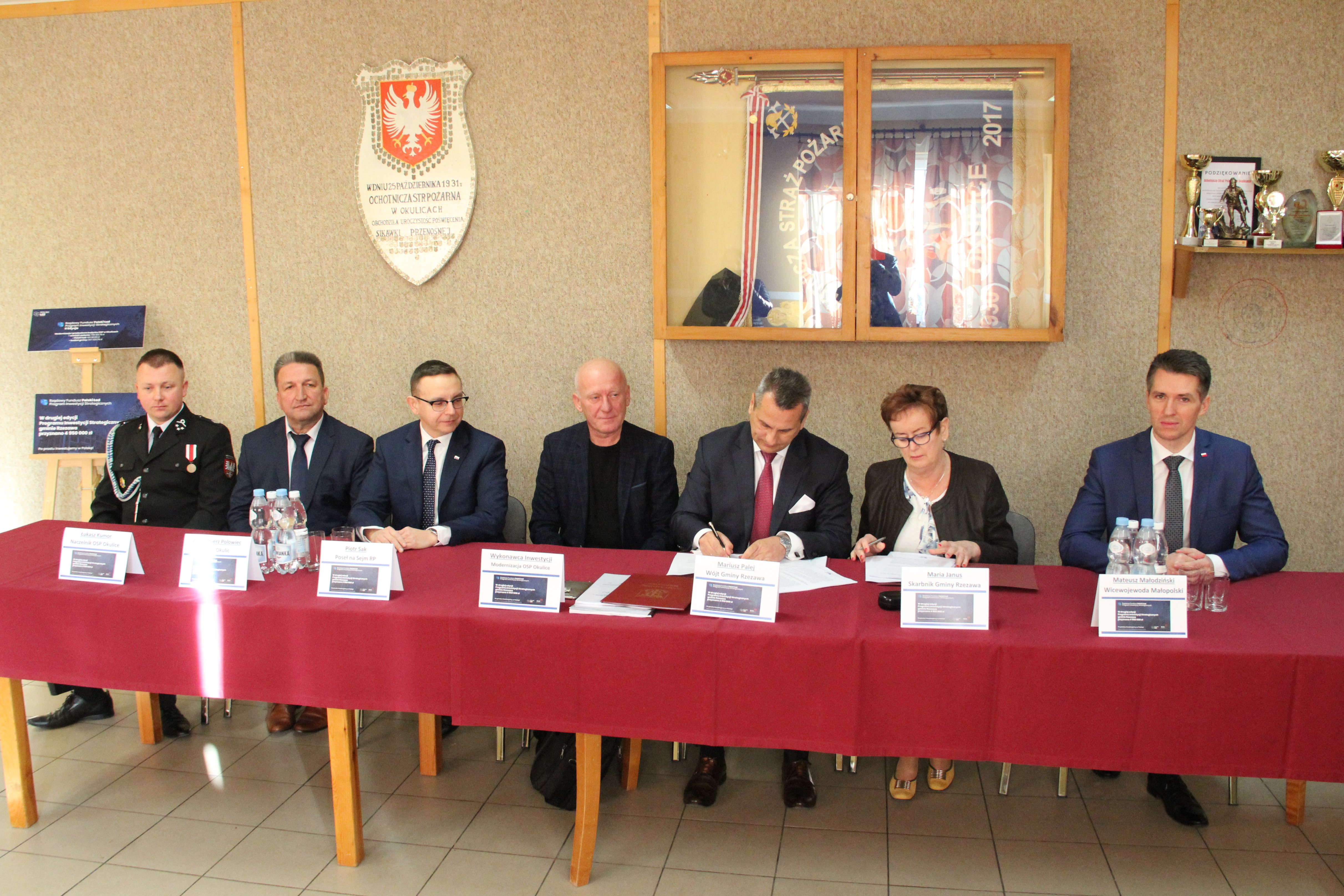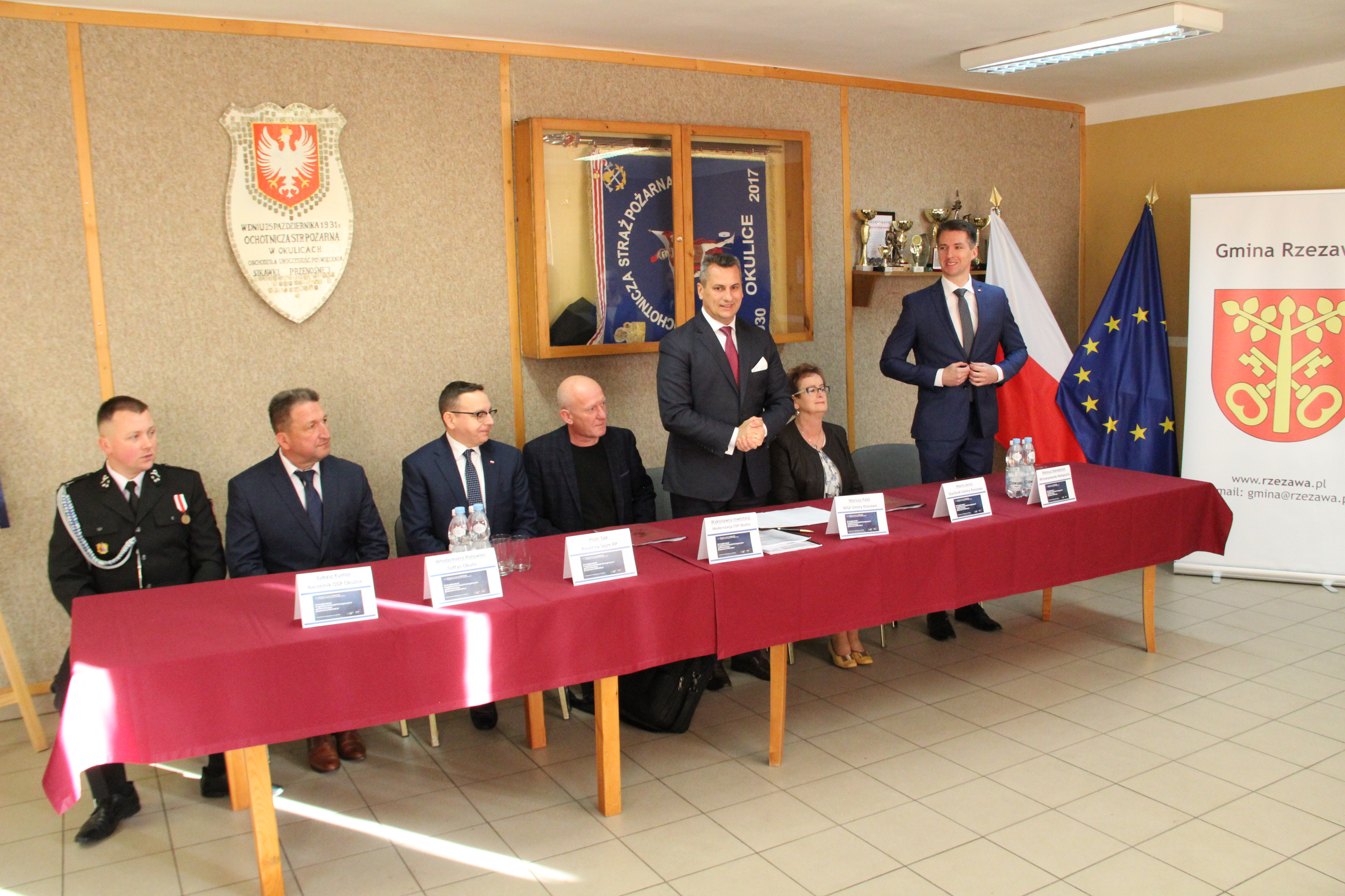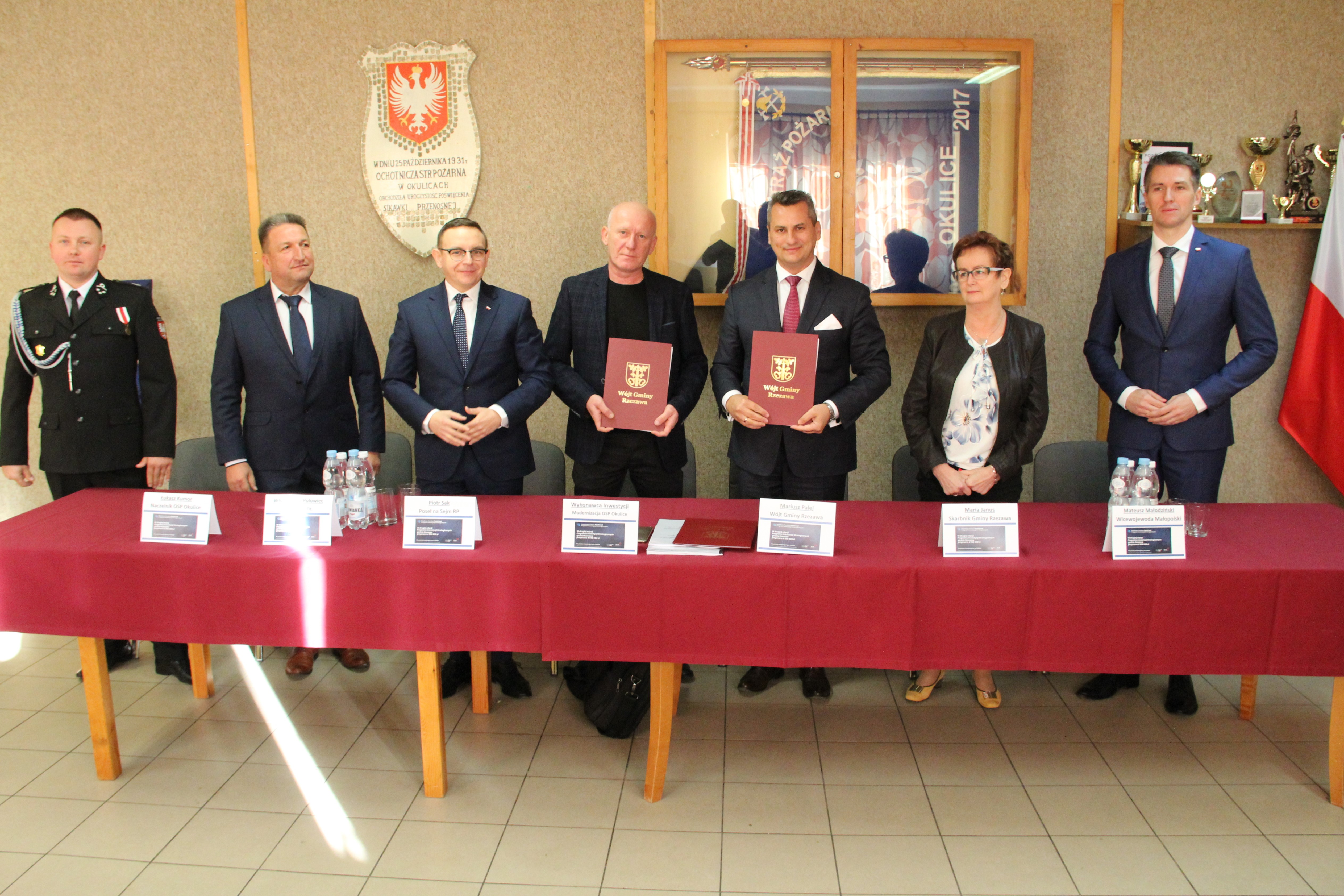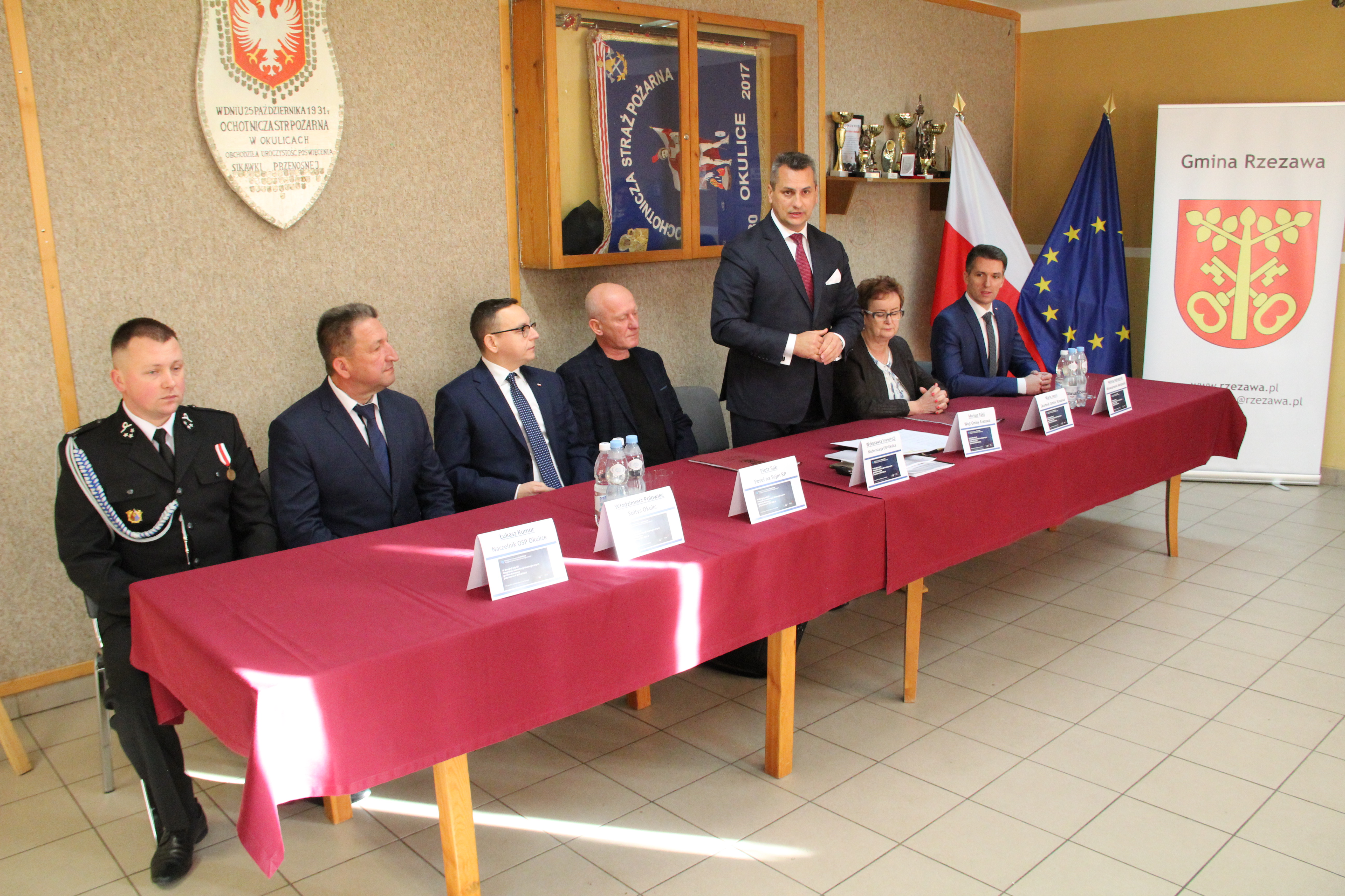 W uroczystym podpisaniu umowy, które odbyło się w budynku remizy w Okulicach, wzięli udział: Poseł na Sejm RP Piotr Sak, Wicewojewoda Małopolski Mateusz Małodziński, Wójt Gminy Rzezawa Mariusz Palej, Skarbnik Gminy Maria Janus, Sołtys Okulic Włodzimierz Polowiec, Naczelnik OSP Okulice Łukasz Kumor oraz Wykonawca inwestycji.
