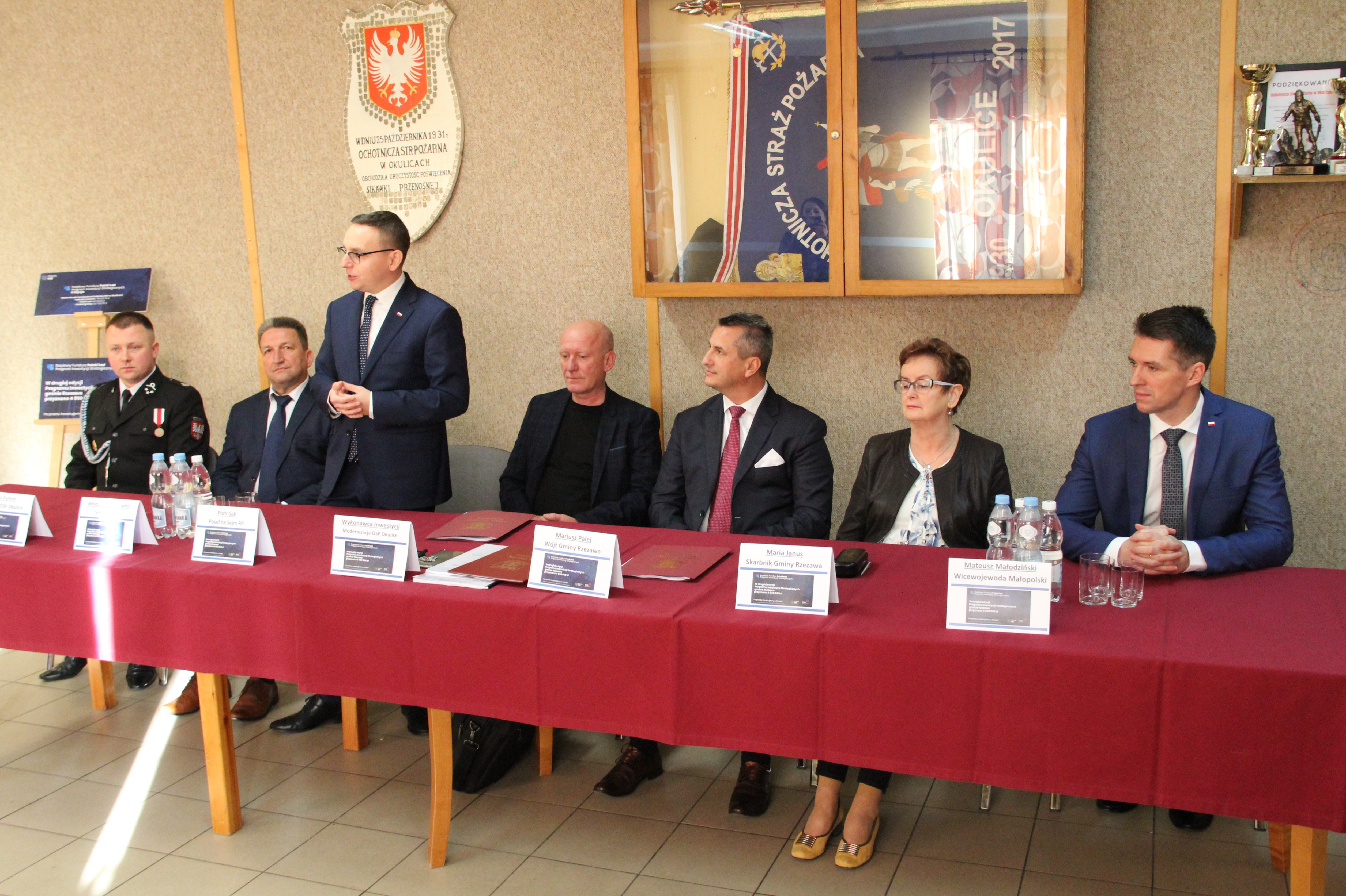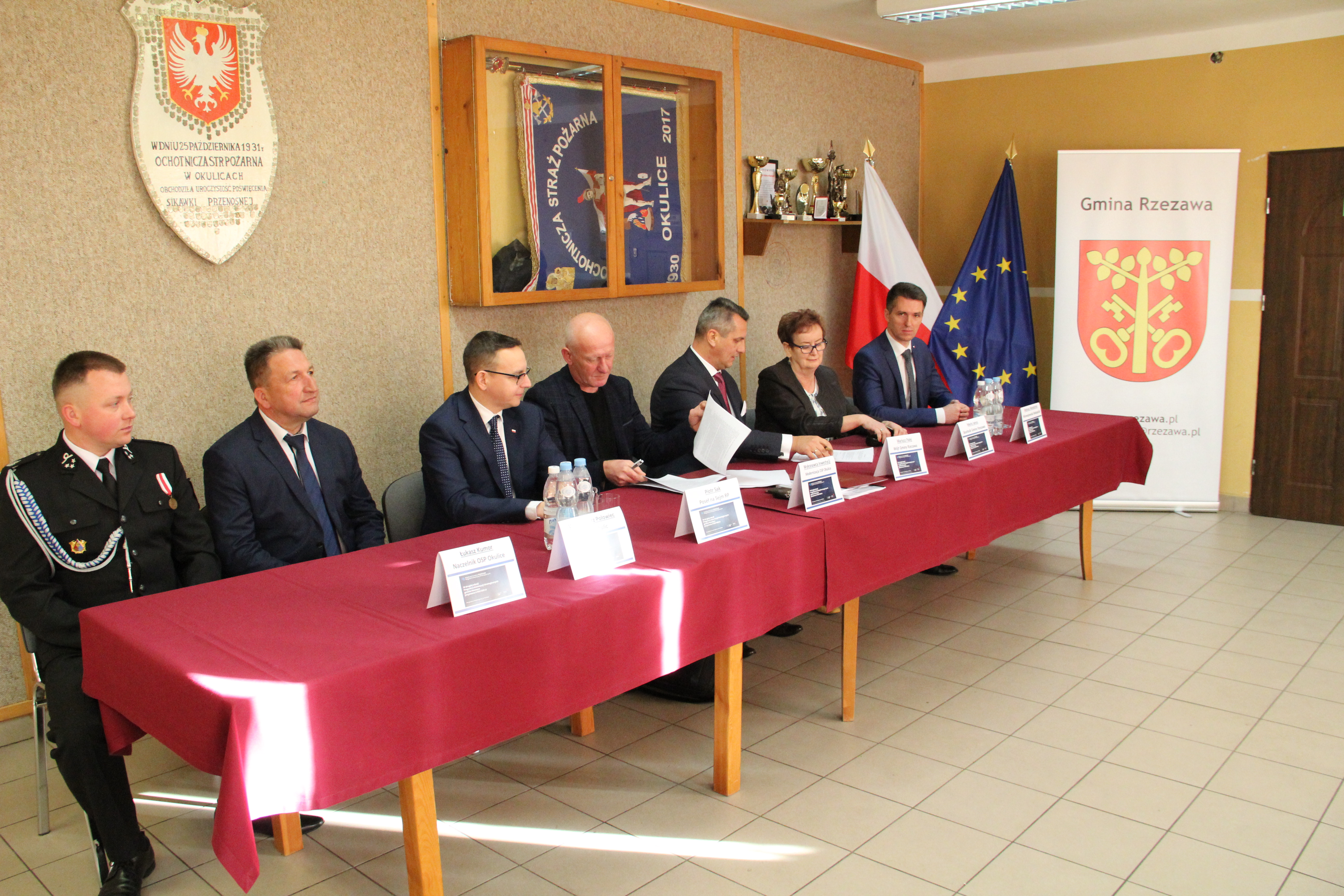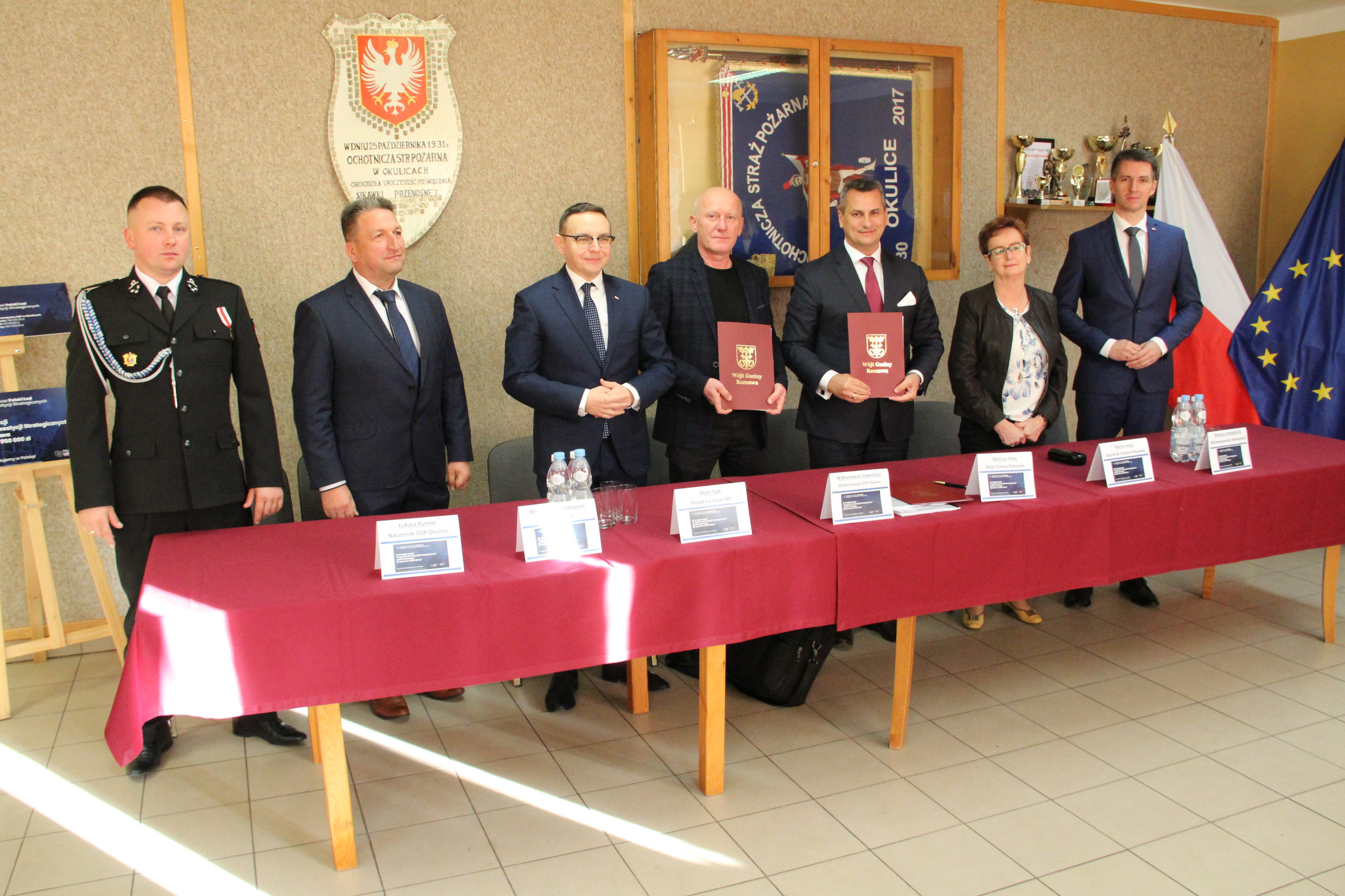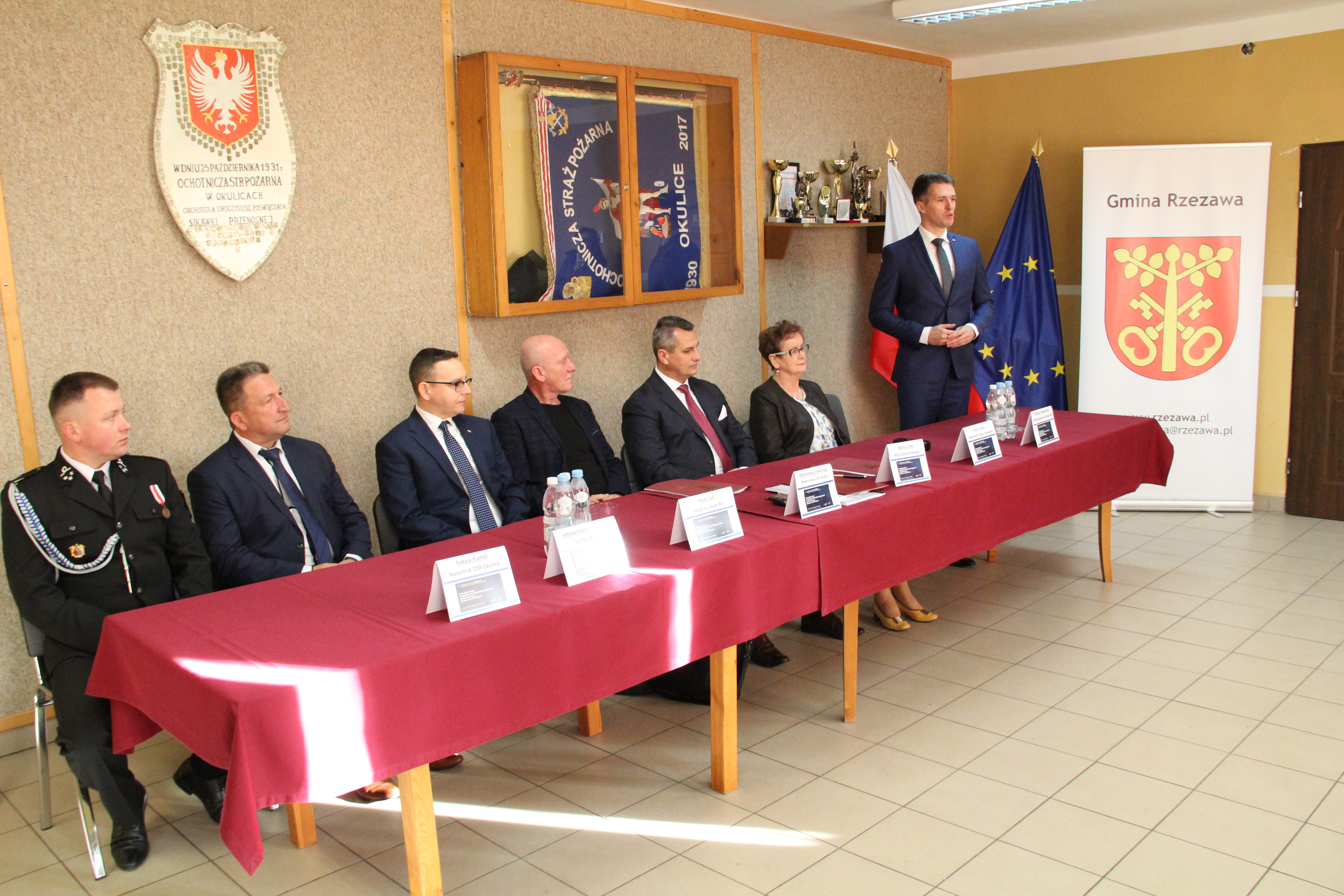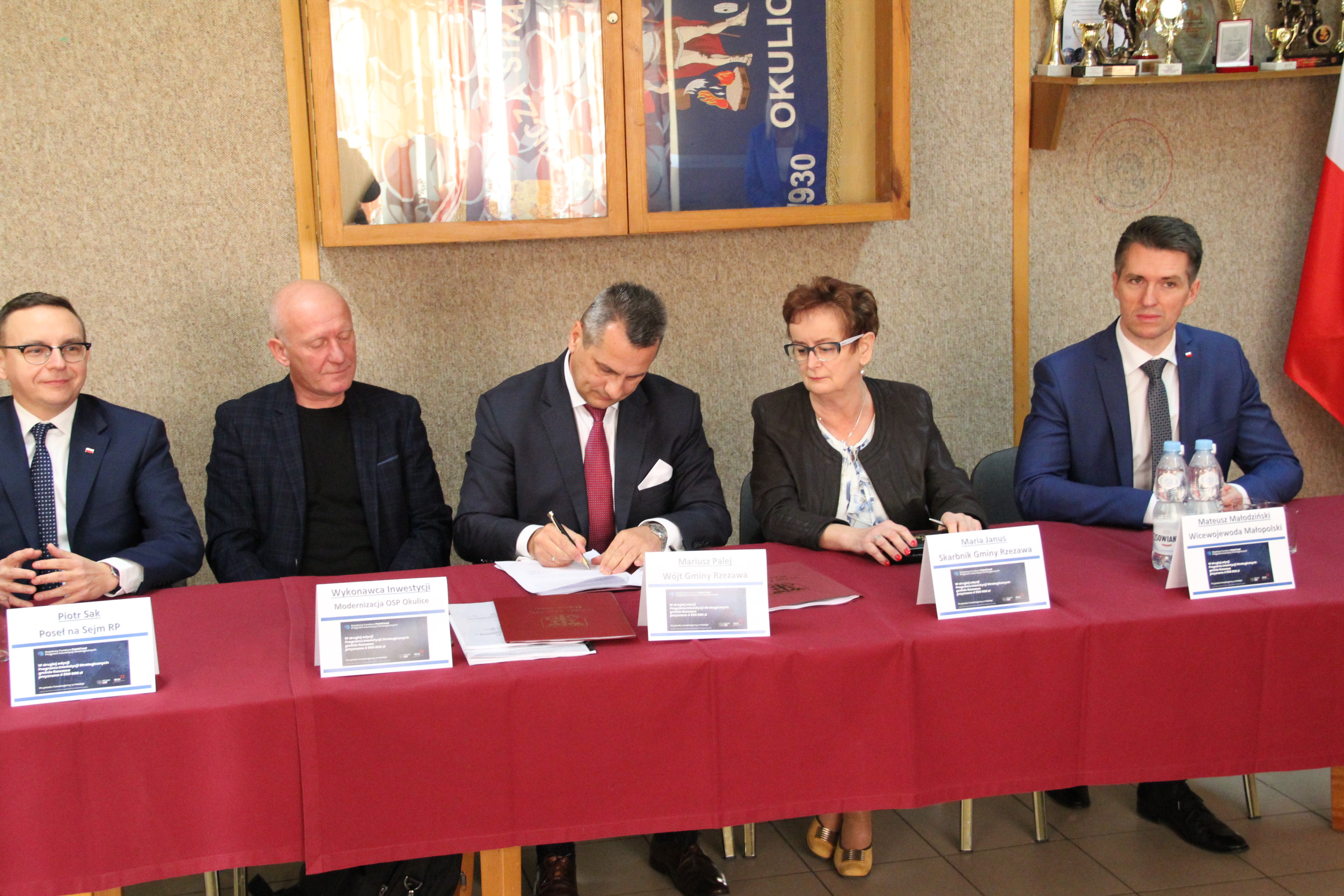 W uroczystym podpisaniu umowy, które odbyło się w budynku remizy w Okulicach, wzięli udział: Poseł na Sejm RP Piotr Sak, Wicewojewoda Małopolski Mateusz Małodziński, Wójt Gminy Rzezawa Mariusz Palej, Skarbnik Gminy Maria Janus, Sołtys Okulic Włodzimierz Polowiec, Naczelnik OSP Okulice Łukasz Kumor oraz Wykonawca inwestycji.