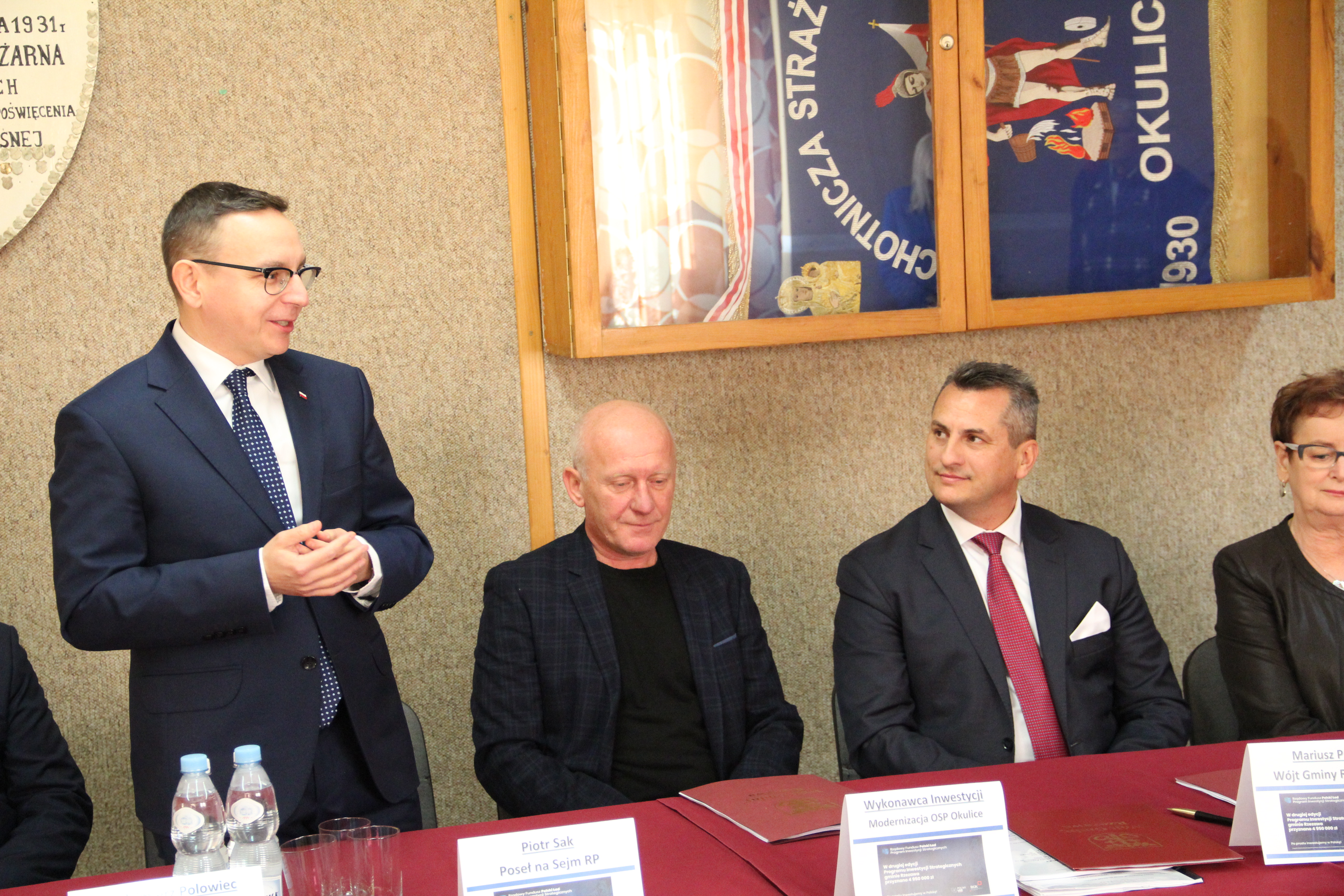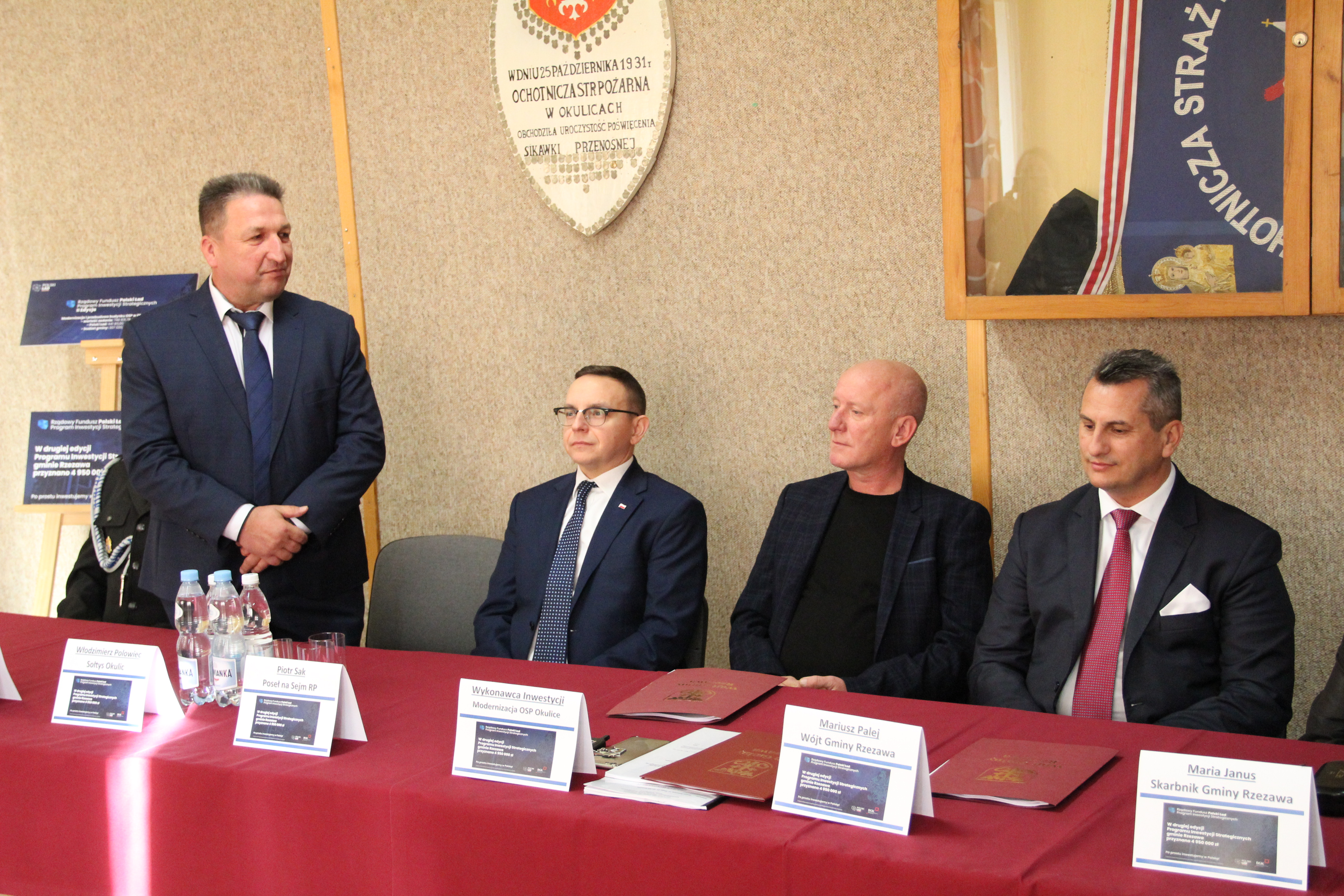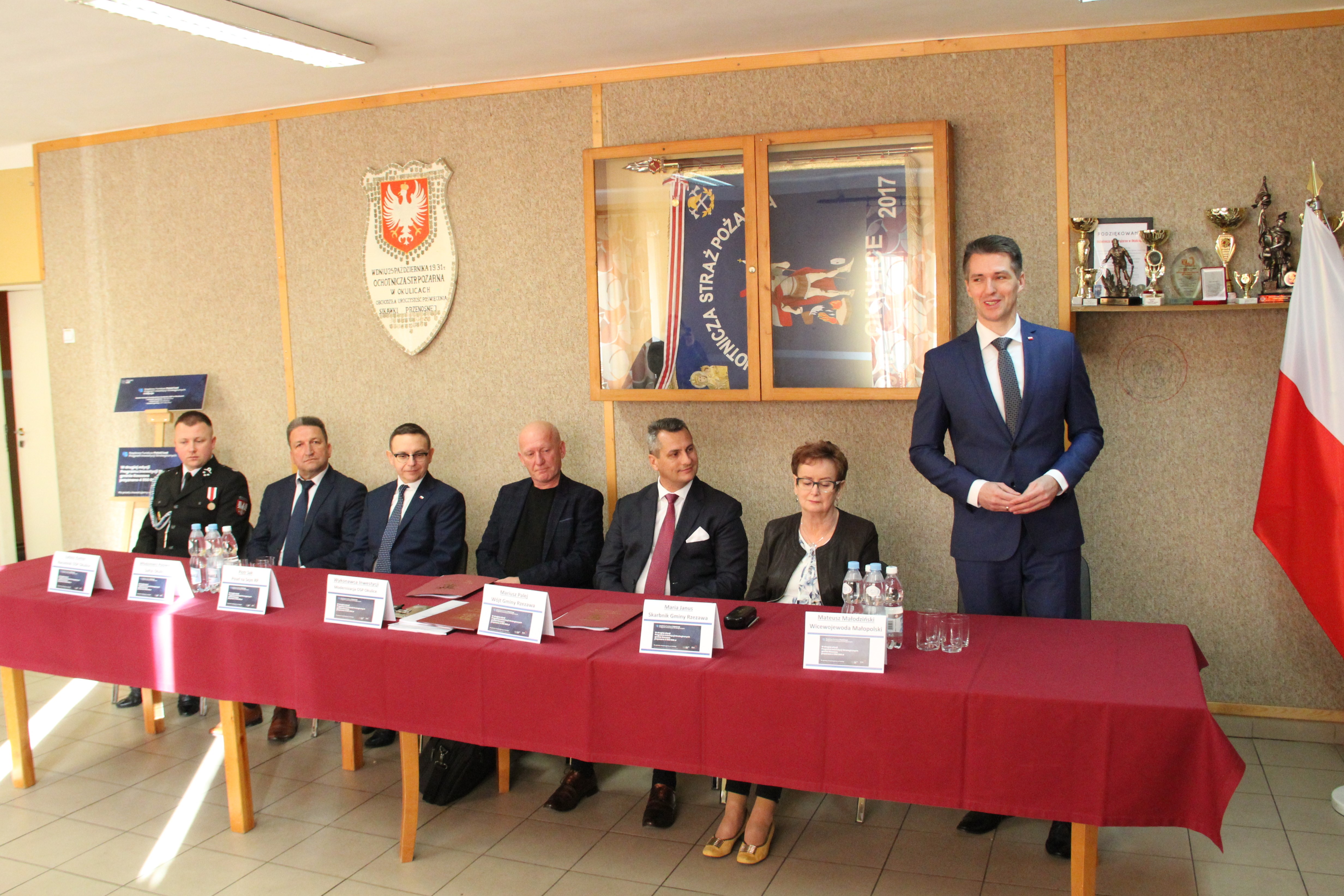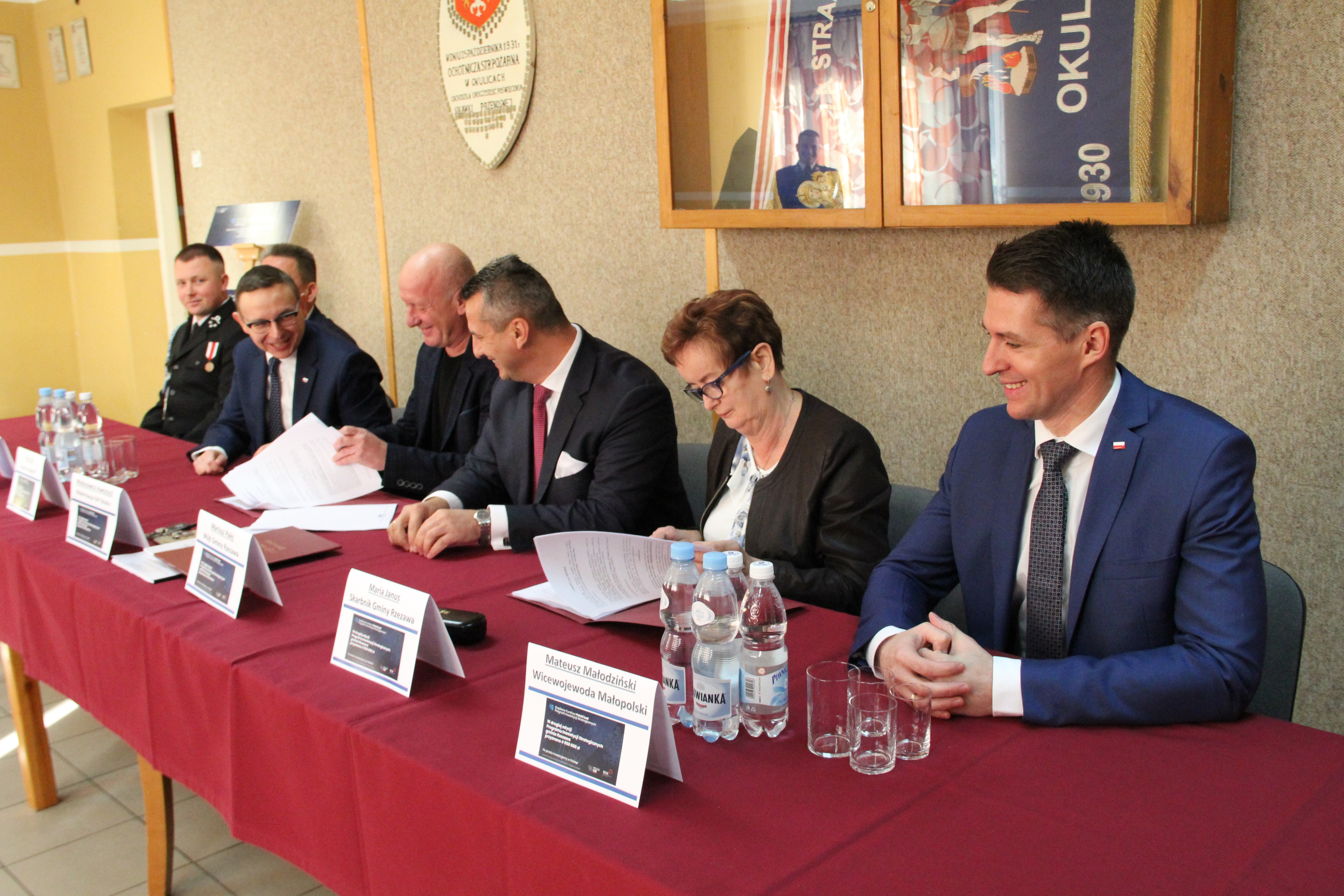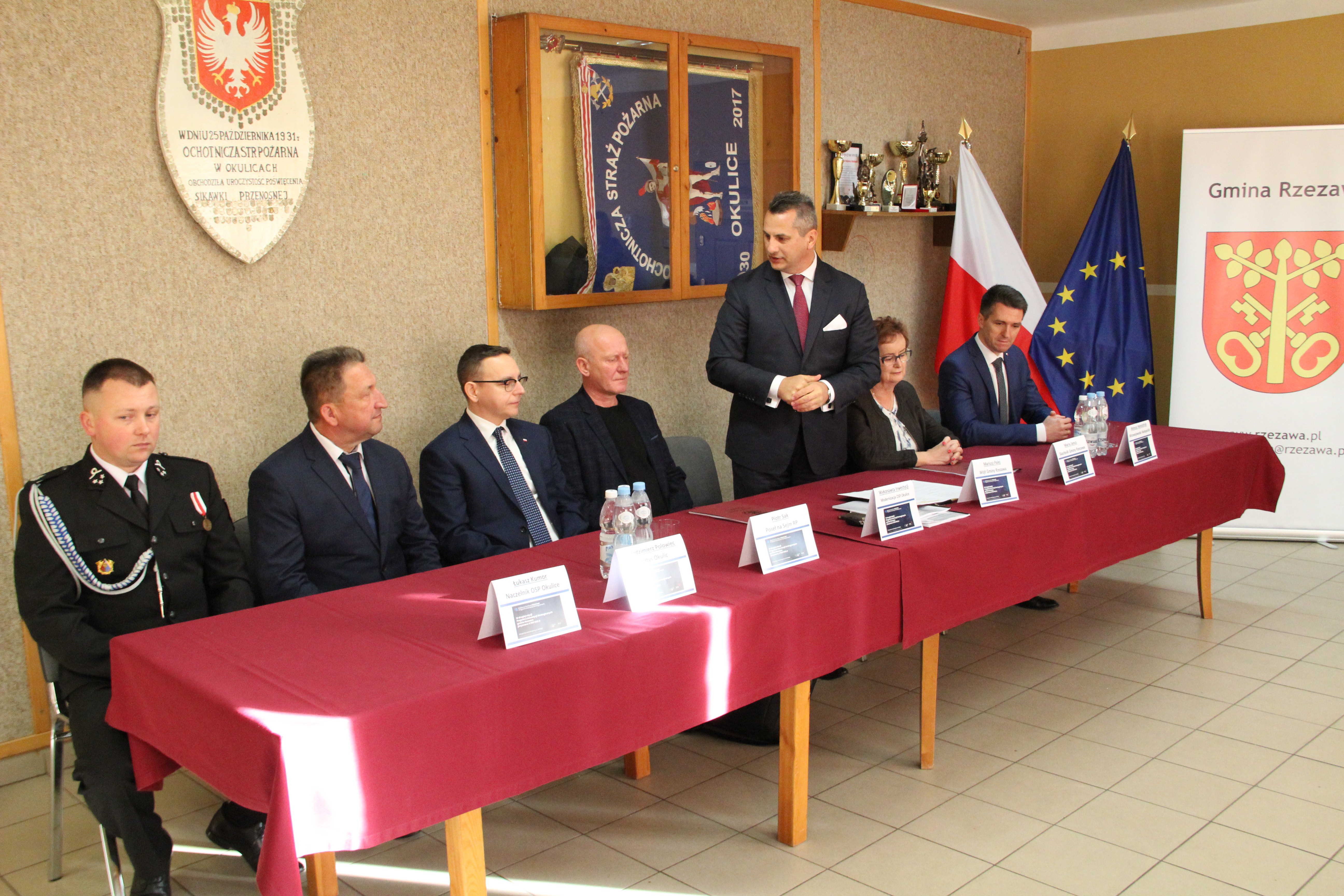 W uroczystym podpisaniu umowy, które odbyło się w budynku remizy w Okulicach, wzięli udział: Poseł na Sejm RP Piotr Sak, Wicewojewoda Małopolski Mateusz Małodziński, Wójt Gminy Rzezawa Mariusz Palej, Skarbnik Gminy Maria Janus, Sołtys Okulic Włodzimierz Polowiec, Naczelnik OSP Okulice Łukasz Kumor oraz Wykonawca inwestycji.