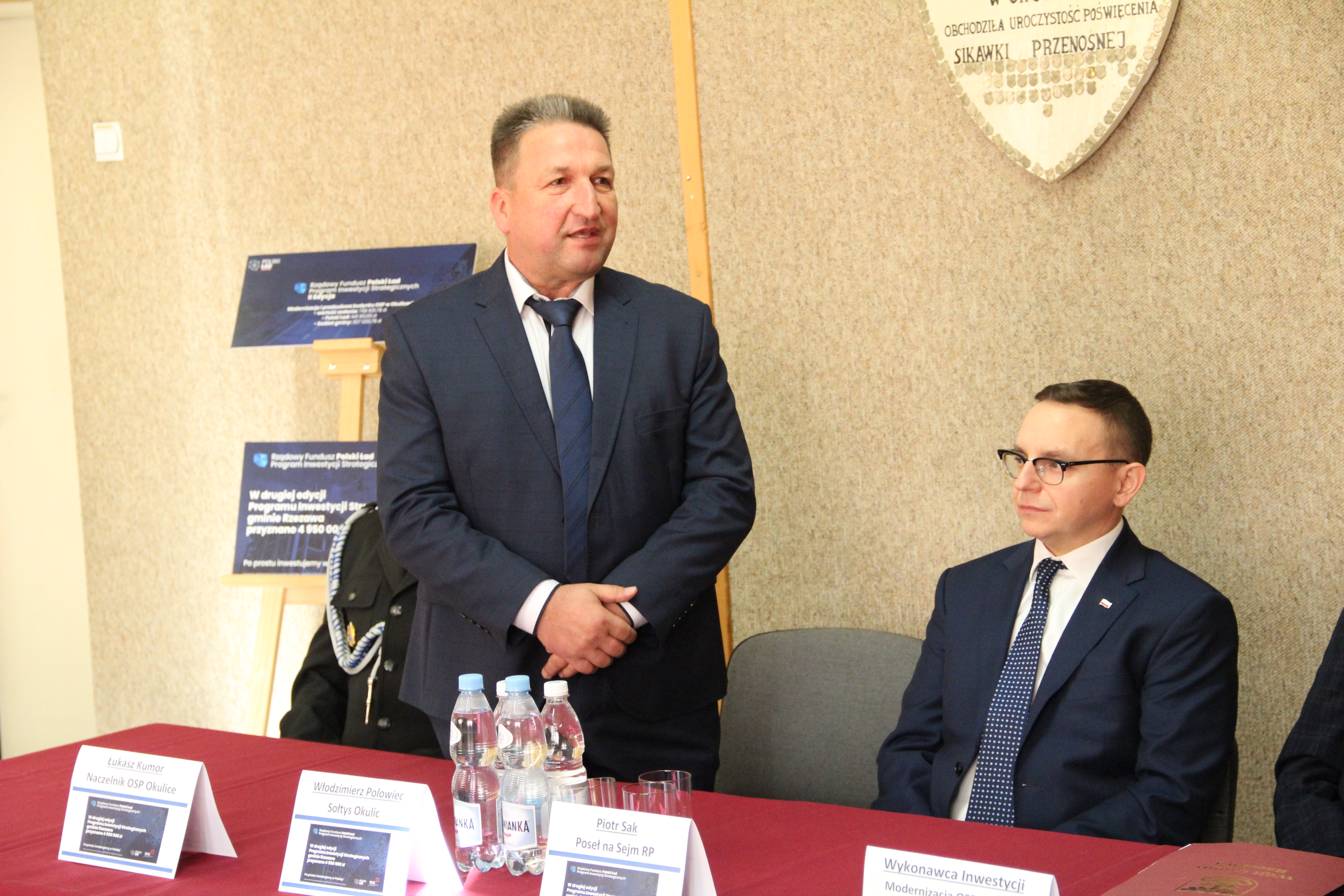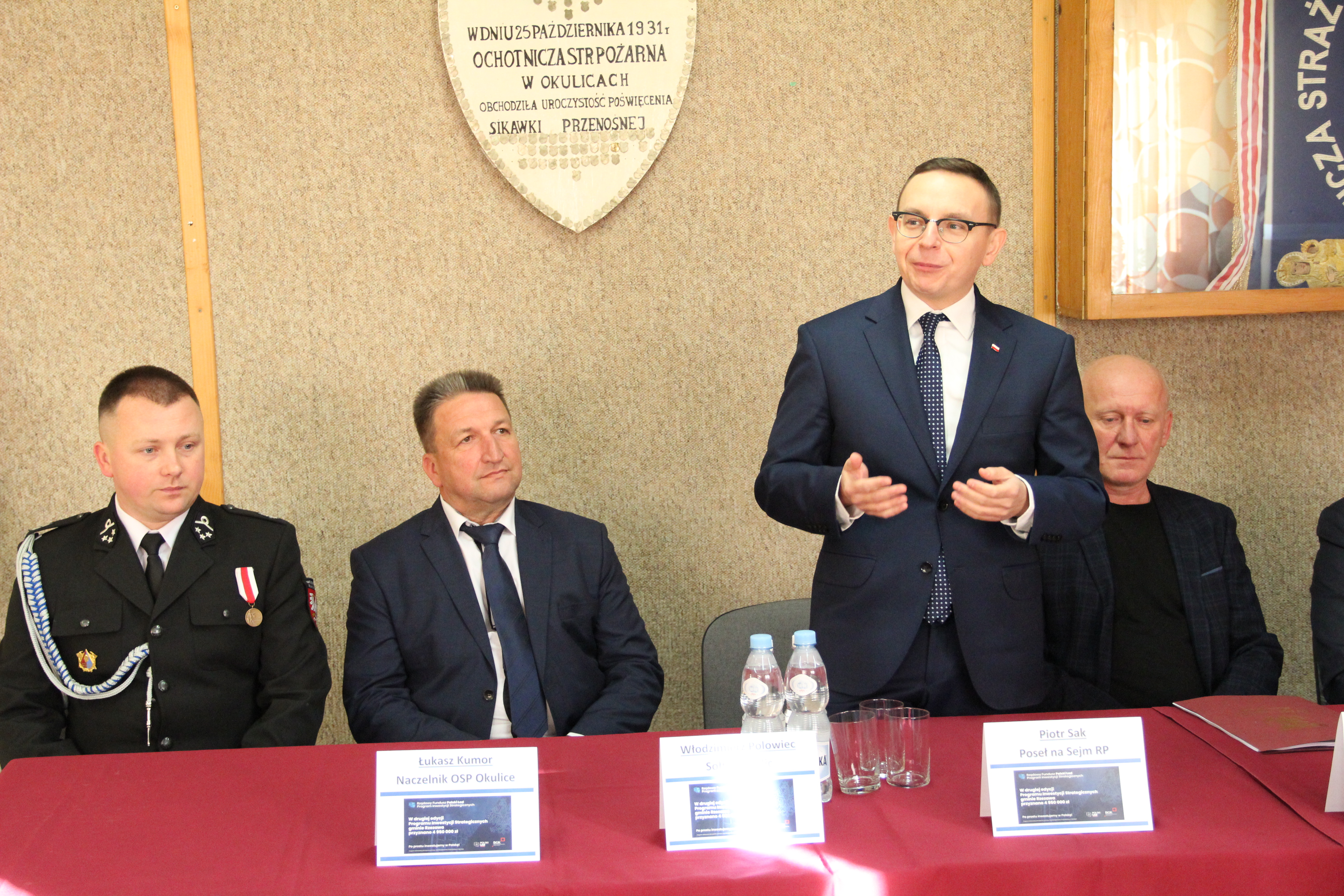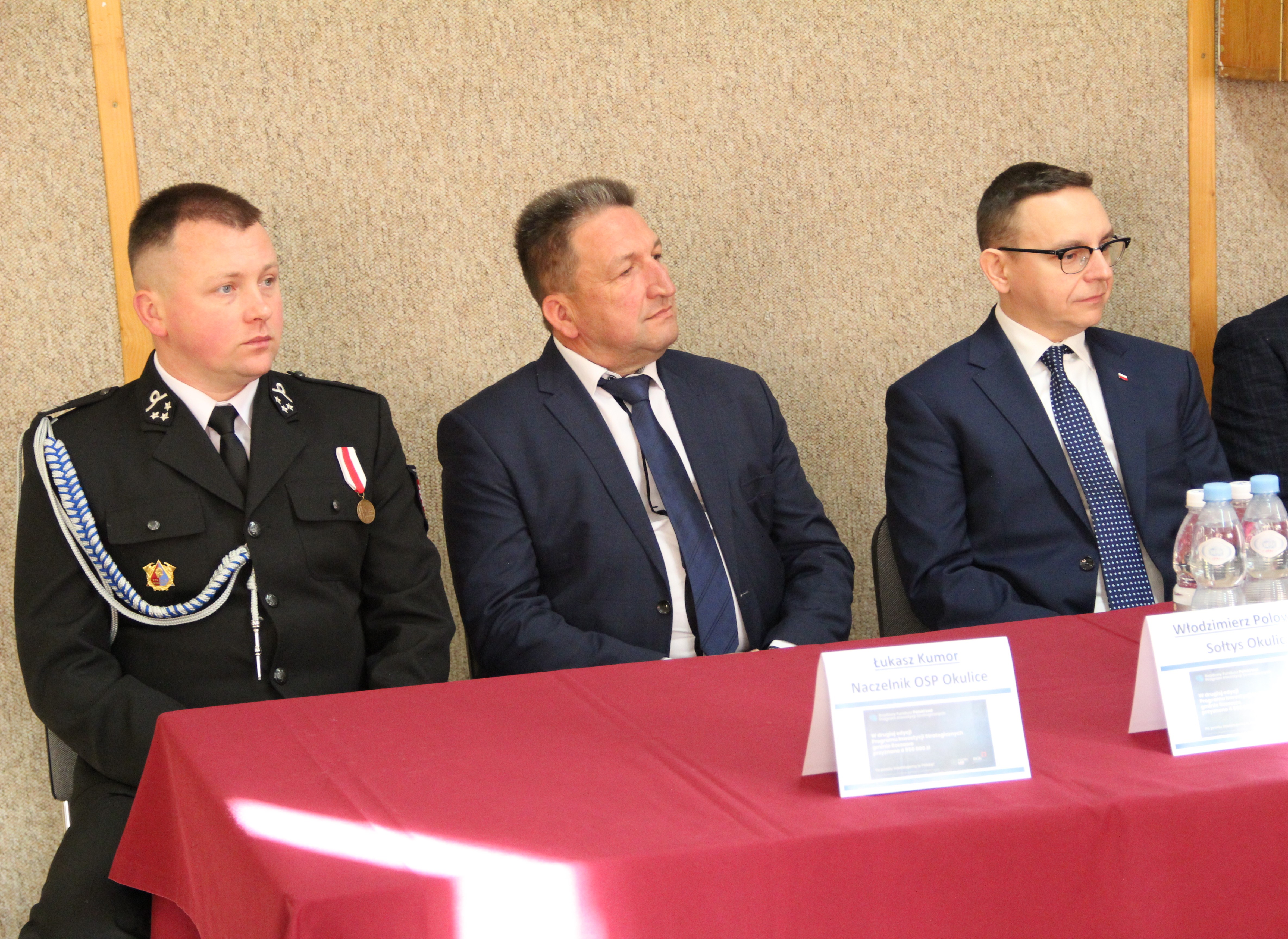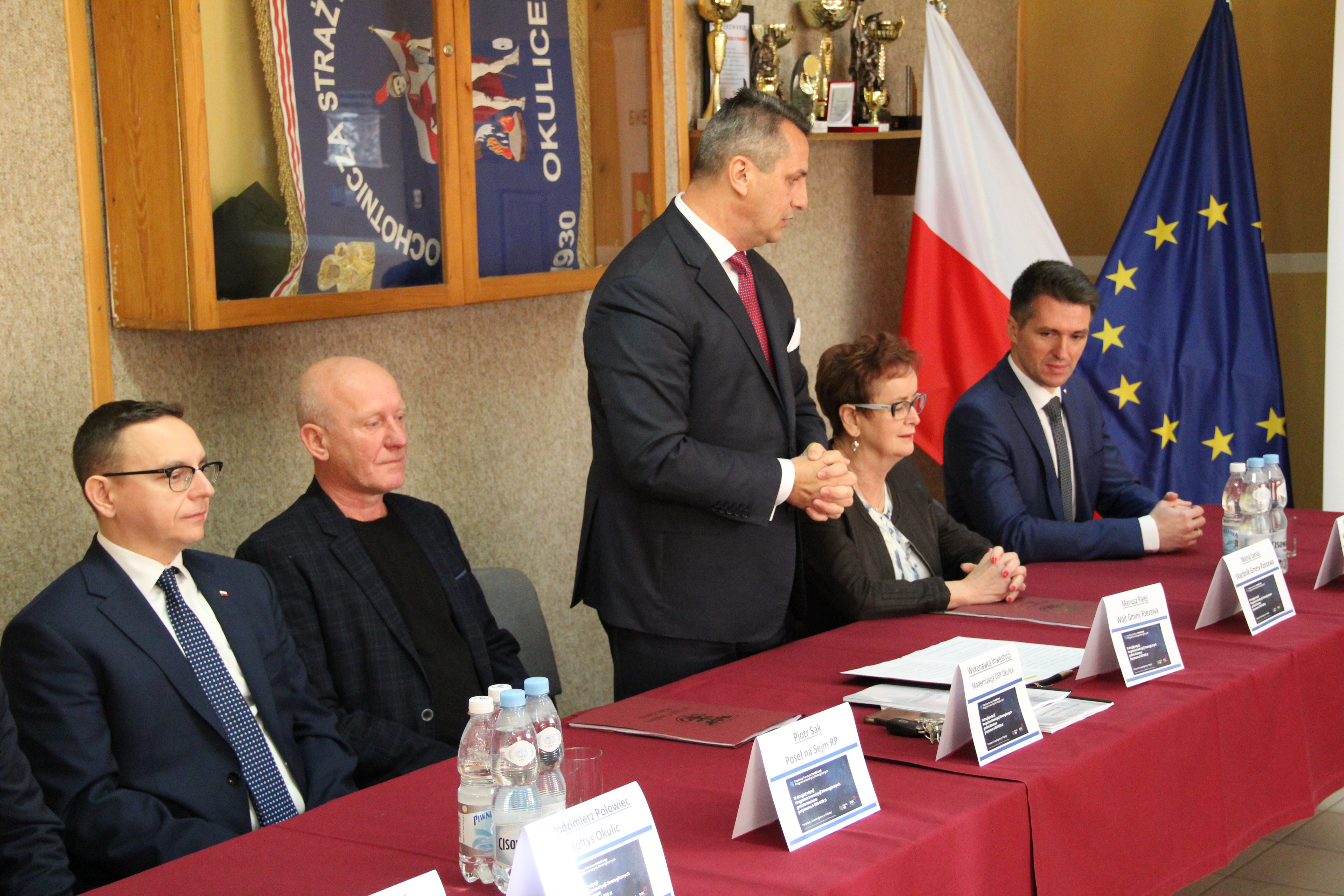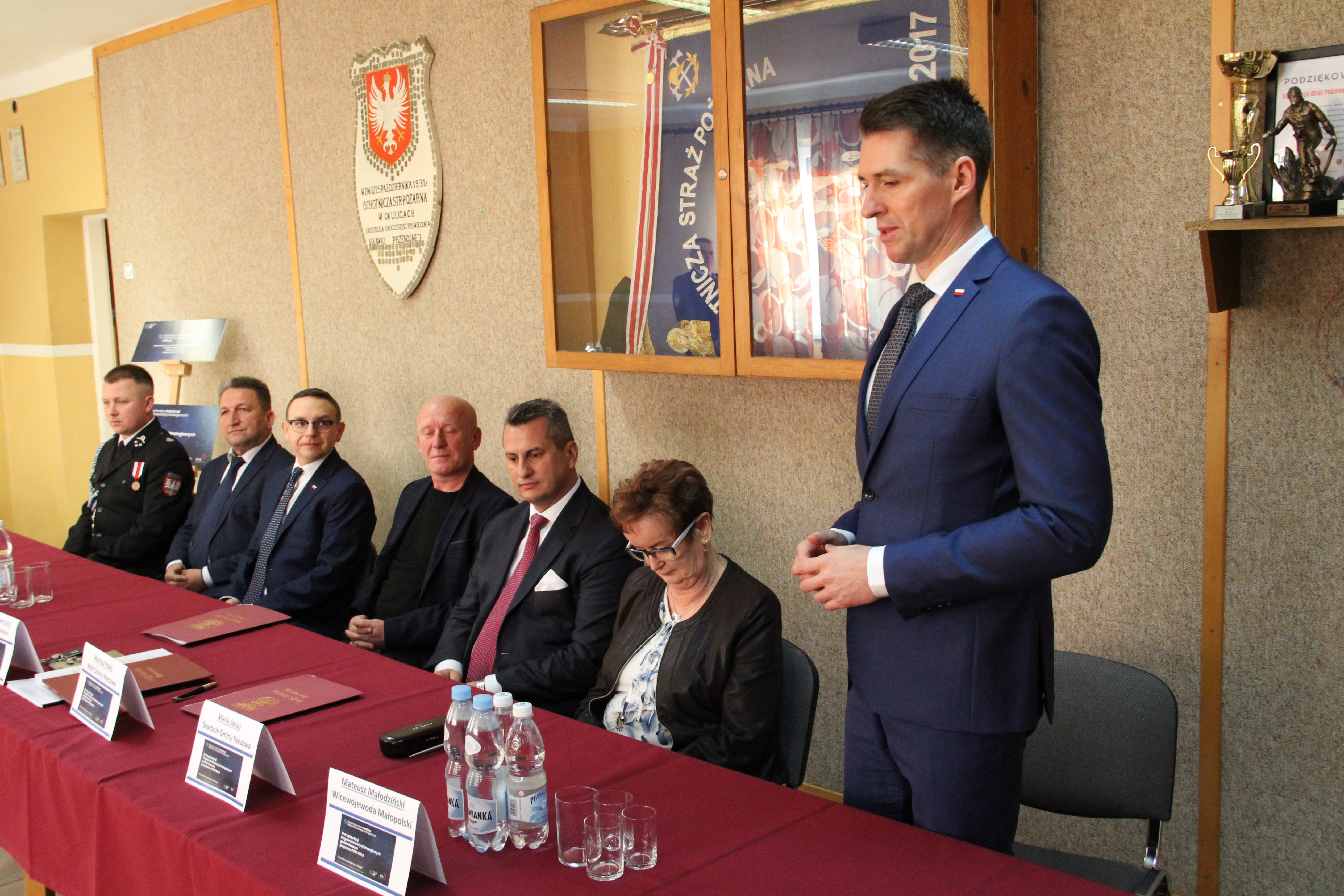 W uroczystym podpisaniu umowy, które odbyło się w budynku remizy w Okulicach, wzięli udział: Poseł na Sejm RP Piotr Sak, Wicewojewoda Małopolski Mateusz Małodziński, Wójt Gminy Rzezawa Mariusz Palej, Skarbnik Gminy Maria Janus, Sołtys Okulic Włodzimierz Polowiec, Naczelnik OSP Okulice Łukasz Kumor oraz Wykonawca inwestycji.