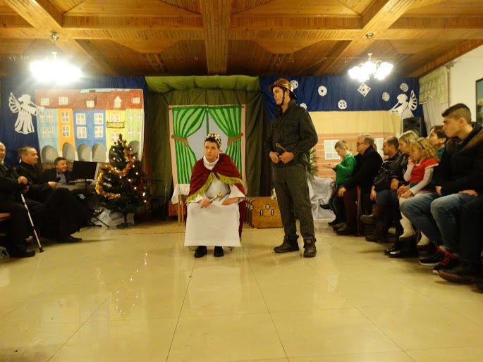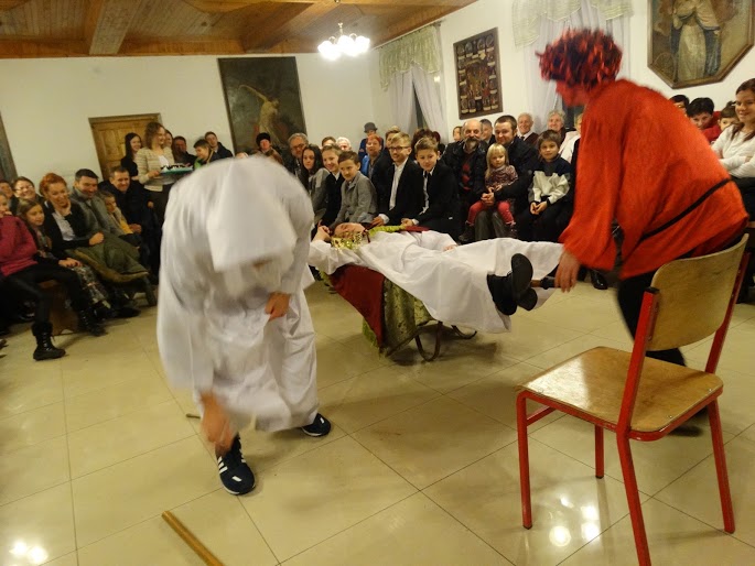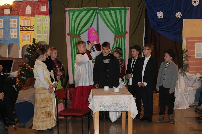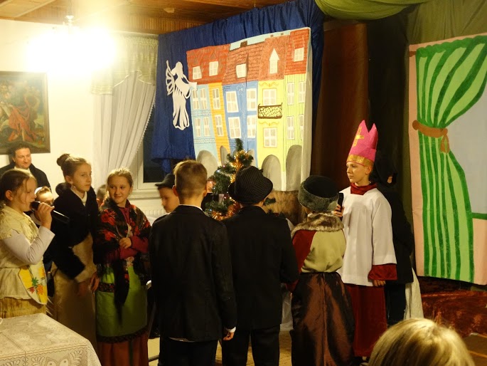 Kolejną częścią był spektakl Grupy Teatralnej „Lustro” ukazujący zebranym życie św. Mikołaja Biskupa. Dzieci wprowadziły zebranych w świat, który pokazał, iż obok nas powinniśmy zauważać drugiego człowieka. Niejednokrotnie w natłoku spraw nie widzimy potrzebujących. Zawsze możemy stać się „Mikołajem” który niesie pomoc drugiemu człowiekowi. Barwne stroje i odpowiednia inscenizacja sprawiły, że wszyscy zgromadzeni poczuli się jak w prawdziwym teatrze.