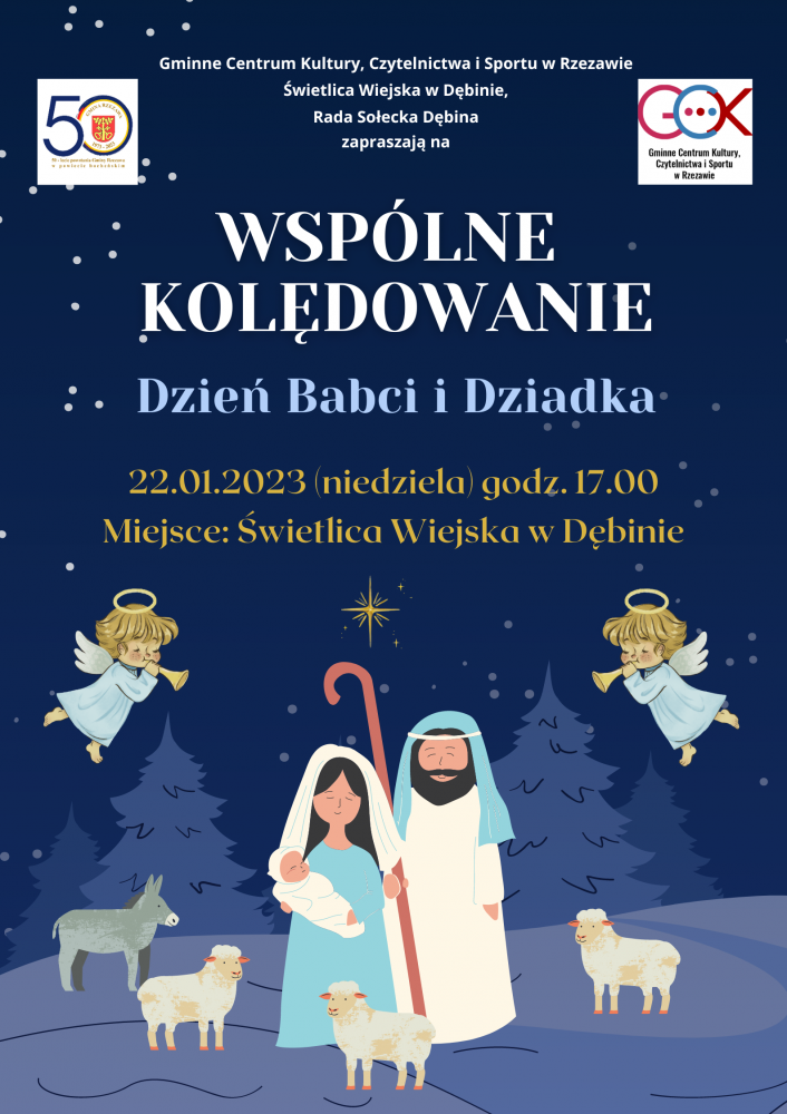 Zapraszamy na Wspólne Kolędowanie z okazji Dnia Babci i Dziadka, które odbędzie się 22 stycznia 2023 r. (niedziela) o godz. 17.00 w Świetlicy Wiejskiej w Dębinie.
