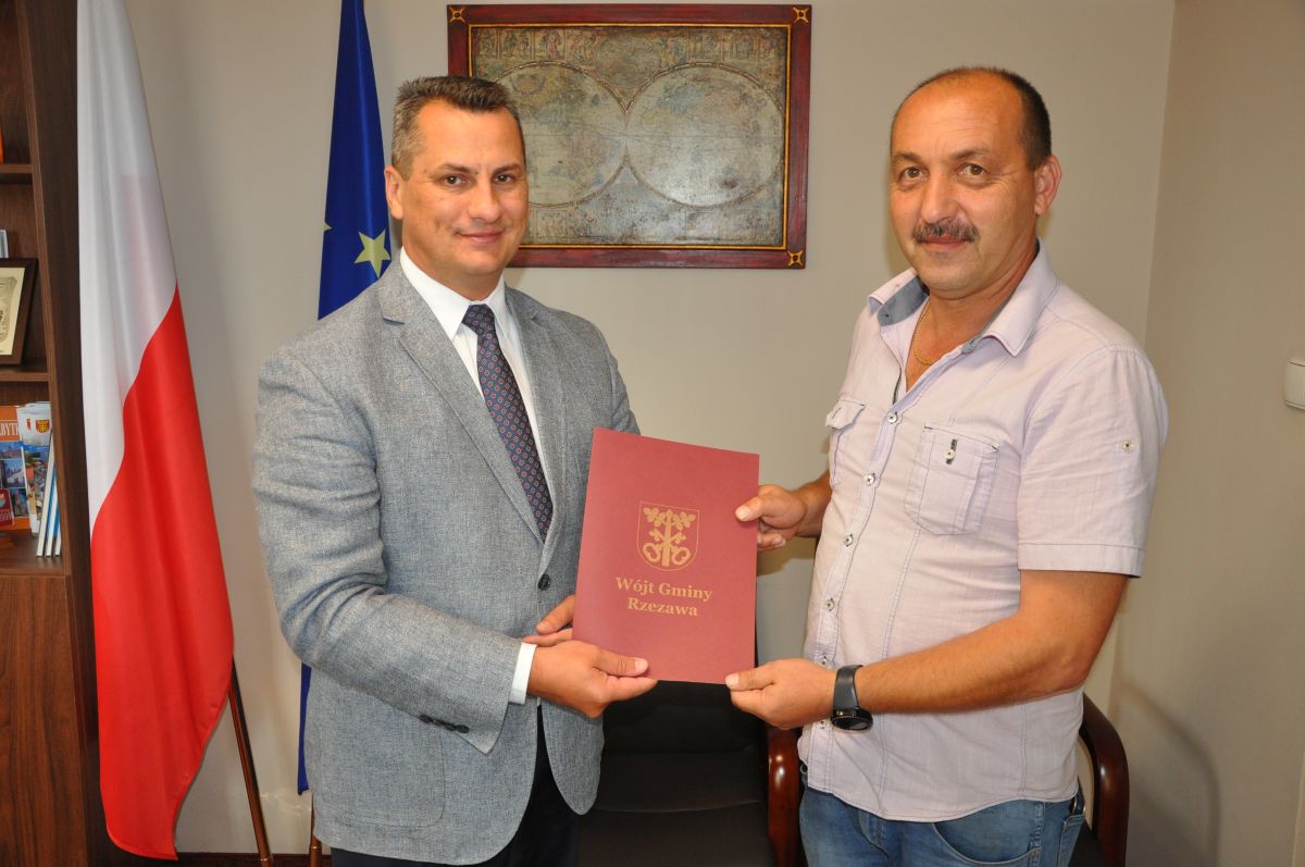 Umowa z wykonawcą budowy nowego boiska sportowego w Łazach została podpisana przez Wójta Mariusza Paleja 21 sierpnia br. w siedzibie Urzędu Gminy Rzezawa. Następnie odbyło się przekazanie placu pod inwestycję, która ma zostać zrealizowana do końca czerwca 2020 roku.