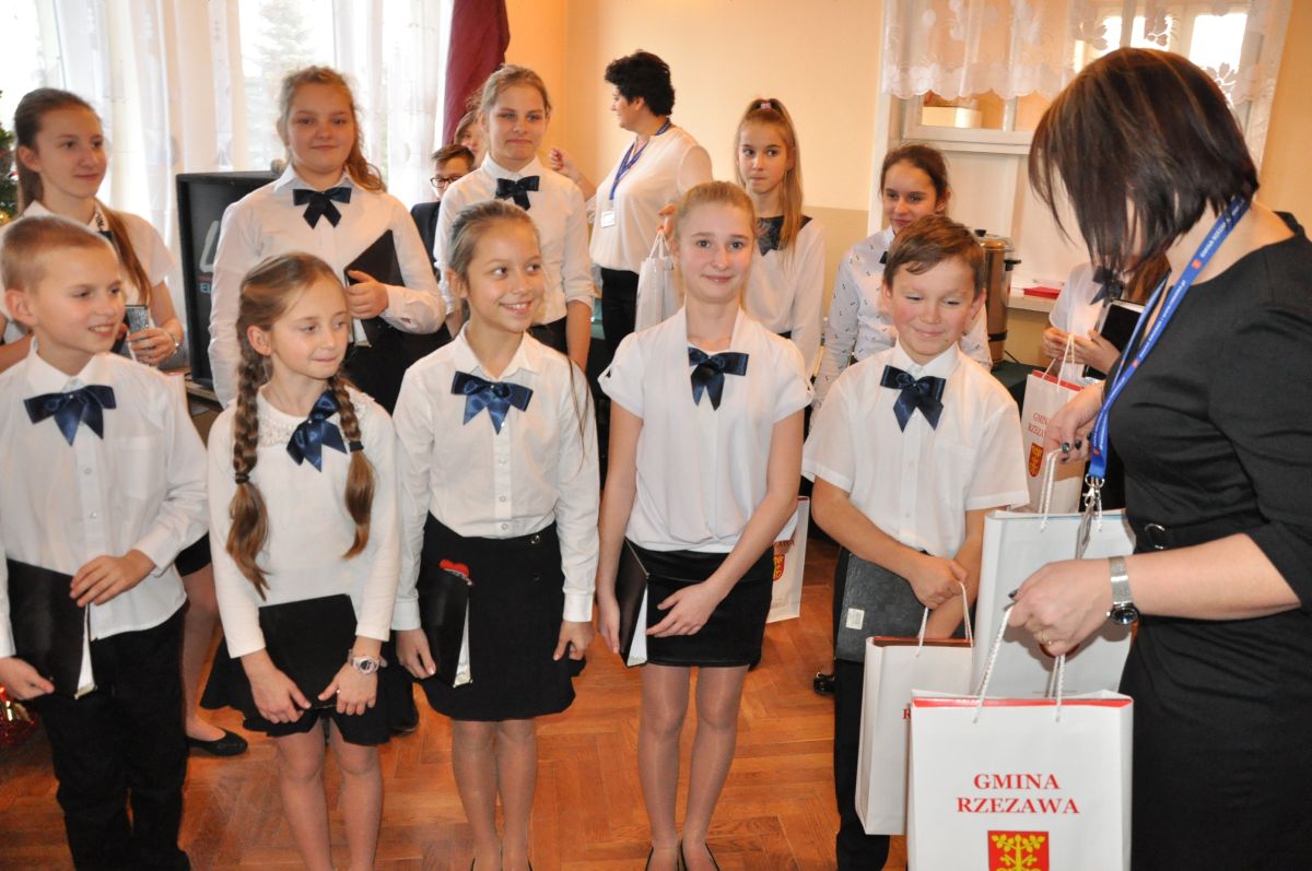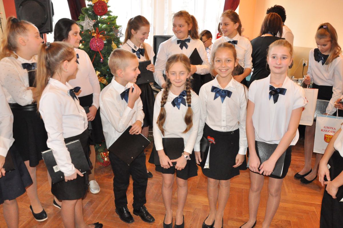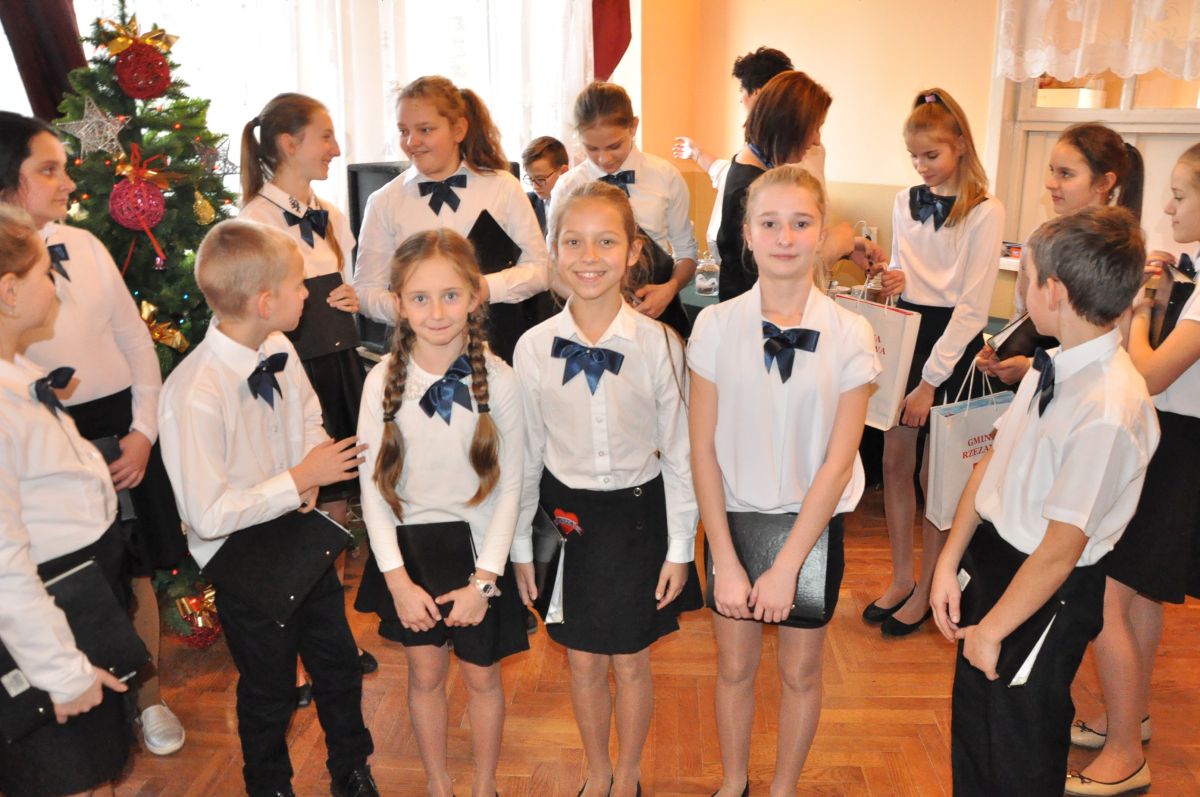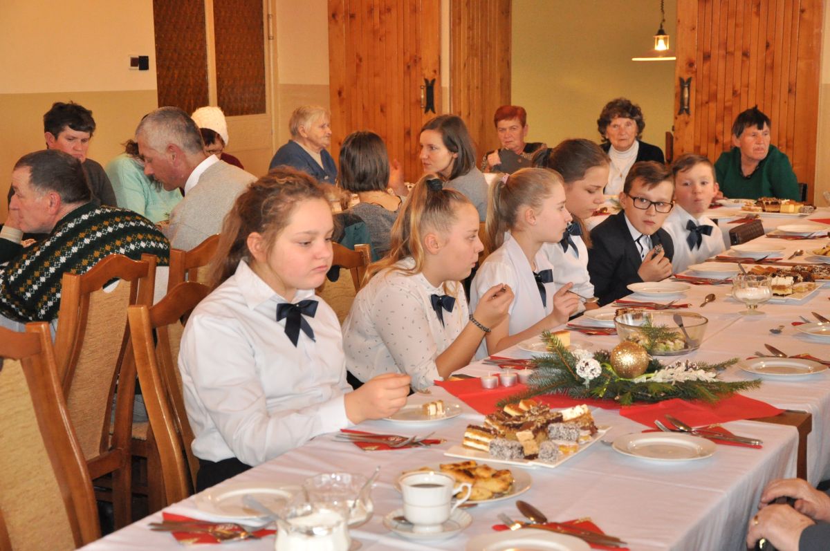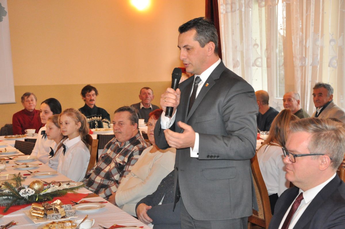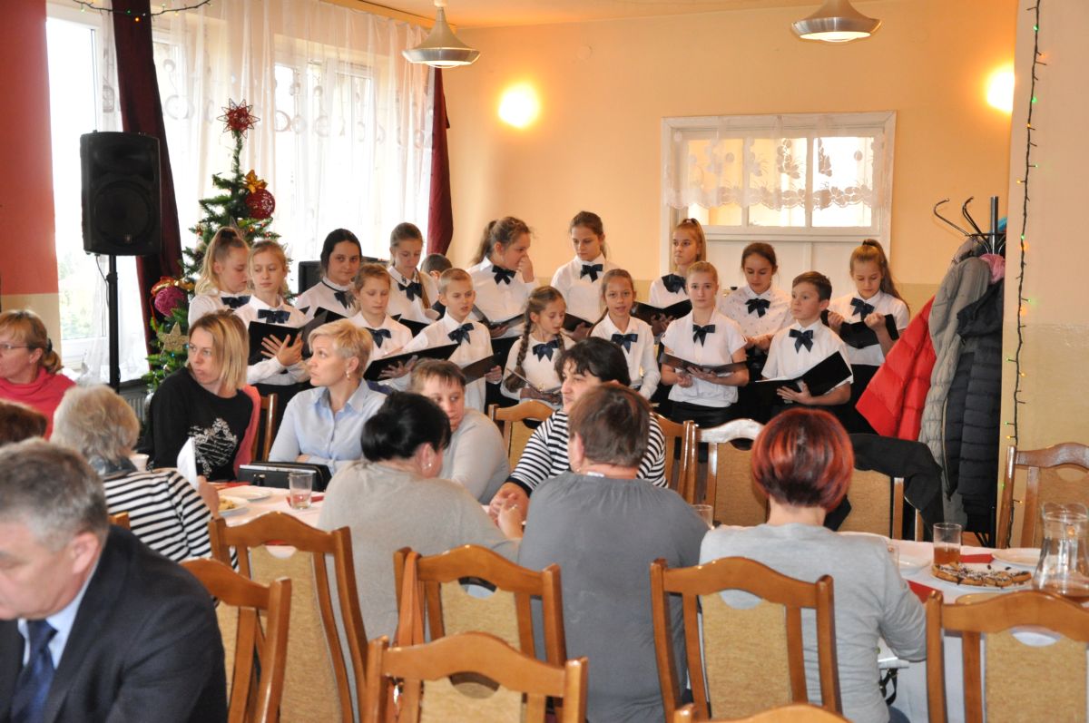 Wójt Gminy Rzezawa wraz kierownikiem GOPS złożyli życzenia świąteczne wszystkim obecnym na wieczerzy wigilijnej. Następnie wszyscy uczestnicy spotkania łamiąc się opłatkiem składali sobie życzenia i kosztowali potraw wigilijnych przygotowanych pod okiem trenera. Świątecznego nastroju dopełnił uczniowski zespół wokalny z PSP w Okulicach im. gen. Leopolda Okulickiego, który pod opieką Dyrektora– P. Zbigniewa Góry wprowadził nas swoimi kolędami w piękny świąteczny nastrój. Na koniec swojego występu uczniowie zostali obdarowani słodyczami.