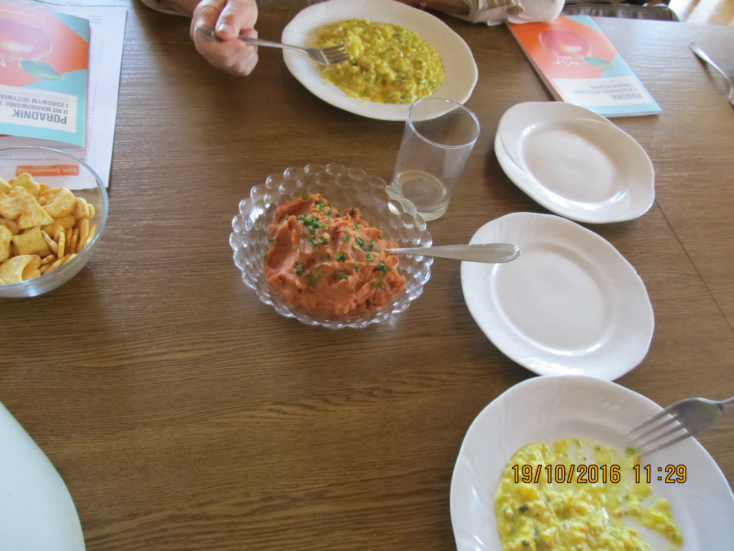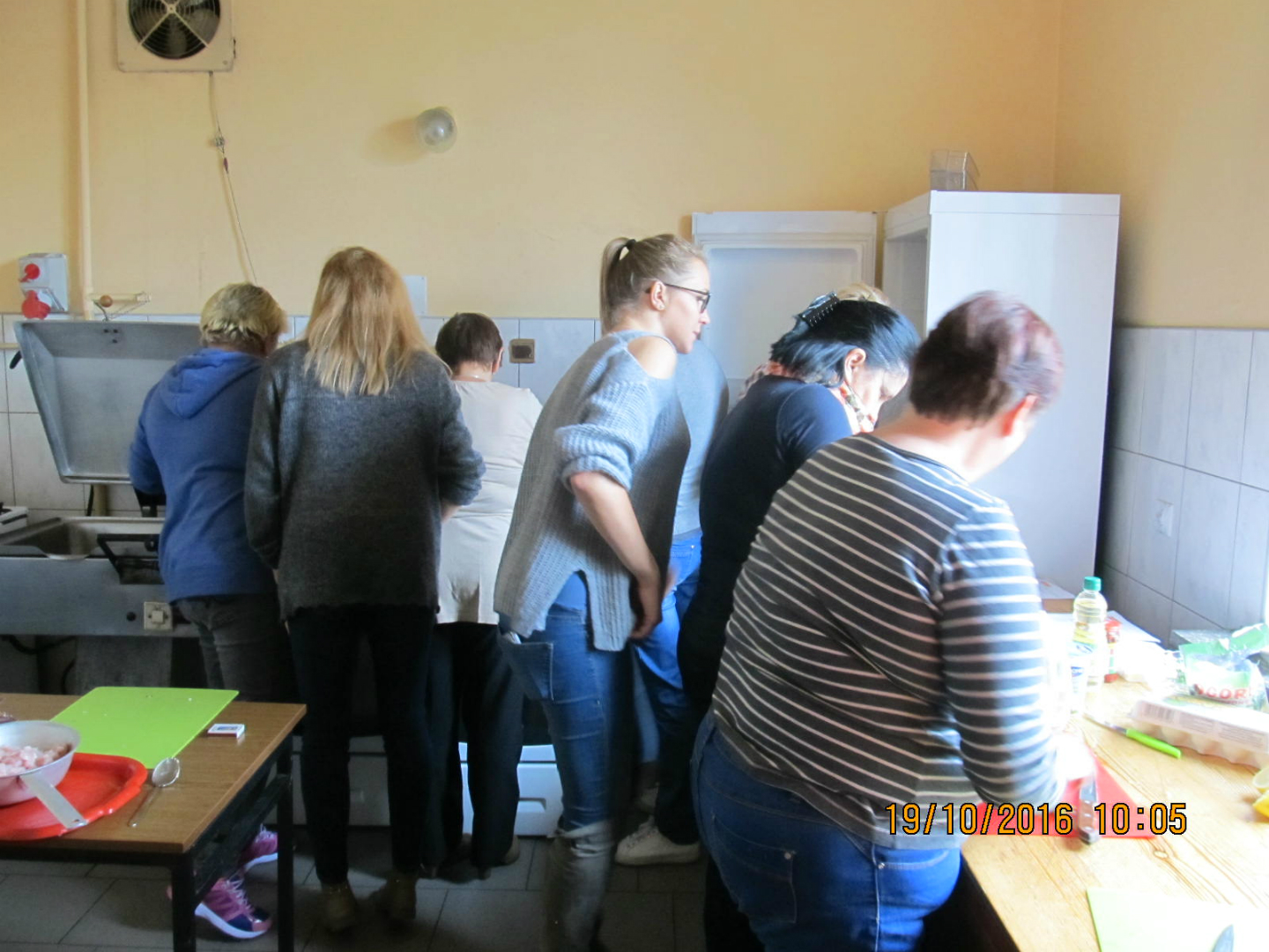 Warsztaty kulinarne poprowadziła trener Pani Justyna Wisła, która wspólnie z uczestnikami przygotowała tanie i smaczne posiłki na bazie produktów z Banku Żywności tj.: pasta z fasoli, pasta z makreli, pasta jajeczna z serem, risotto z kurczakiem i dynią na deser ciasto marchewkowe. Zajęciom praktycznym towarzyszył krótki wykład na temat składu i wartości odżywczych wymienionych potraw oraz zdrowego odżywiania.