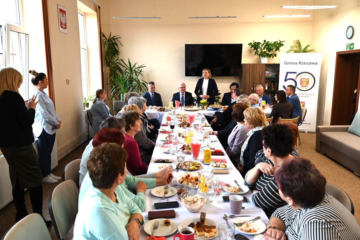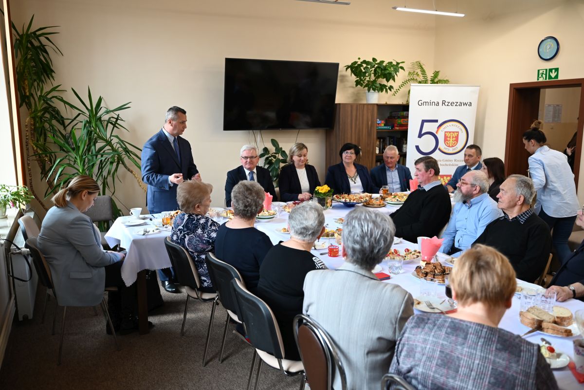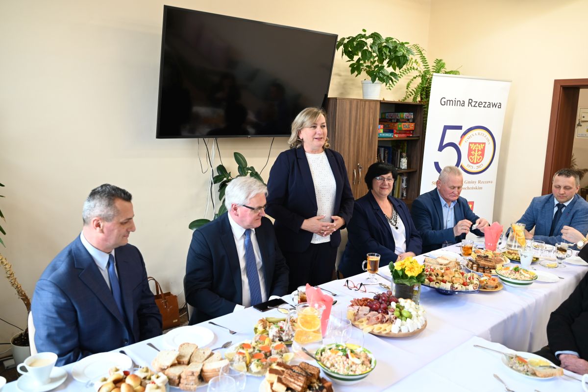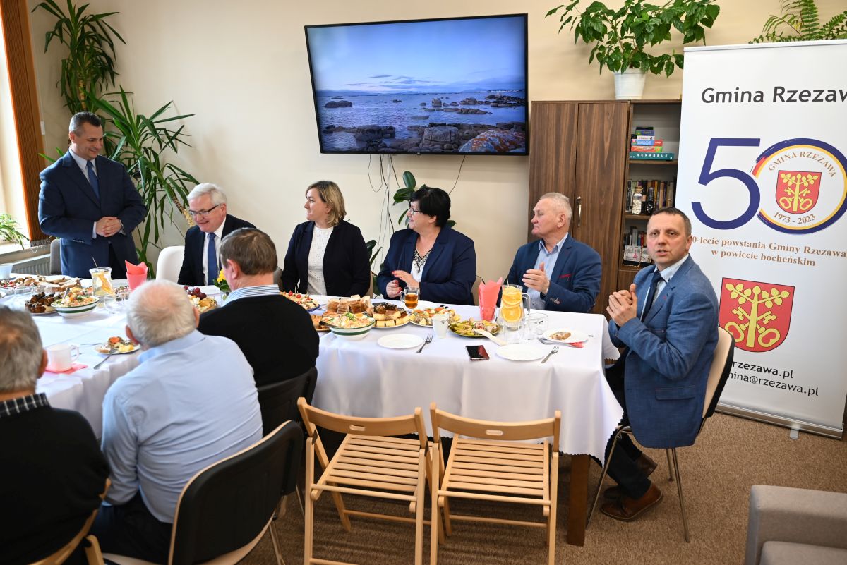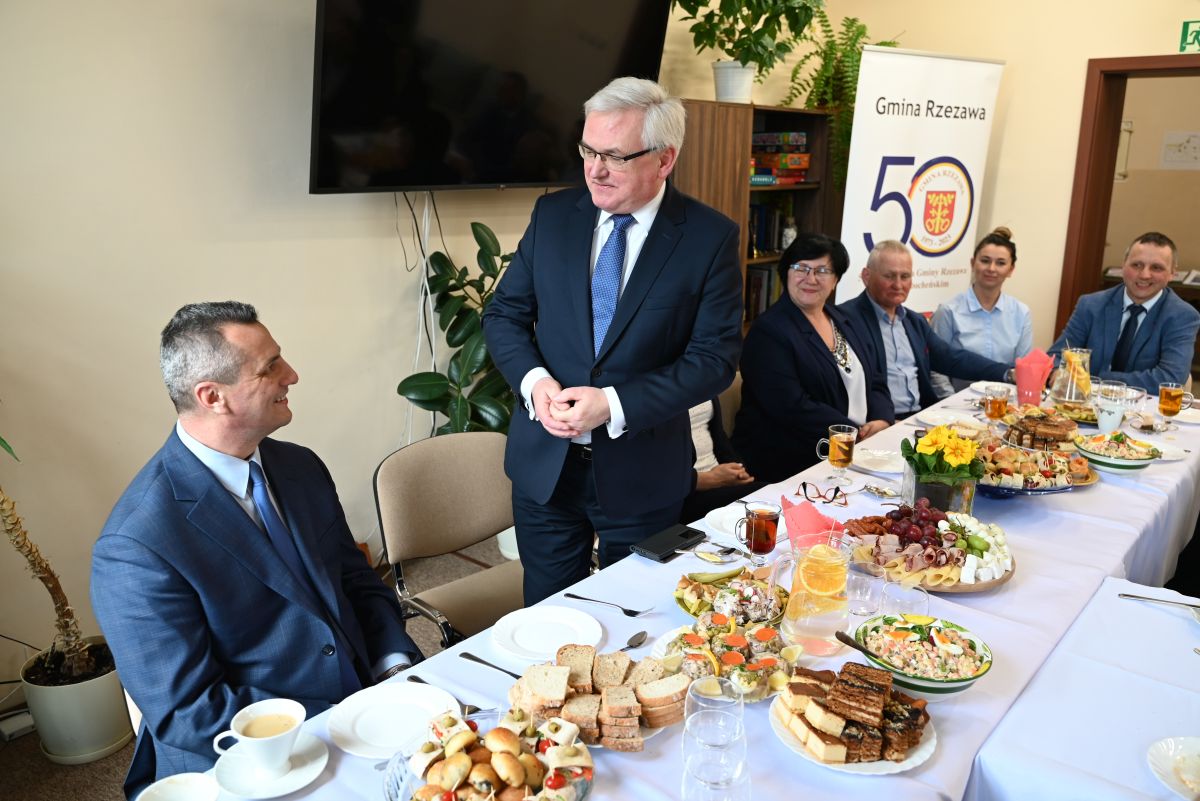 Politycy najpierw złożyli wizytę w budynku Urzędu Gminy, gdzie spotkali się z Wójtem Mariuszem Palejem. Następnie udali się do Klubu Senior+. Zostali tam bardzo ciepło przyjęci przez uczestników klubu, którzy przygotowali dla nich pyszny poczęstunek. Goście byli pod ogromnym wrażeniem tego, jak prężnie działa Klub Senior+ w Rzezawie. Na koniec swojej wizyty w Rzezawie odwiedzili oni także gminną bibliotekę.