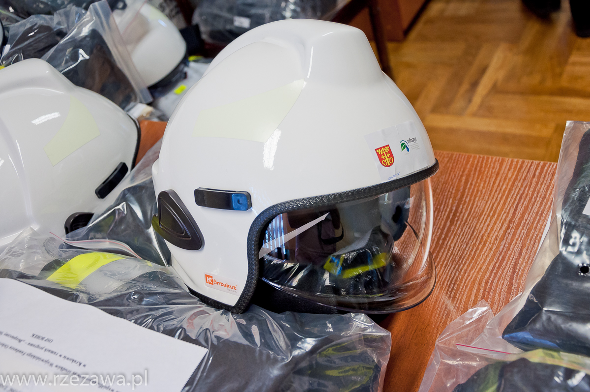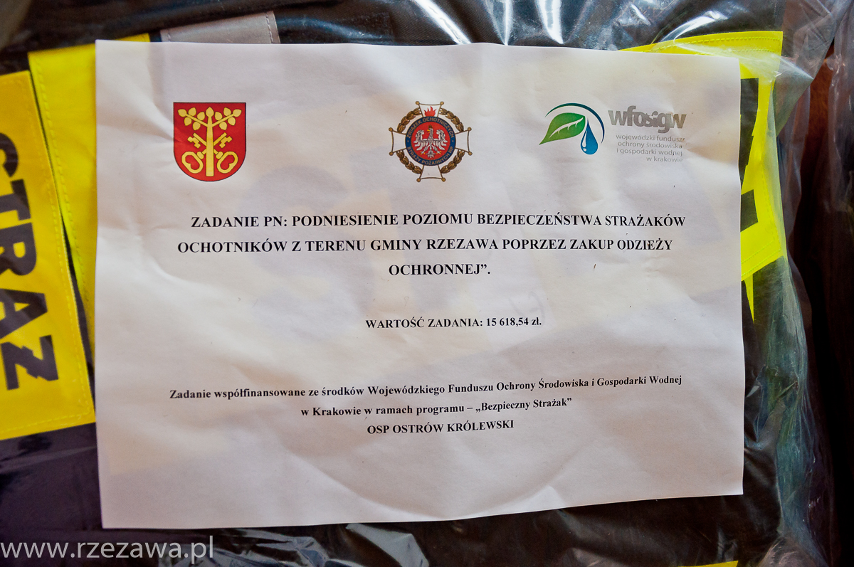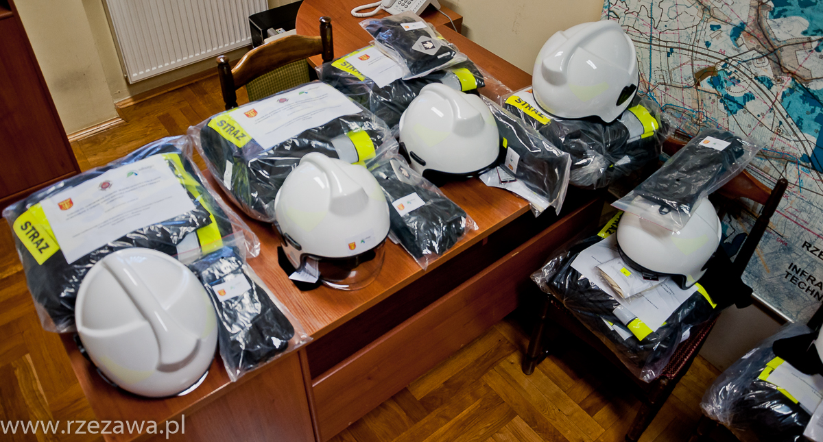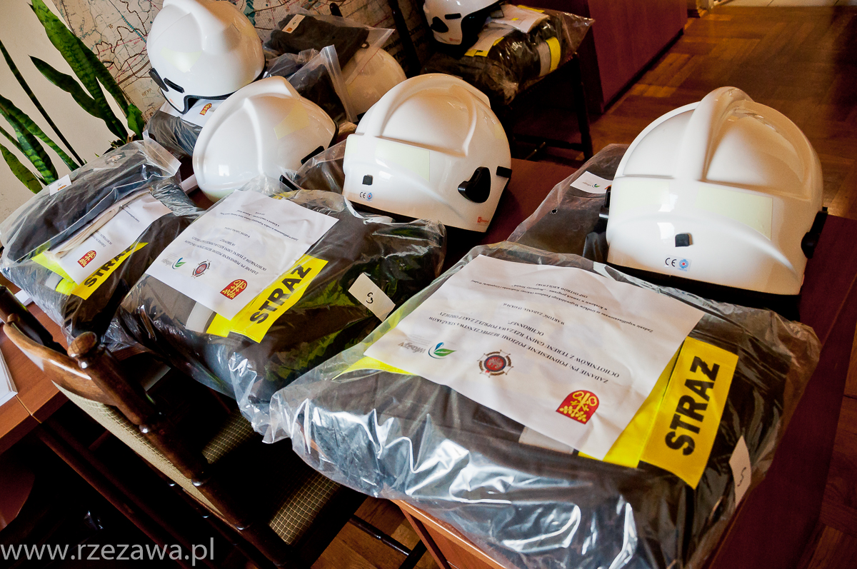po jednym komplecie profesjonalnego umundurowania bojowego zakupionego w ramach zadania „Podniesienie poziomu bezpieczeństwa strażaków ochotników z terenu gminy Rzezawa poprzez zakup odzieży ochronnej”.