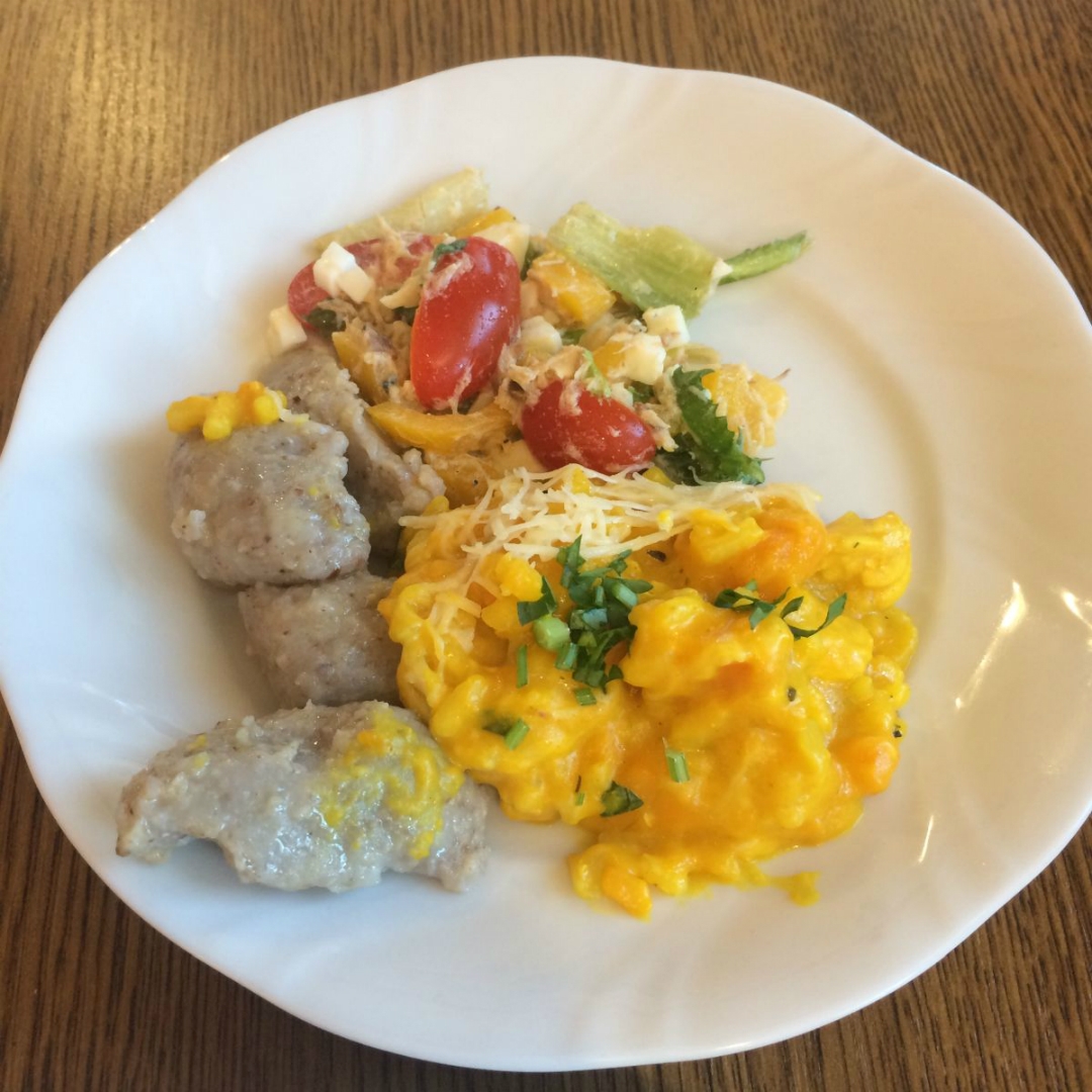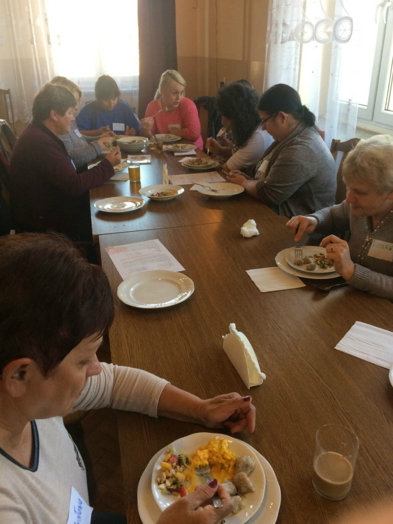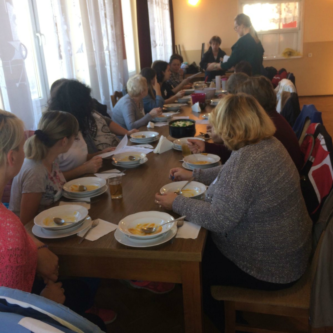 i wymianę wiedzy, spostrzeżeń, doświadczeń i poglądów. W listopadowych warsztatach uczestniczyło 17 osób z różnych grup wiekowych, a ich uczestnicy mieli możliwość przygotowania nowych, ciekawych potraw takich jak: risotto z dyni, zupę dyniową, kopytka z kaszy, sałatkę warzywną. Oczywiście nie zapomniano o deserze. Tym razem przygotowano pyszne muffinki z konfiturą.