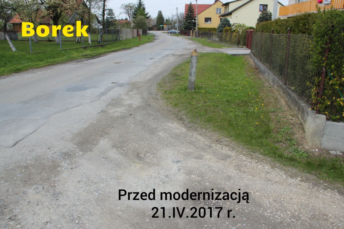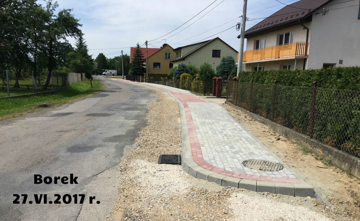 W dniu 30.VI.2017 r. dokonano odbioru końcowego budowy chodnika wzdłuż drogi gminnej ( dz. nr. 1337) tzw. „Mały Koniec” w Borku. W ramach zadania wykonano kolektor deszczowy, zamontowano studnie rewizyjne i ściekowe uliczne, poszerzono jezdnię oraz wykonano chodnik z kostki brukowej długości 90 mb. Całkowita wartość zadania wyniosła 41.427,46 zł
