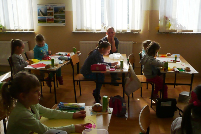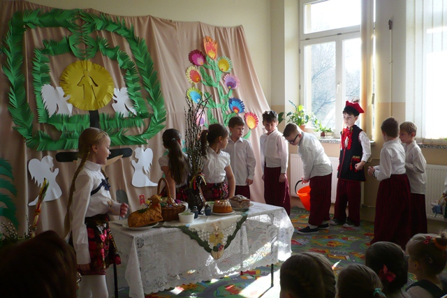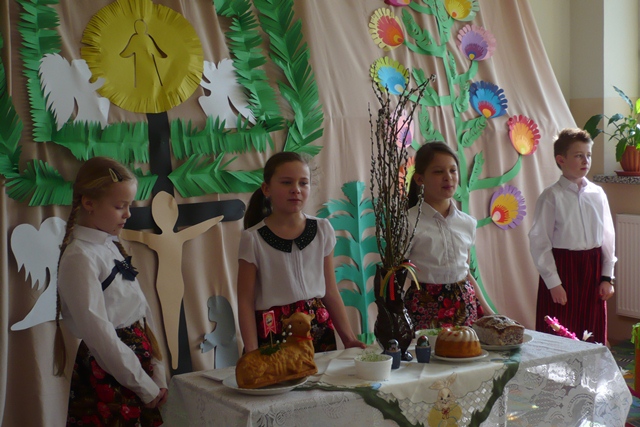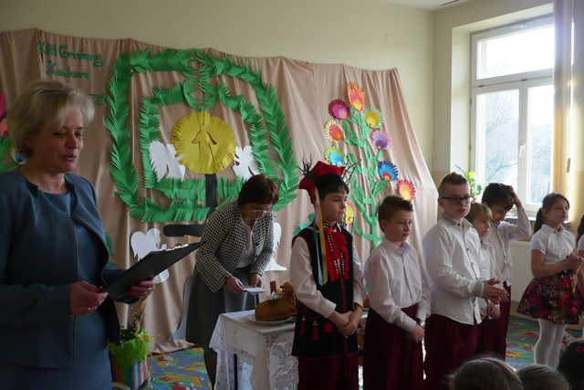 Aby umilić pobyt dzieci i rodziców przybyłych na konkurs, dzieci z klasy trzeciej przygotowane przez Panią Małgorzatę Płanetę odegrały sztukę o zwyczajach Świat Wielkanocnych. Dziękujemy artystom za piękne przedstawienie!