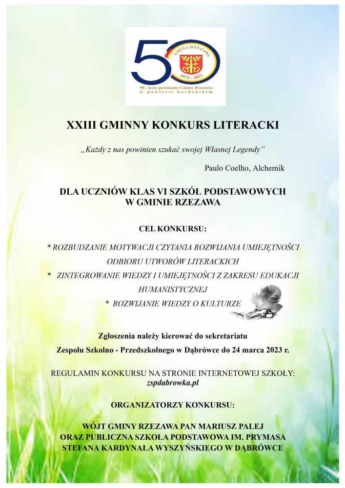 Wójt Gminy Rzezawa Mariusz Palej oraz Publiczna Szkoła Podstawowa w Dąbrówce zapraszają do uczestnictwa w XXIII Gminnym Konkursie Literackim. Więcej informacji na plakacie.