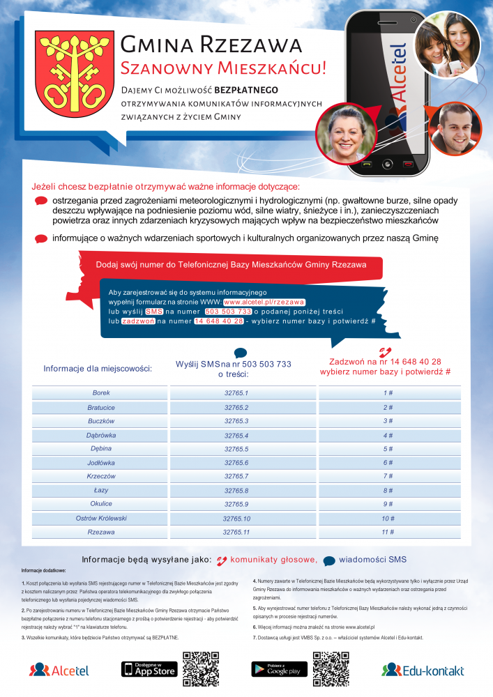 Każdy Mieszkaniec Gminy Rzezawa, który chce bezpłatnie otrzymywać bezpośrednio na swój telefon ważne informacje dotyczące różnego rodzaju zagrożeń oraz komunikaty związane z życiem Gminy może przystąpić do systemu informacyjnego Alcetel.