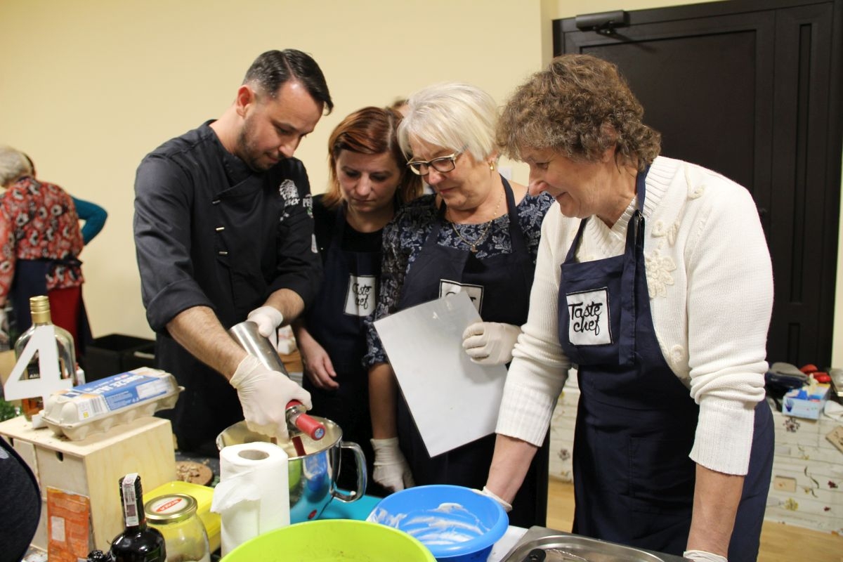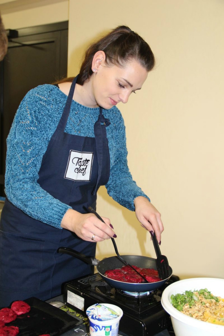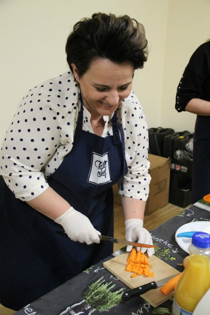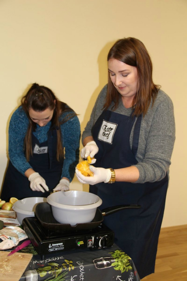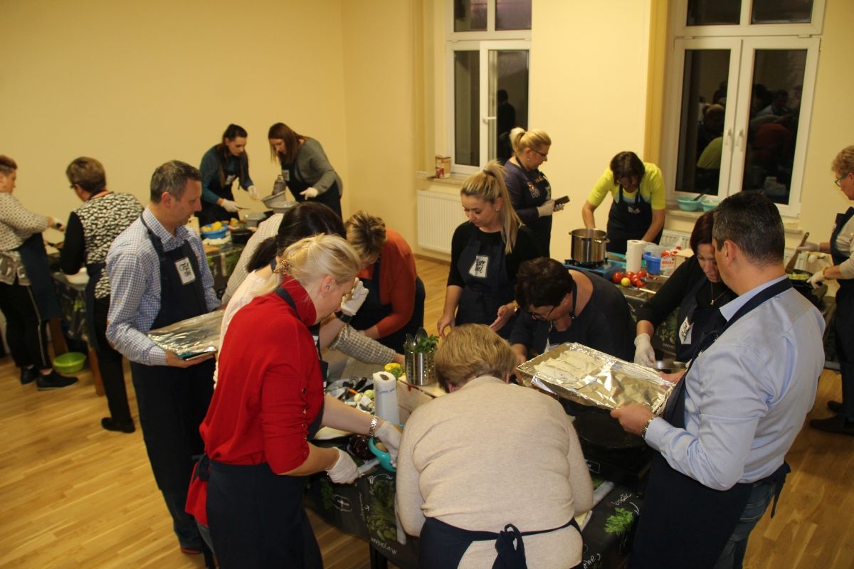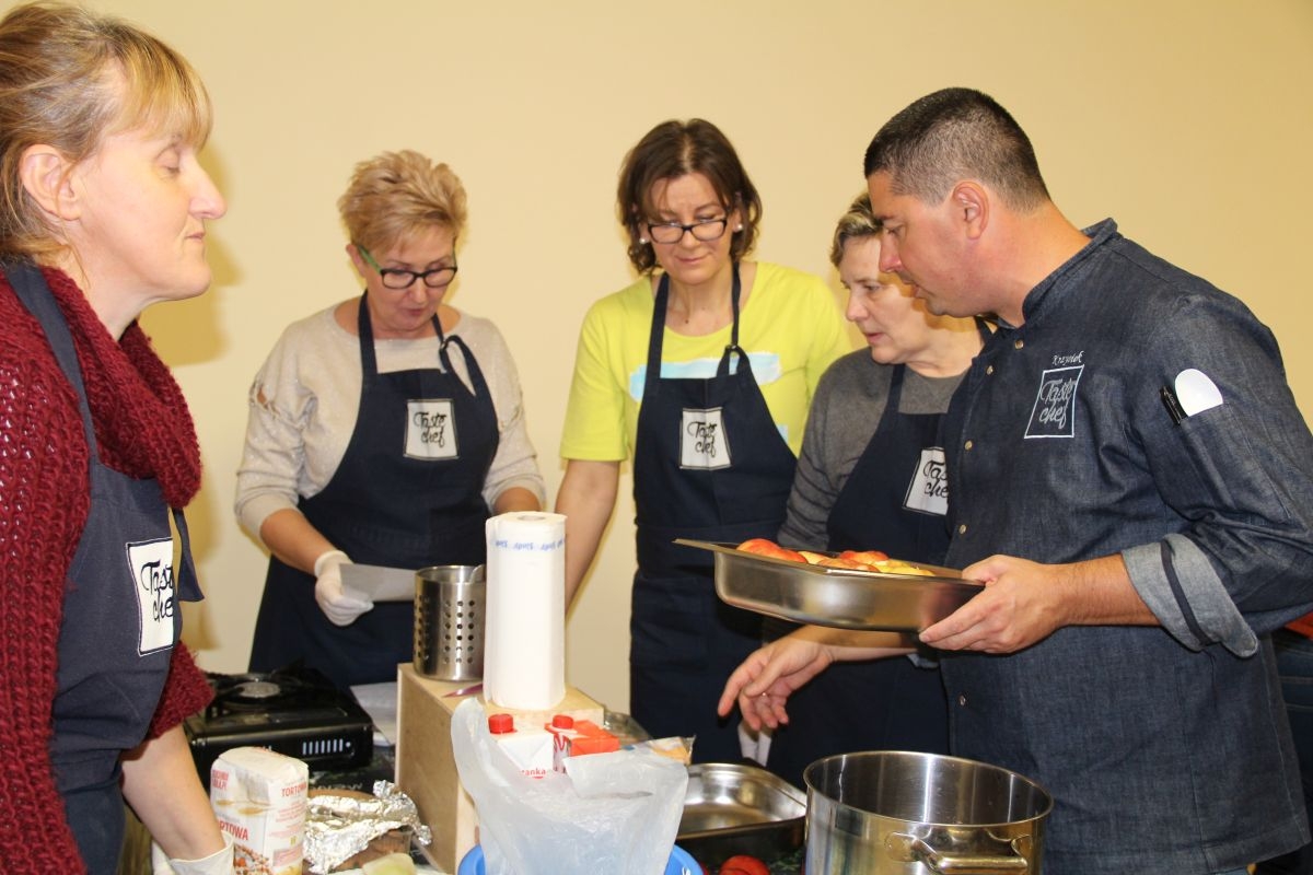 Uczestnicy podzieleni na 6 zespołów, pod czujnym okiem doświadczonych kucharzy z firmy Taste Chef Anna Odroń, Krzysztofa Odronia i Michała Sietnera, przygotowali w sumie 12 potraw. Wśród nich znalazły się m.in. bożonarodzeniowy specjał z soczystych polędwiczek, ryba po florencku, malezyjska zupa Katong laksa z dorszem i papryką, sałatka al a Waldorf, a także kilka deserów. Po kilku godzinach nauki, a przede wszystkim dobrej zabawy przygotowane tego wieczoru potrawy pojawiły się na stołach. Każdy mógł skosztować, nie tylko przez siebie przygotowanych specjałów, ale także dań przyrządzonych przez inne zespoły. Degustacja przygotowanych przystawek, zup, mięs, zapiekanek, sałatek oraz deserów okazała się ucztą dla podniebienia, podczas której uczestnicy mieli okazję poznać nowe, nieznane smaki. Na koniec uczestnicy warsztatów otrzymali przepisy na 12 potraw, które przygotowali podczas tego kulinarnego wieczoru.