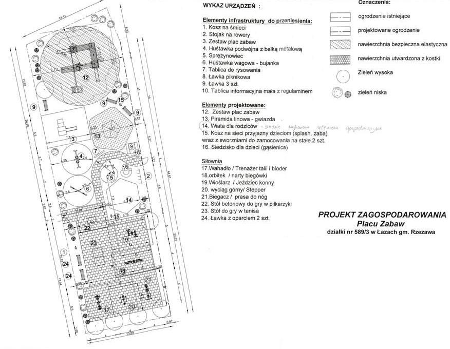 - „Budowa obiektów małej architektury w tym placu zabaw, zielonej siłowni przy zespole szkolno – przedszkolnym w Łazach wraz z infrastrukturą towarzyszącą” na działce nr 589/3 w Łazach,
