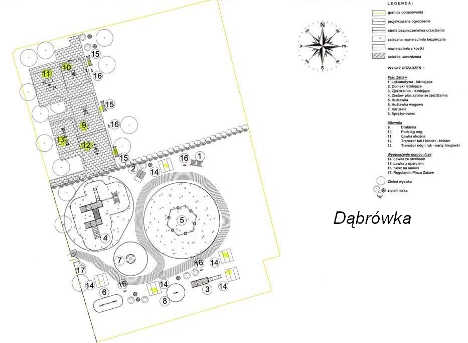 - „Zagospodarowanie terenu przy zespole szkół w Dąbrówce – infrastruktura i urządzenia do uprawiania sportu i rekreacji zewnętrznej”, obiekty małej architektury (plac zabaw i zielona siłownia) na działce nr 460/1.