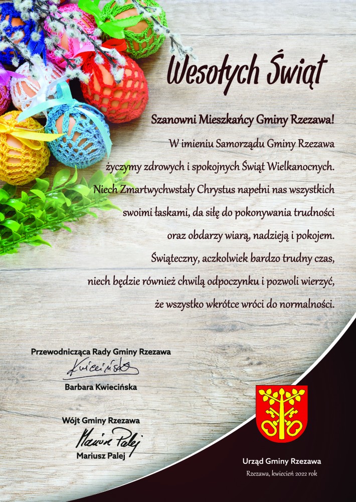 W imieniu Samorządu Gminy Rzezawa życzymy zdrowych i spokojnych Świąt Wielkanocnych. Niech Zmartwychwstały Chrystus napełni nas wszystkich swoimi łaskami, da siłę do pokonywania trudności oraz obdarzy wiarą, nadzieją i pokojem. Świąteczny, aczkolwiek bardzo trudny czas, niech będzie również chwilą odpoczynku i da nam dużo siły oraz pozwoli wierzyć, że wszystko wkrótce wróci do normalności.
