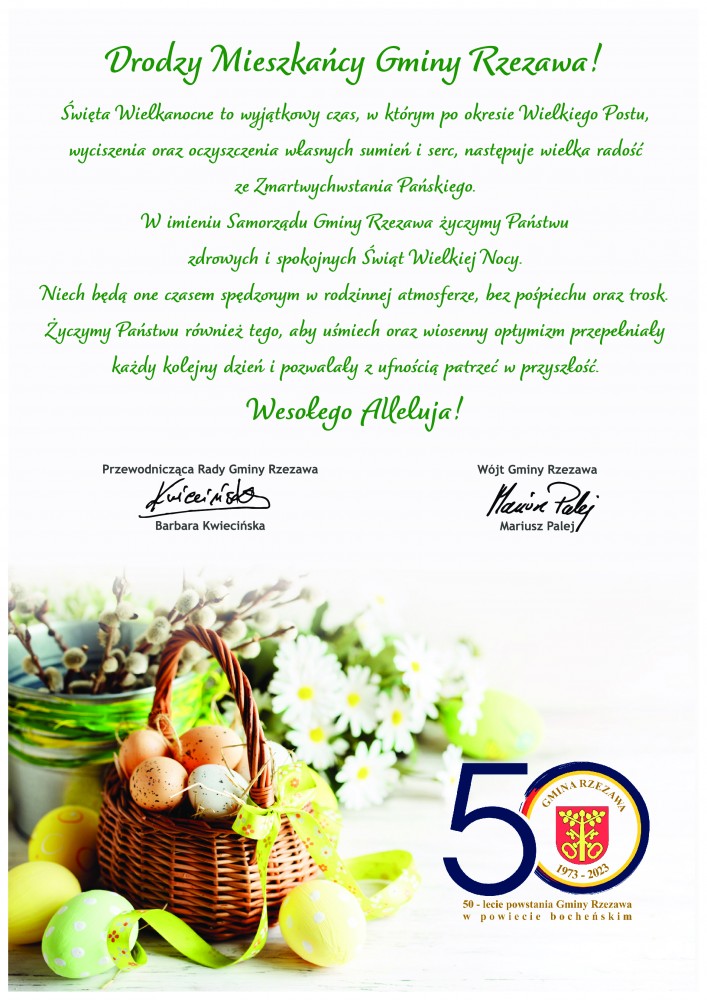 Święta Wielkanocne to wyjątkowy czas, w którym po okresie Wielkiego Postu, wyciszenia oraz oczyszczenia własnych sumień i serc, następuje wielka radość ze Zmartwychwstania Pańskiego. W imieniu Samorządu Gminy Rzezawa życzymy Państwu zdrowych i spokojnych Świąt Wielkiej Nocy. Niech będą one czasem spędzonym w rodzinnej atmosferze, bez pospiechu oraz trosk. Życzymy Państwu również tego, aby uśmiech oraz wiosenny optymizm przepełniały każdy kolejny dzień i pozwalały z ufnością patrzeć w przyszłość.
