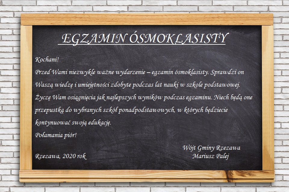 Przed Wami niezwykle ważne wydarzenie – egzamin ósmoklasisty. Sprawdzi on Waszą wiedzę i umiejętności zdobyte podczas lat nauki w szkole podstawowej. Życzę Wam osiągnięcia jak najlepszych wyników podczas egzaminu. Niech będą one przepustką do wybranych szkół ponadpodstawowych, w których będziecie kontynuować swoją edukację.
